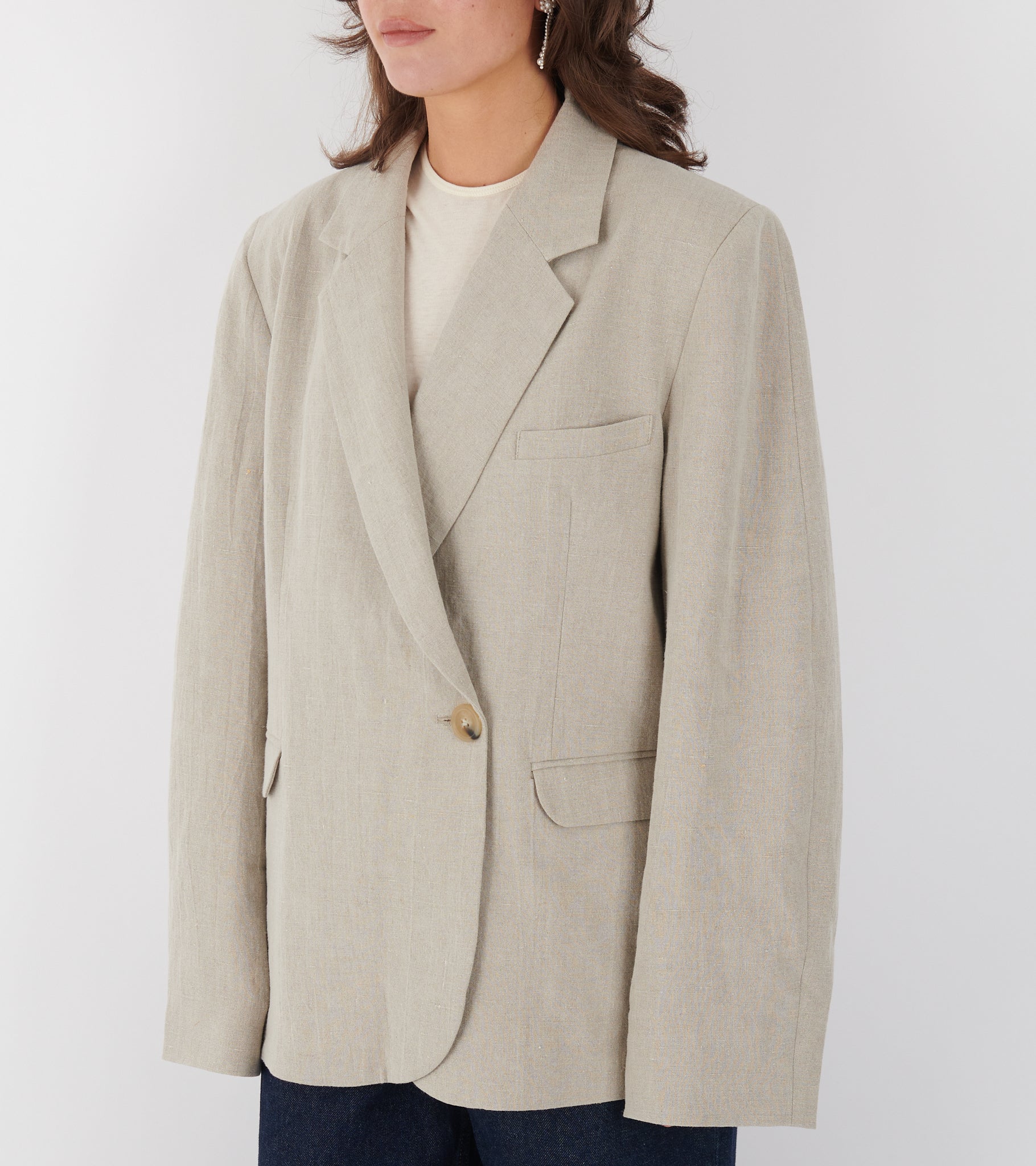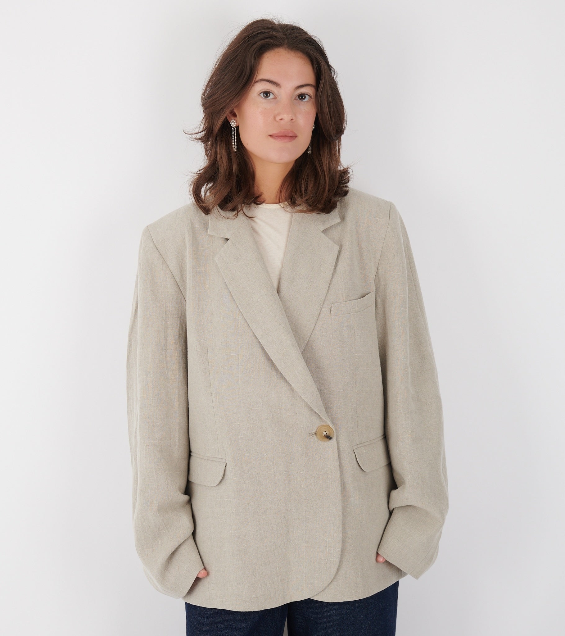 Naturfarvet blazer fra AF Agger. Linen Blazer har lommer foran samt lukkes med en enkelt knap. Denne blazer er fremstillet i hør og har en afslappet pasform.
