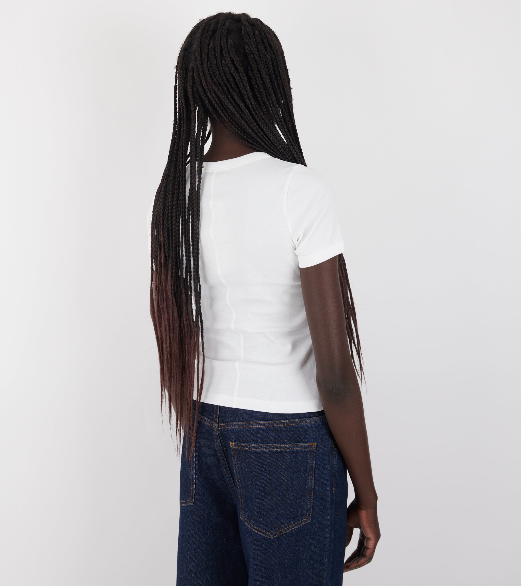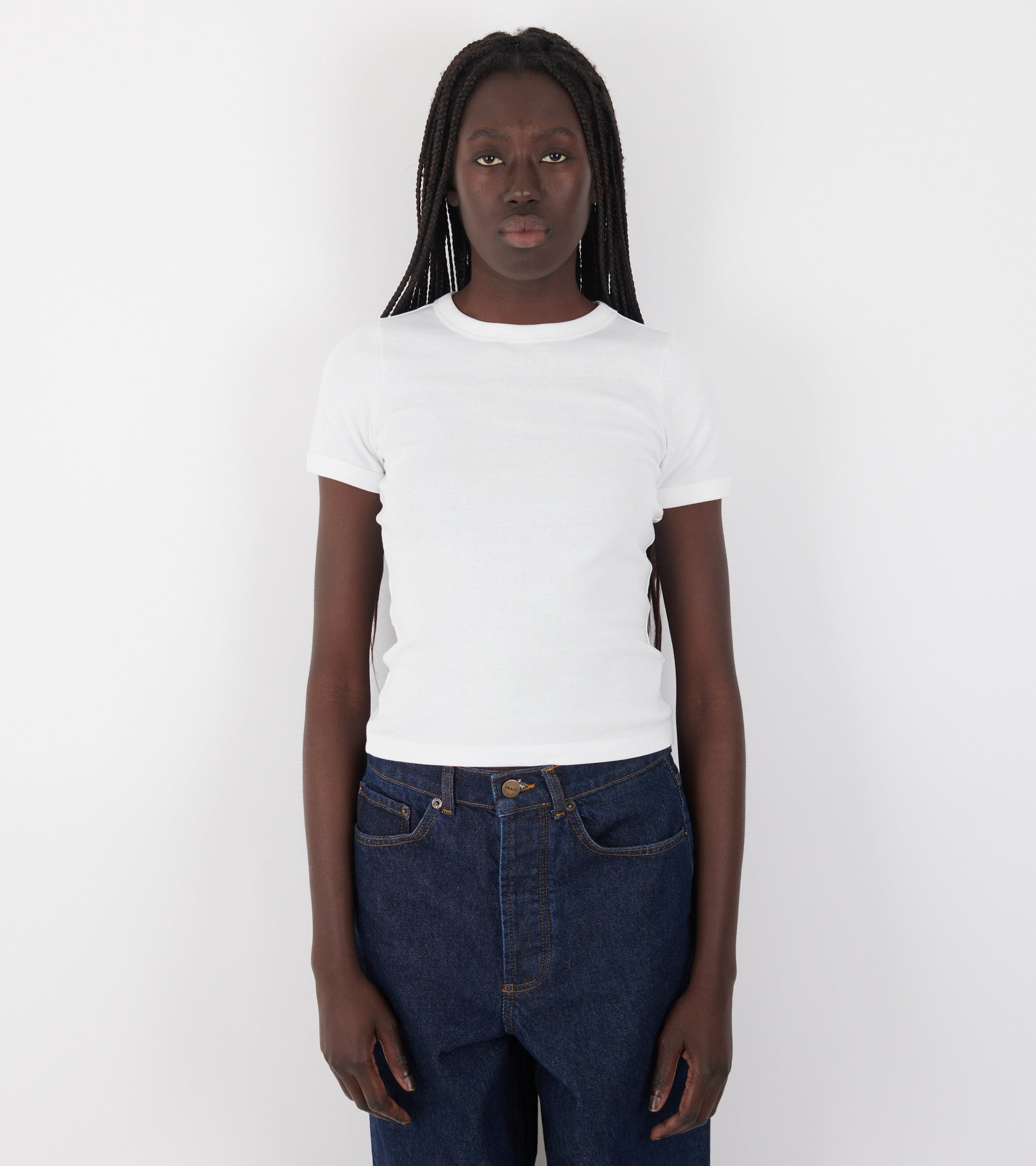 Hvid t-shirt fra Flore Flore. Car Tee er fremstillet i en 'medium weight' økologisk bomuldskvalitet og har en rund hals. Den er produceret i Portugal og har en let tætsiddende pasform.
