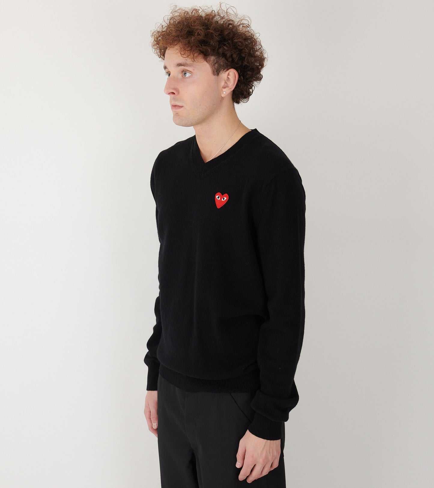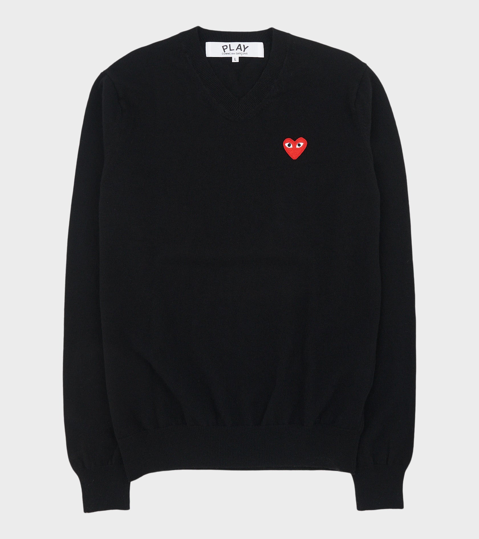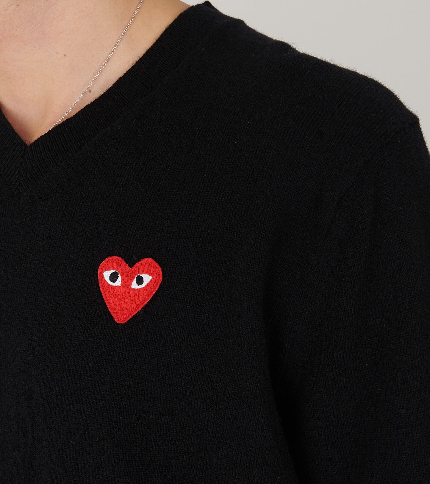 Sort unisex strik fra Comme des Garcons PLAY. Denne strik er fremstillet i uld og har en v-udskæring. Ved venstre bryst er det røde PLAY-hjerte broderet. Det ikoniske hjerte med øjnene fra PLAY er designet af Filip Pagowski og er gennemgående på alle PLAY produkter.