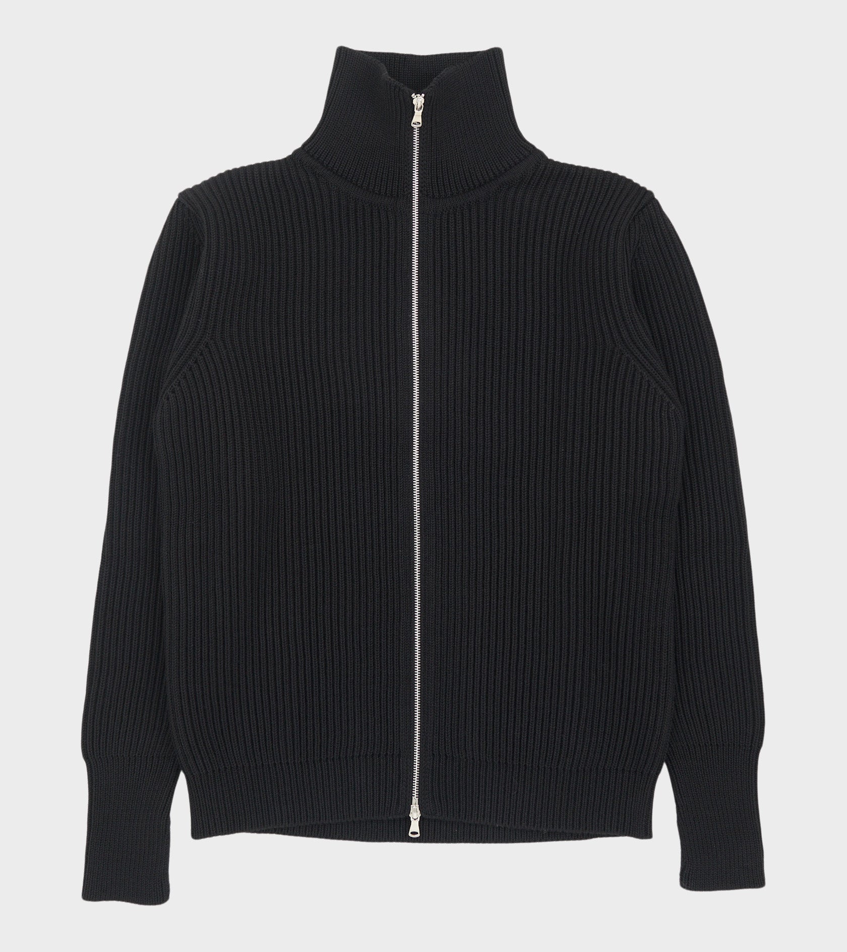 Sort strik fra Andersen-Andersen. Navy Full-zip er fremstillet i en kraftig ribstrikket jomfru uld og har en høj hals, en dobbeltgående lynlåslukning i metal, et hul til tommelfingeren og forlængede ærme-rib i enderne. Strikken er produceret i Italien og har en almindelig pasform.