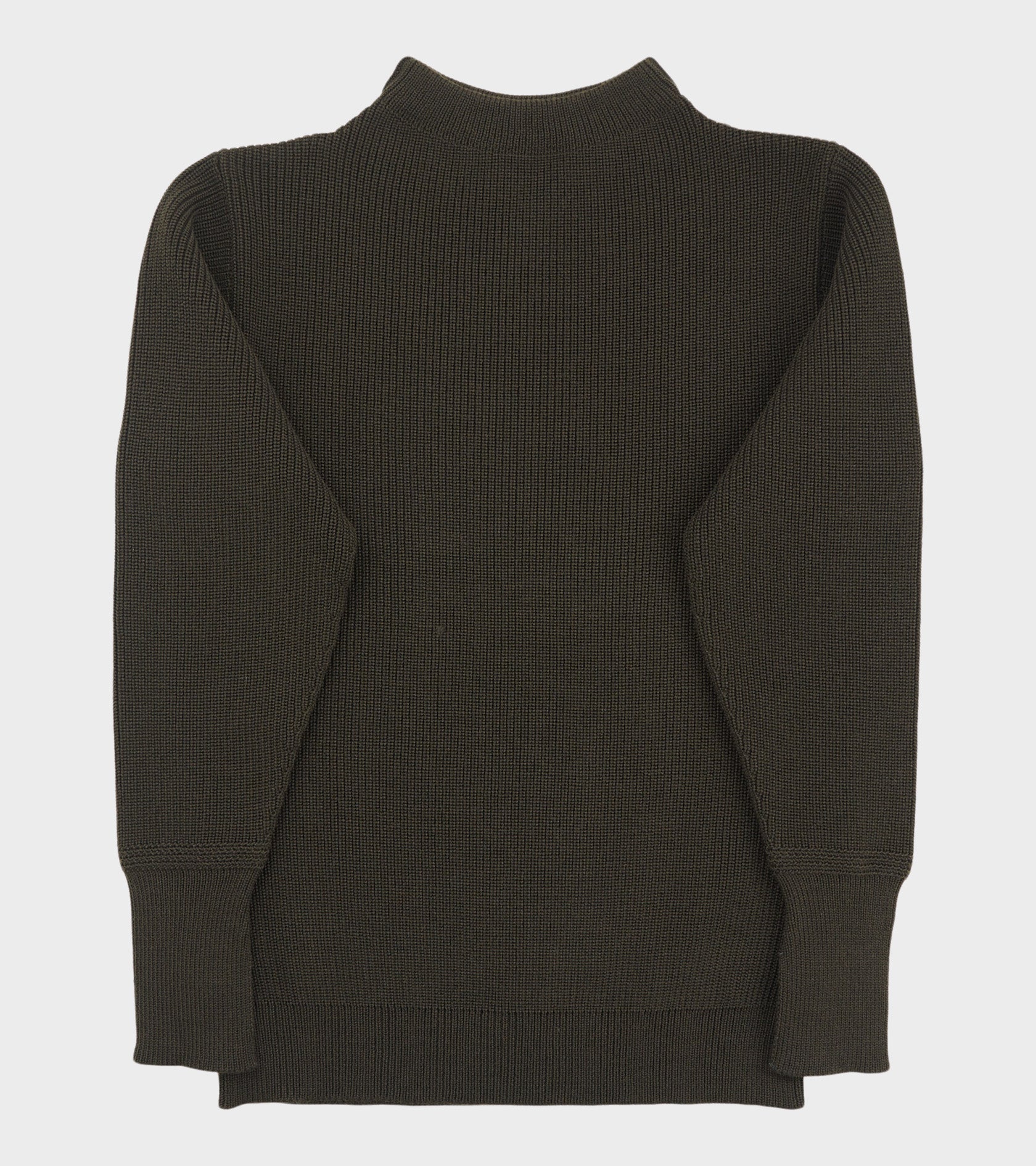 Mørk olivengrøn strik fra Andersen-Andersen. Sailor Crewneck er fremstillet i en kraftig ribstrikket jomfru uld og har en rund hals, et hul til tommelfingeren og forlængede ærme-rib i enderne. Strikken er produceret i Italien og har en almindelig pasform.