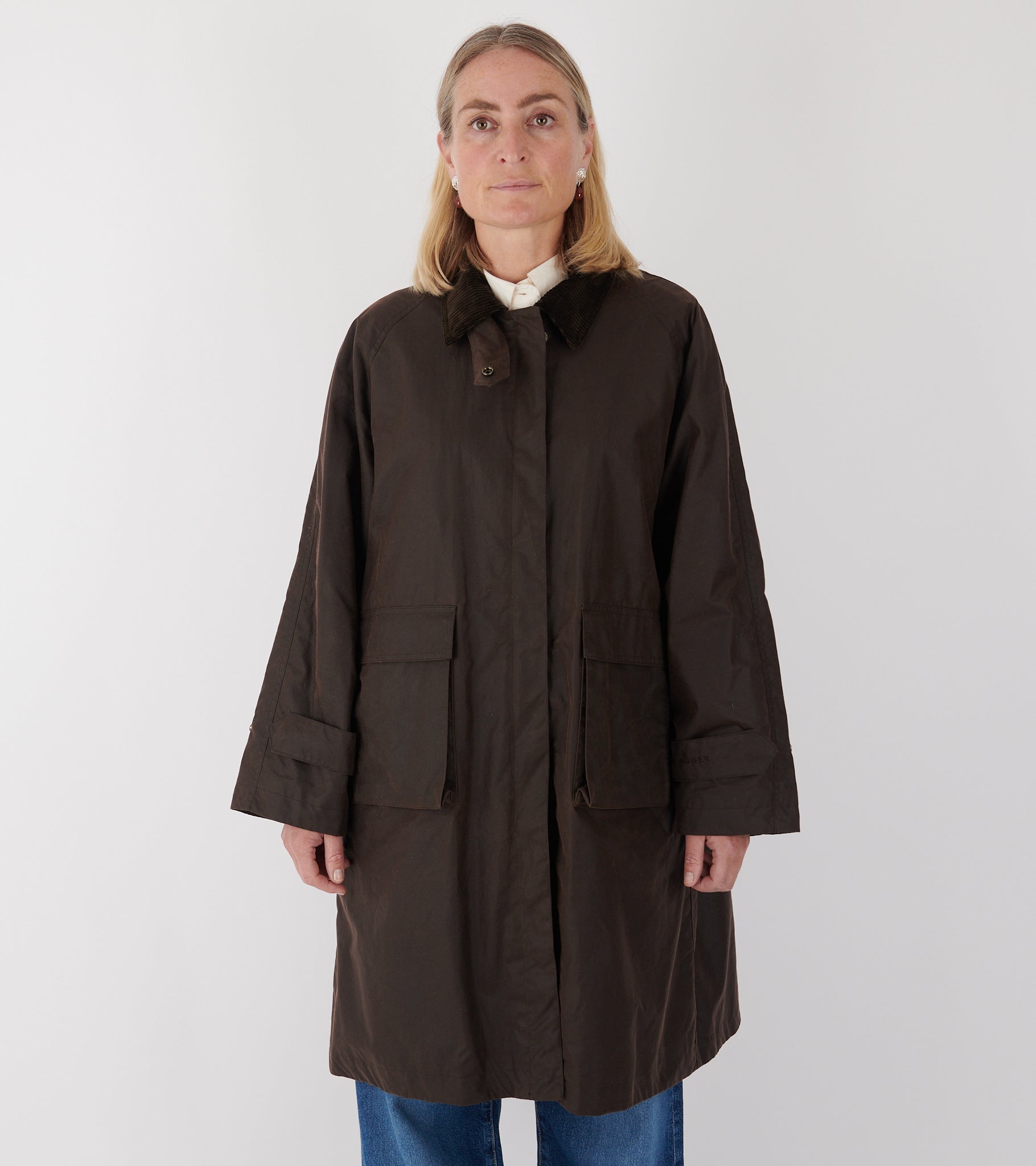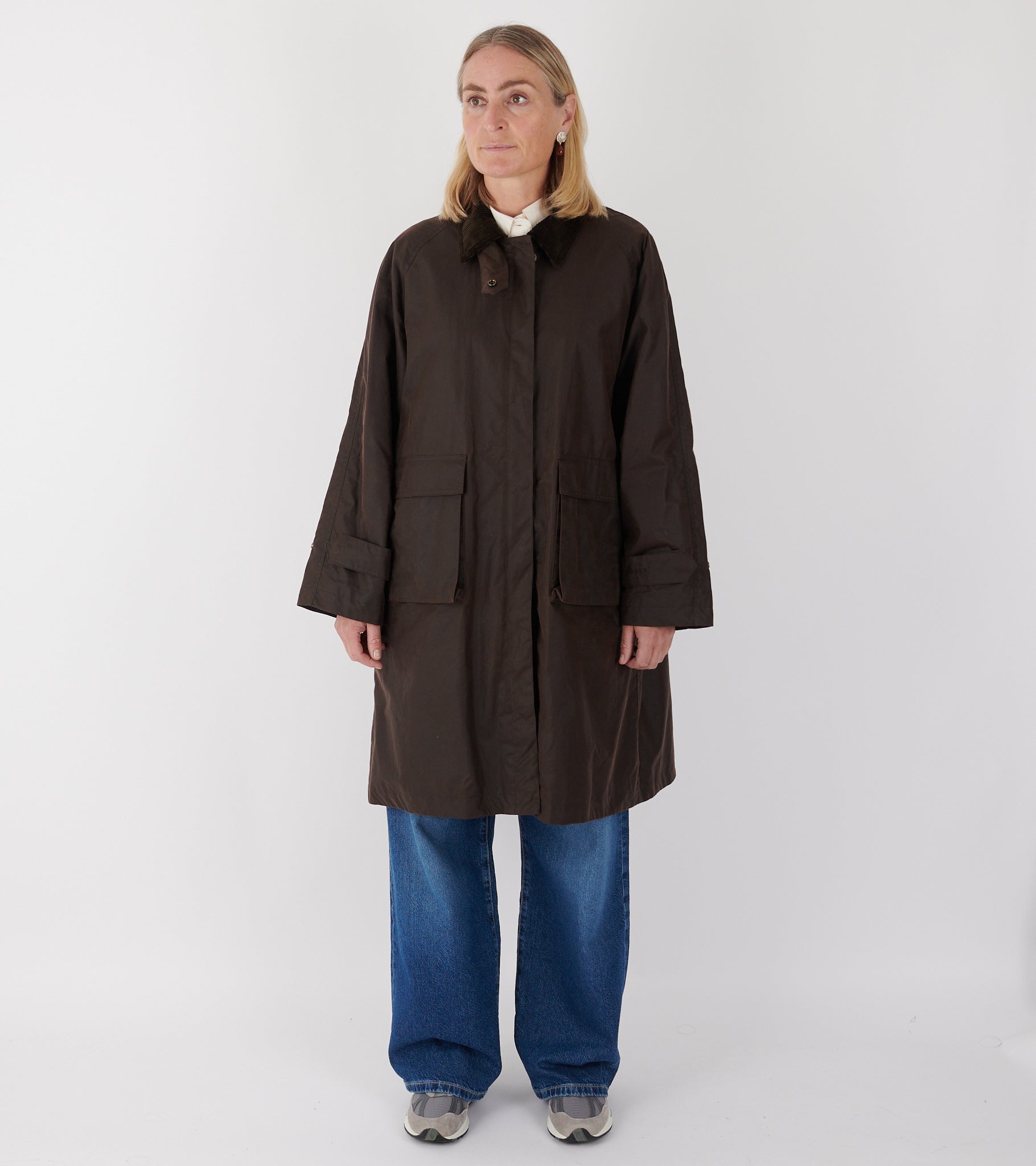 Brun frakke fra AF Agger. Denne jakke er fremstillet i 'oilskin' bomuld fra England og er foret med uld på indersiden. Frakken har en klassisk krave i brunt bomuldsfløjl, en skjult lynlås- og knaplukning, to lommer på fronten samt strop-detaljer på ærmerne. Frakken har en afslappet pasform.