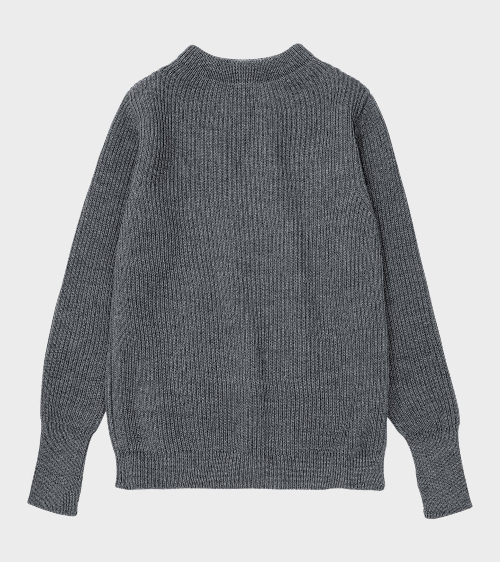 Grå strik fra Andersen-Andersen. Navy Crewneck er fremstillet i en kraftig ribstrikket jomfru uld og har en rund hals, et hul til tommelfingeren og forlængede ærme-rib i enderne. Strikken er produceret i Italien og har en almindelig pasform.