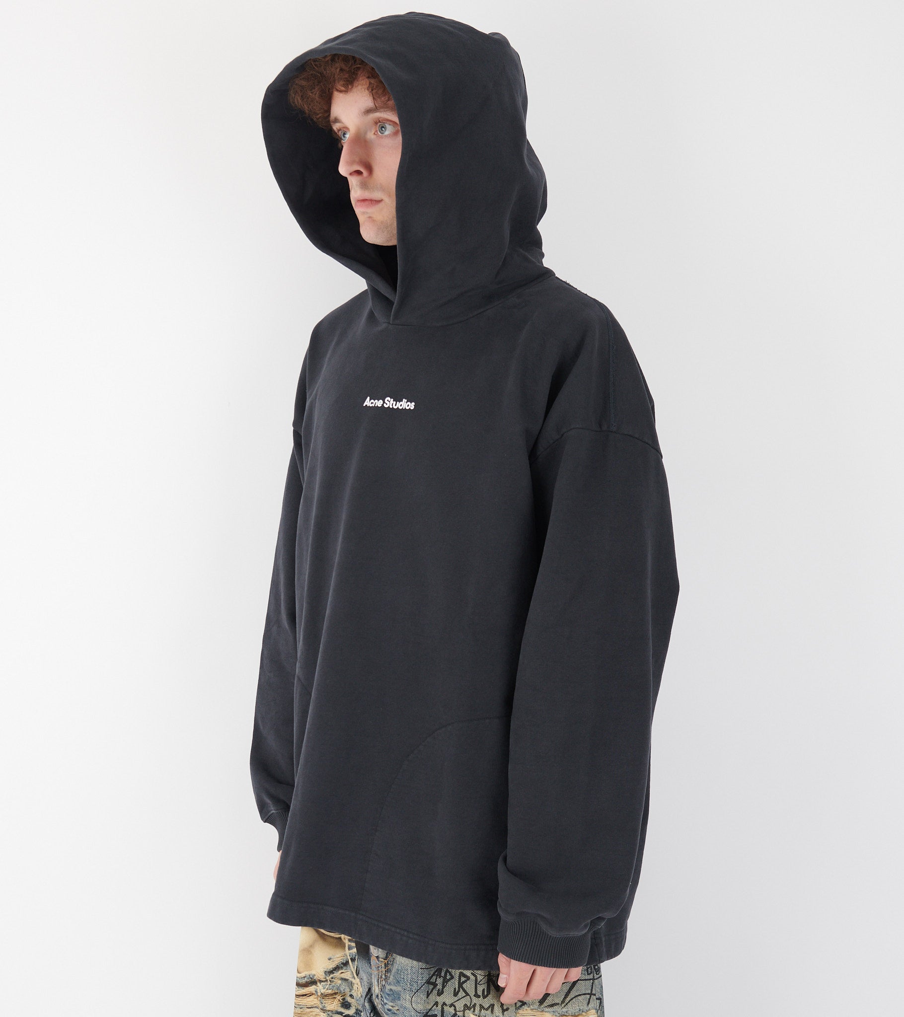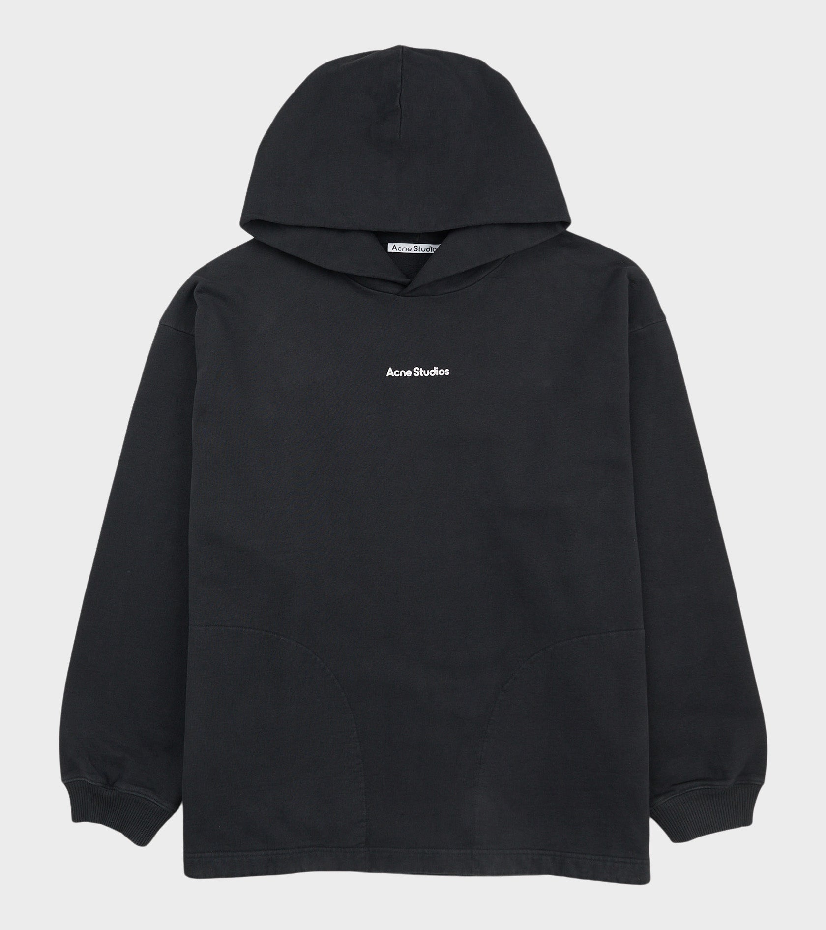 Sort hættetrøje med et hvidt printet logo på fronten fra Acne Studios. Hættentrøjen har en klassisk hætte og en lomme i hver side.