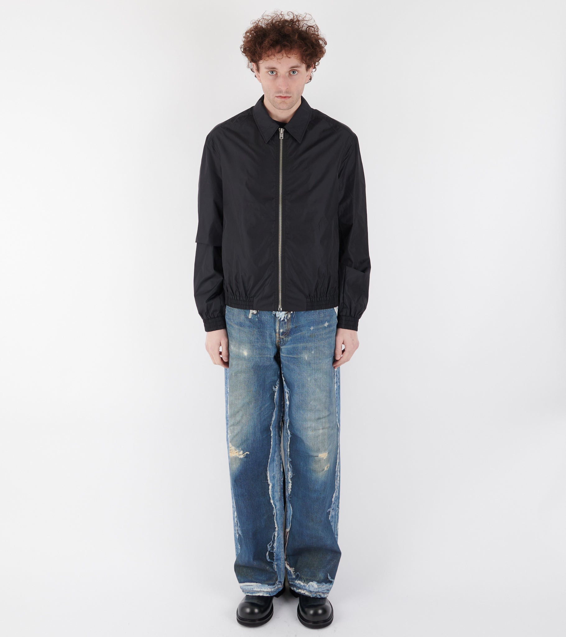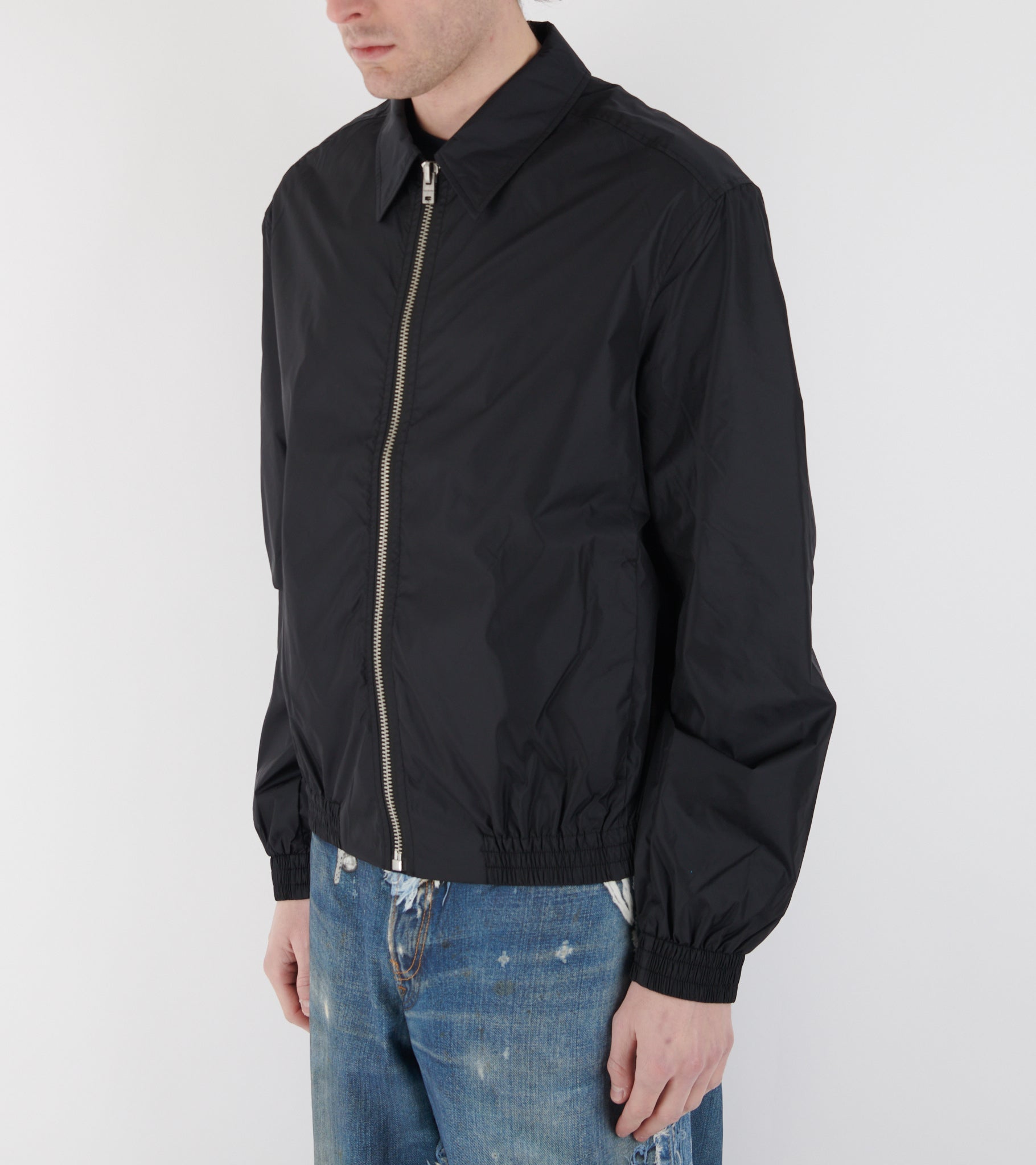 Sort jakke med logoprint fra Acne Studios. Jakken er fremstillet i genanvendt nylon med en semi-shiny finish. Den har en klassisk krave, en dobbeltgående lynlåslukning, elastik i enderne samt en skrålomme i hver side.