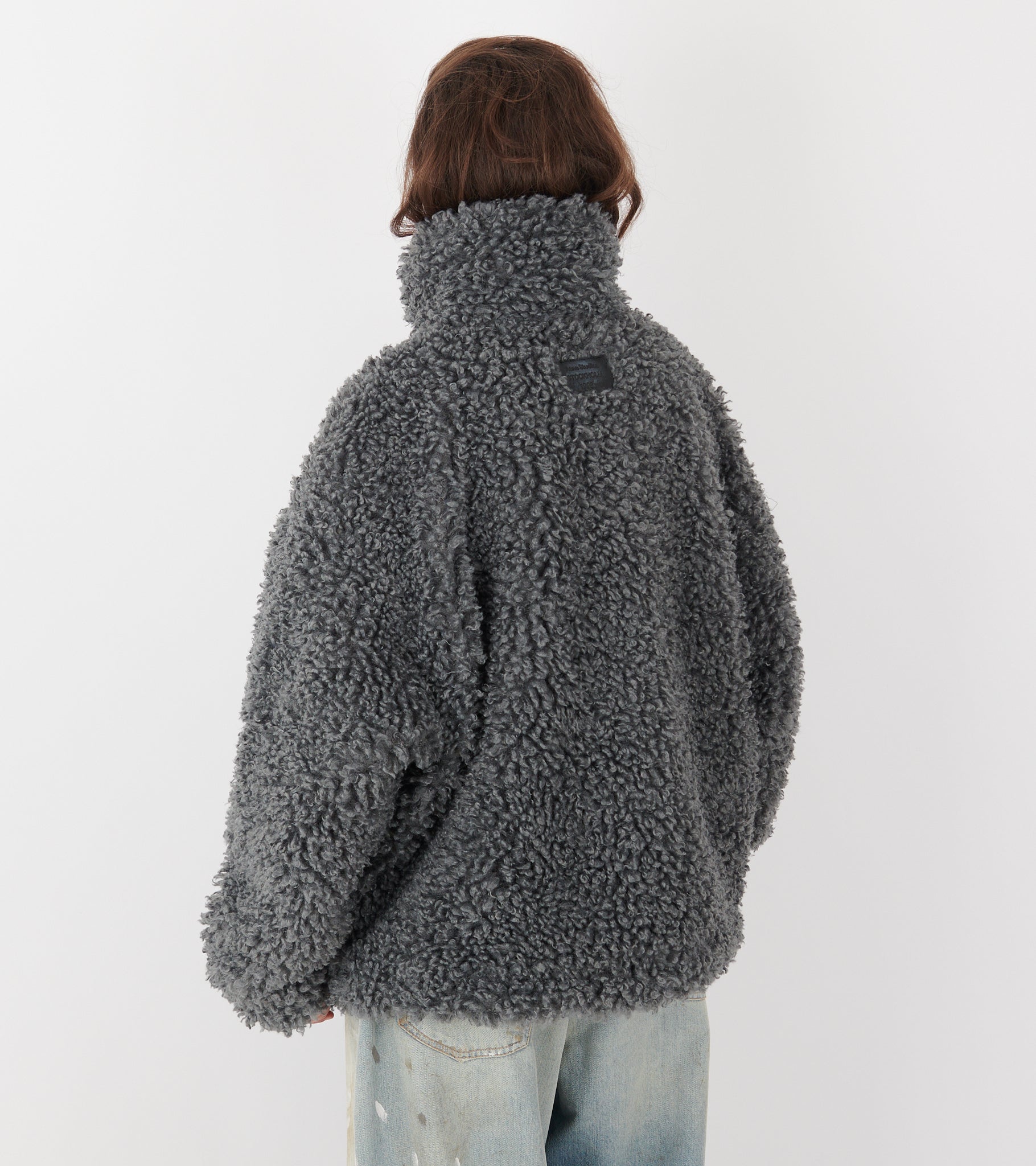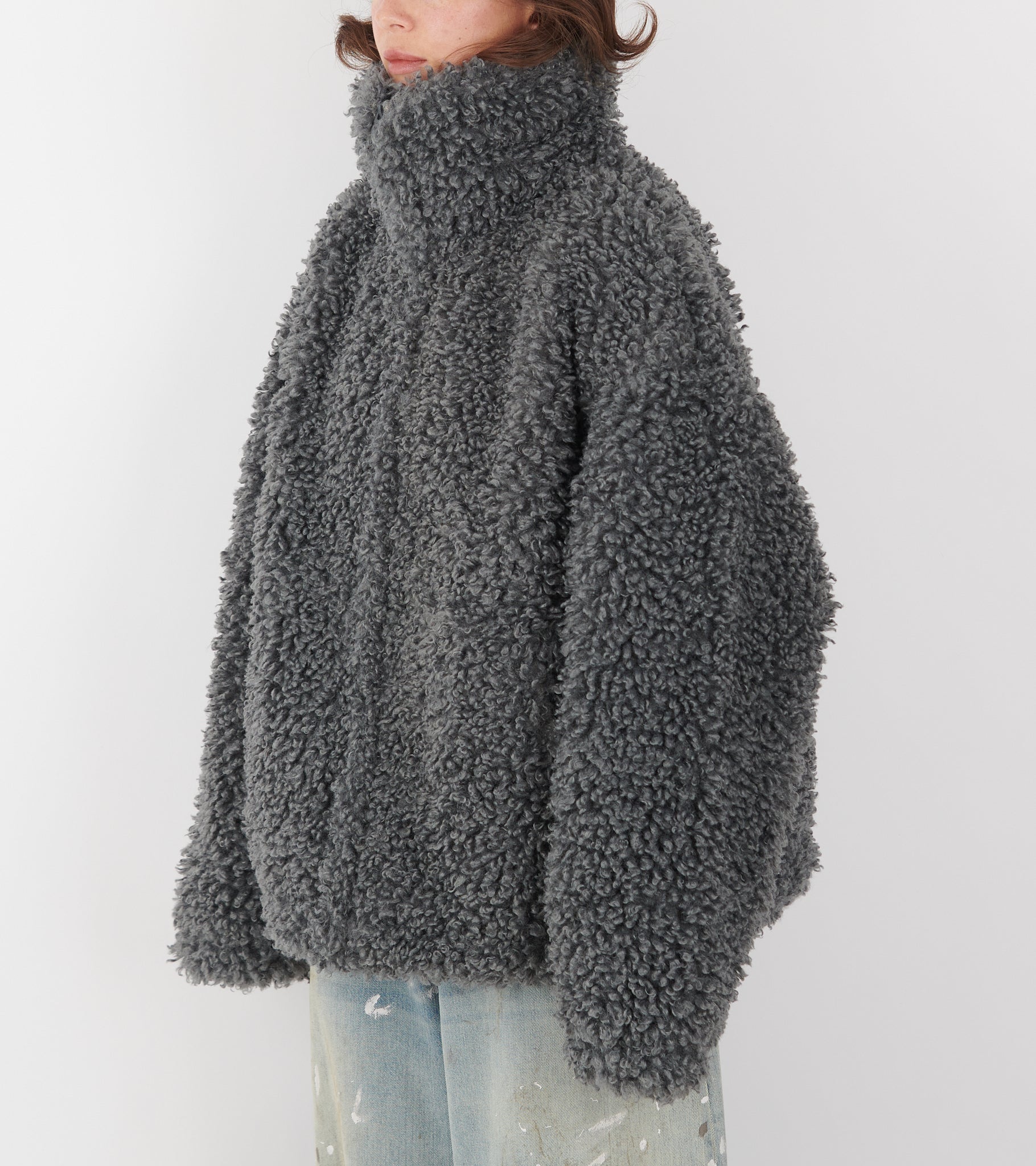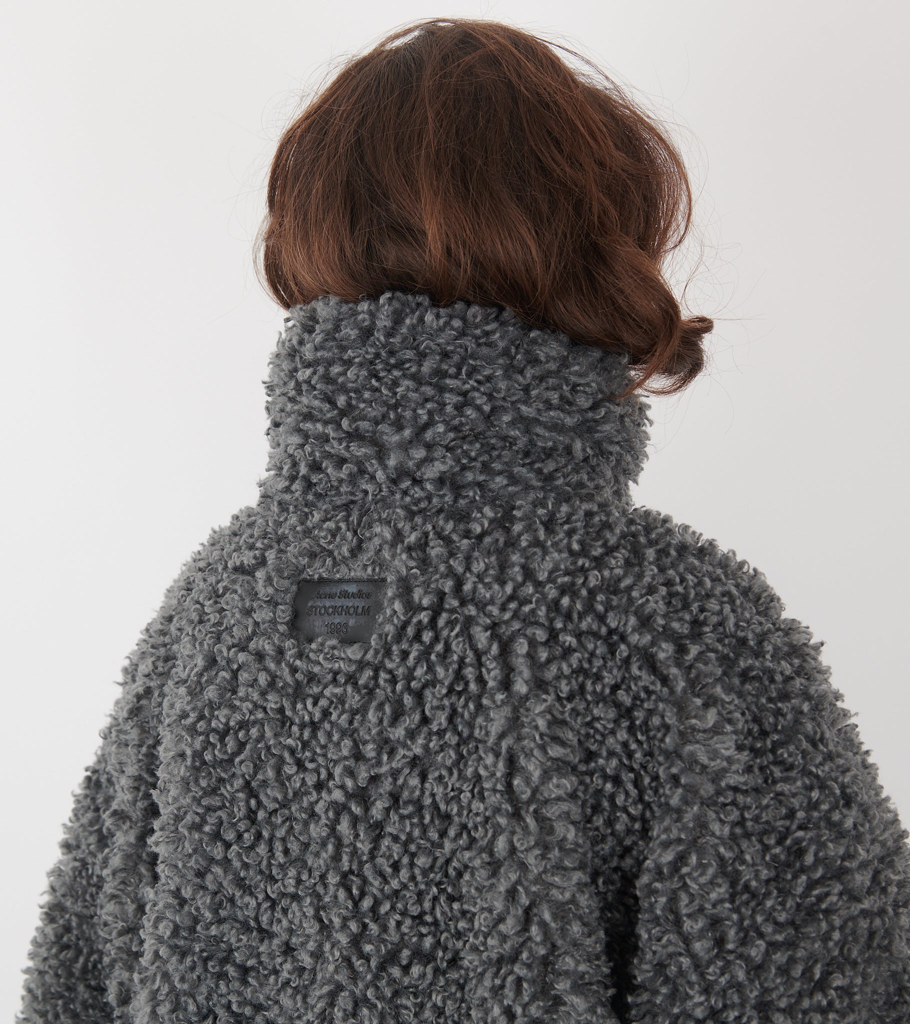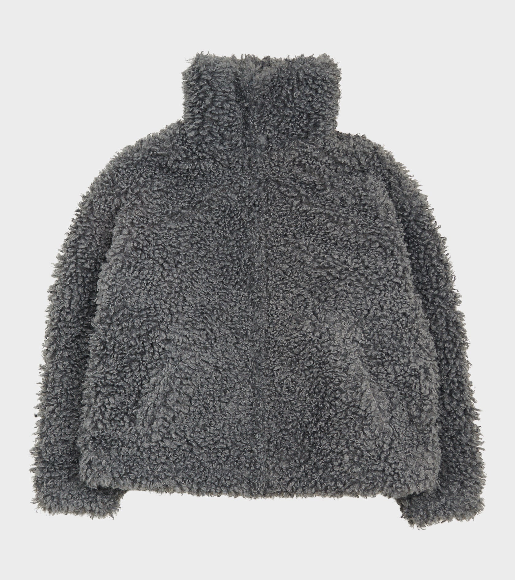 Mørkegrå jakke i krøllet faux fur fra Acne Studios. Jakken har en høj hals, en lynlåslukning og en skrålomme i hver side. Øverst bagpå er et sort logotag i læder.