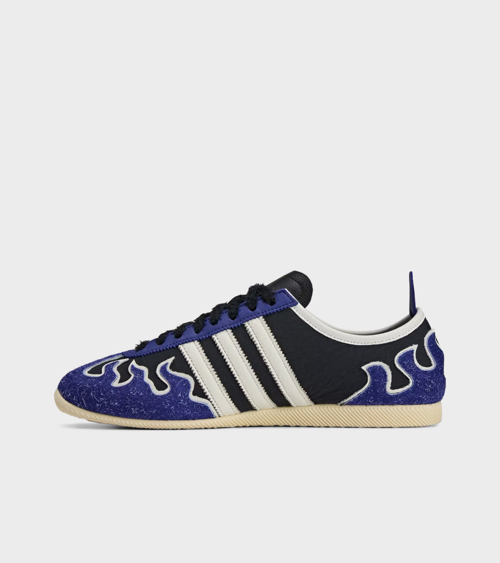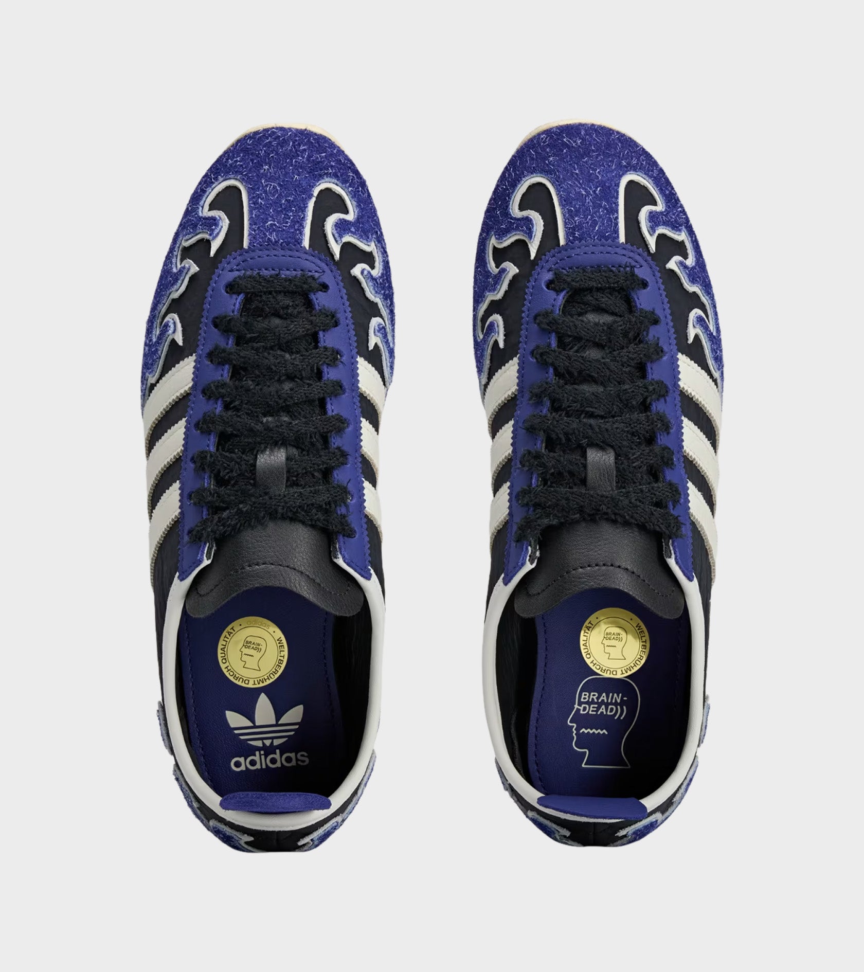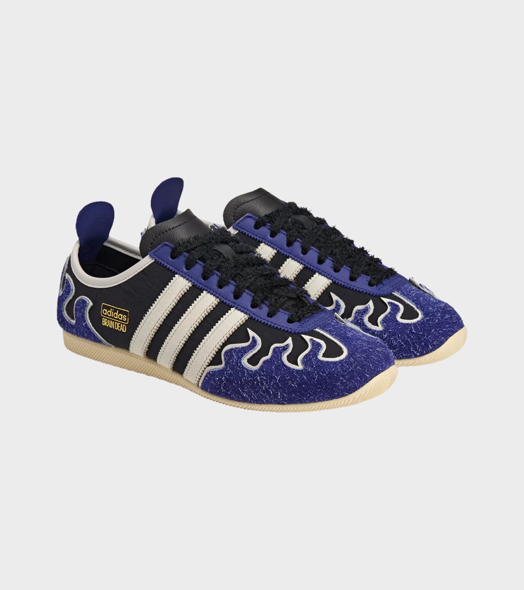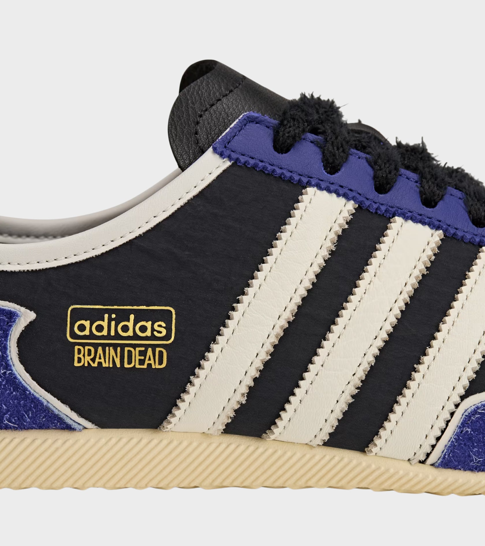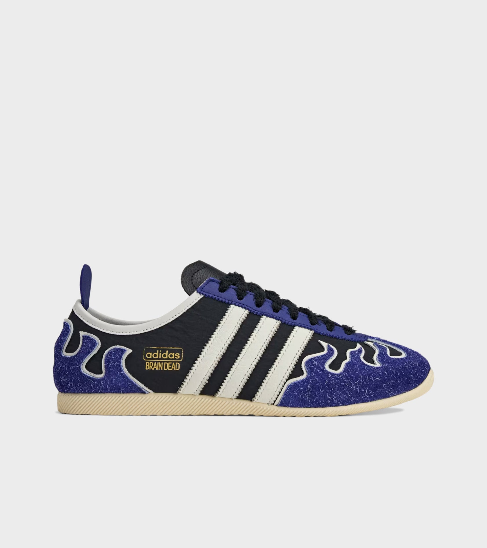 Sorte sneakers med blå/lilla og hvide detaljer fra samarbejdet mellem Adidas og Brain Dead. Japan modellen fra Adidas er en relancering af en sneaker fra 1964, der var med i et katalog til årets globale sportsbegivenhed i Japan.