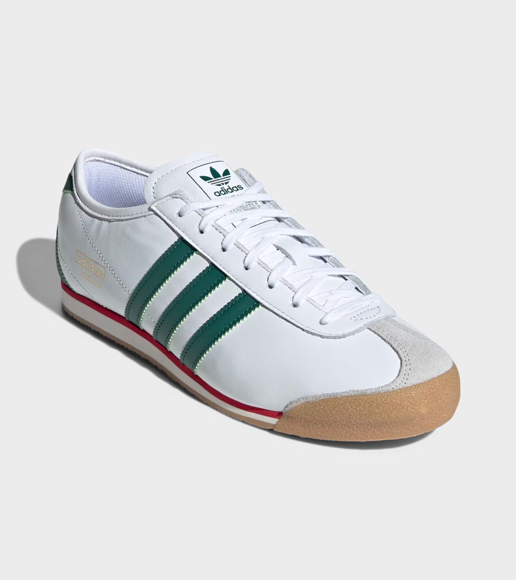 Italia 70s fra Adidas. Disse sneakers har en overdel i hvidt læder samt overlays i ruskind og detaljer i mørkegrøn og rød. På siden er de ikoniske striber samt 'Adidas' og 'Italia' printet i guld. Sålen er fremstillet i ufarvet gummi.