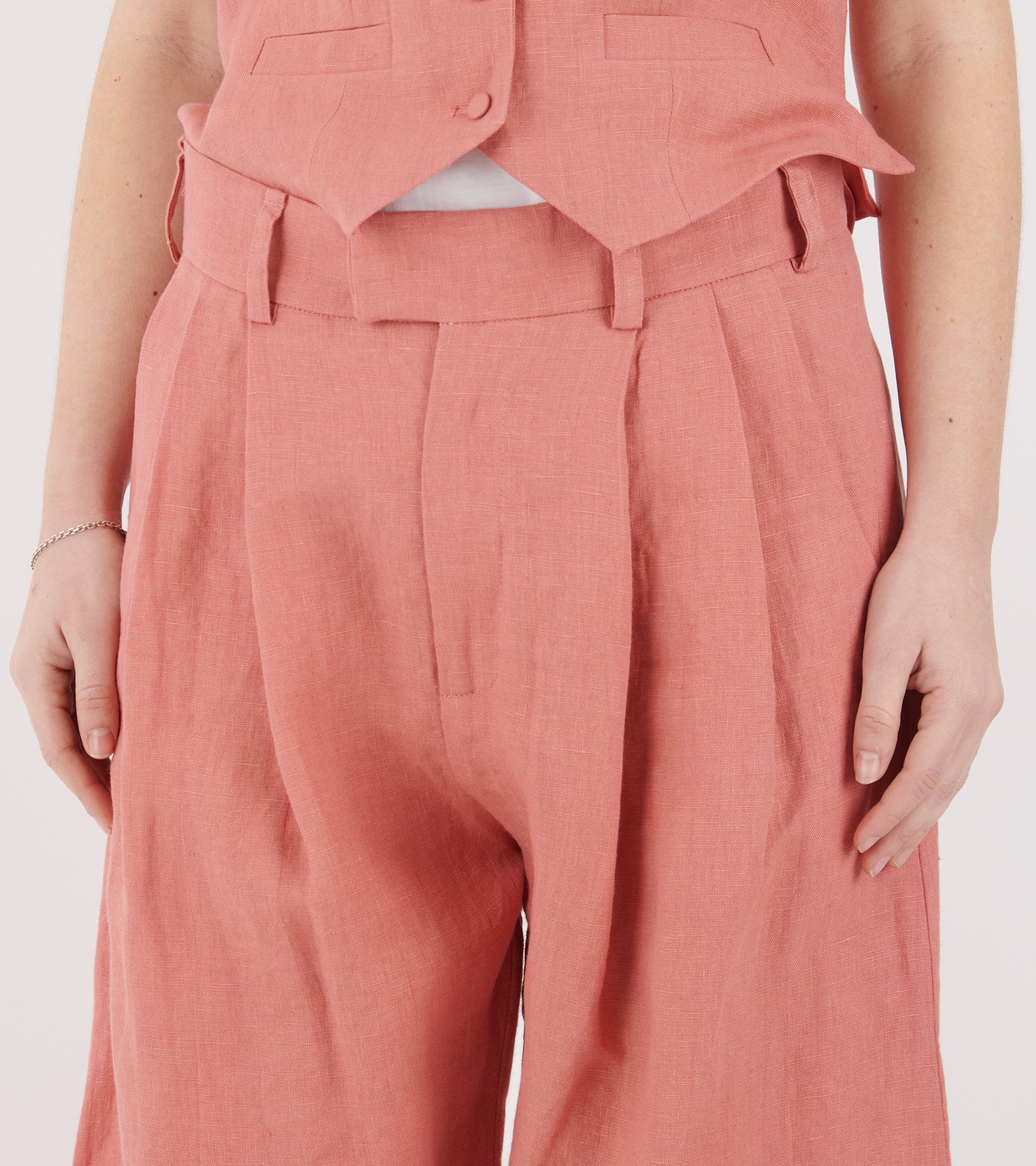 Bukser i hør fra AF Agger. Bukserne har brede ben, bæltestropper, en skjult spændelukning, en skrålomme i hver side og en enkelt stiklomme bagpå. Bukserne har læg øverst på fronten.