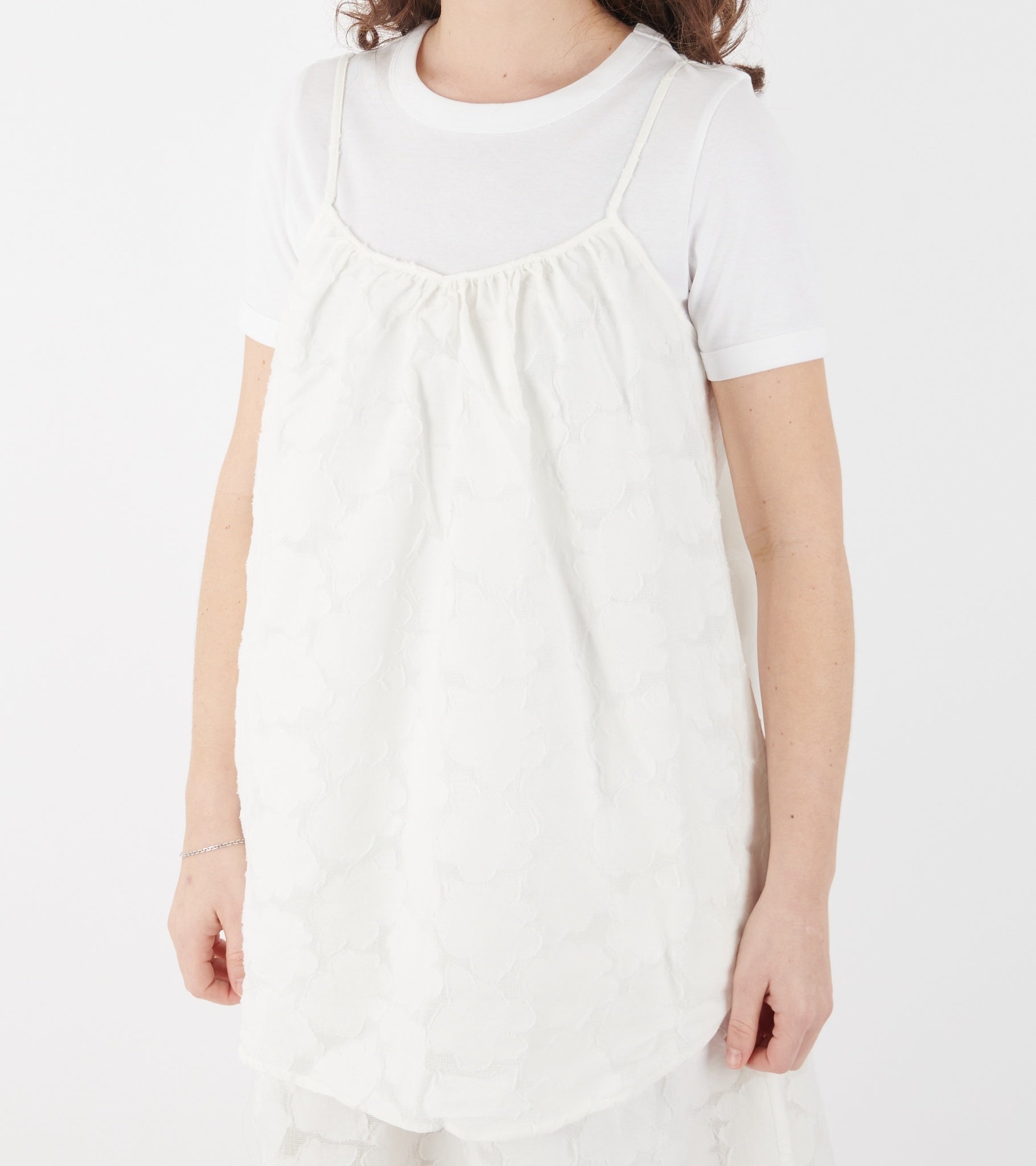 Hvid top i en blomstret jacquard kvalitet fra Aiayu. Toppen har tynde justerbare stropper, rynkedetaljer, en lille v-udskæring på fronten samt en bindebåndsdetalje bagpå.