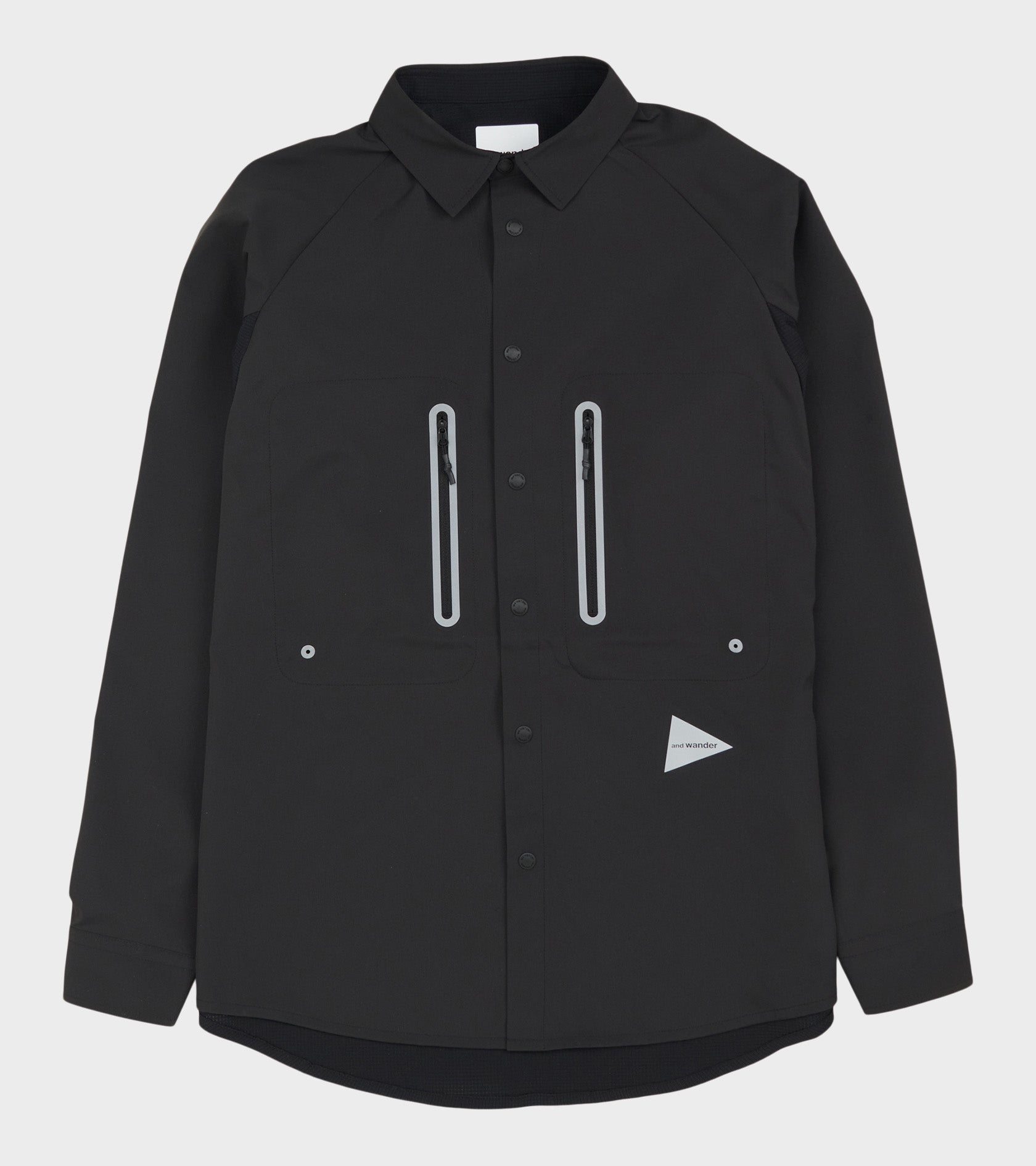 Sort skjorte i en 'lightweight' polyesterkvalitet fra And Wander. Skjorten har en klassisk krave og en knaplukning med sorte logo-trykknapper. På fronten er refleksdetaljer, to lynlåslommer samt et refleks-logo. Ryggen er fremstillet i en åndbar stretch-kvalitet.