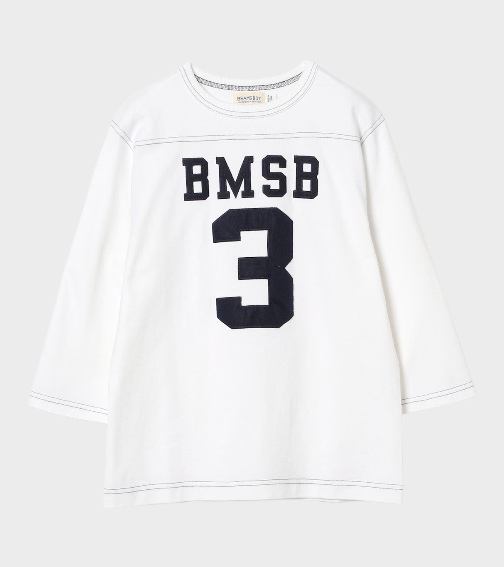 Hvid t-shirt med 3/4 lange ærmer fra Beams Boy. Denne t-shirt har en rund hals, synlige navy syninger samt print i mørk navy filt på fronten.