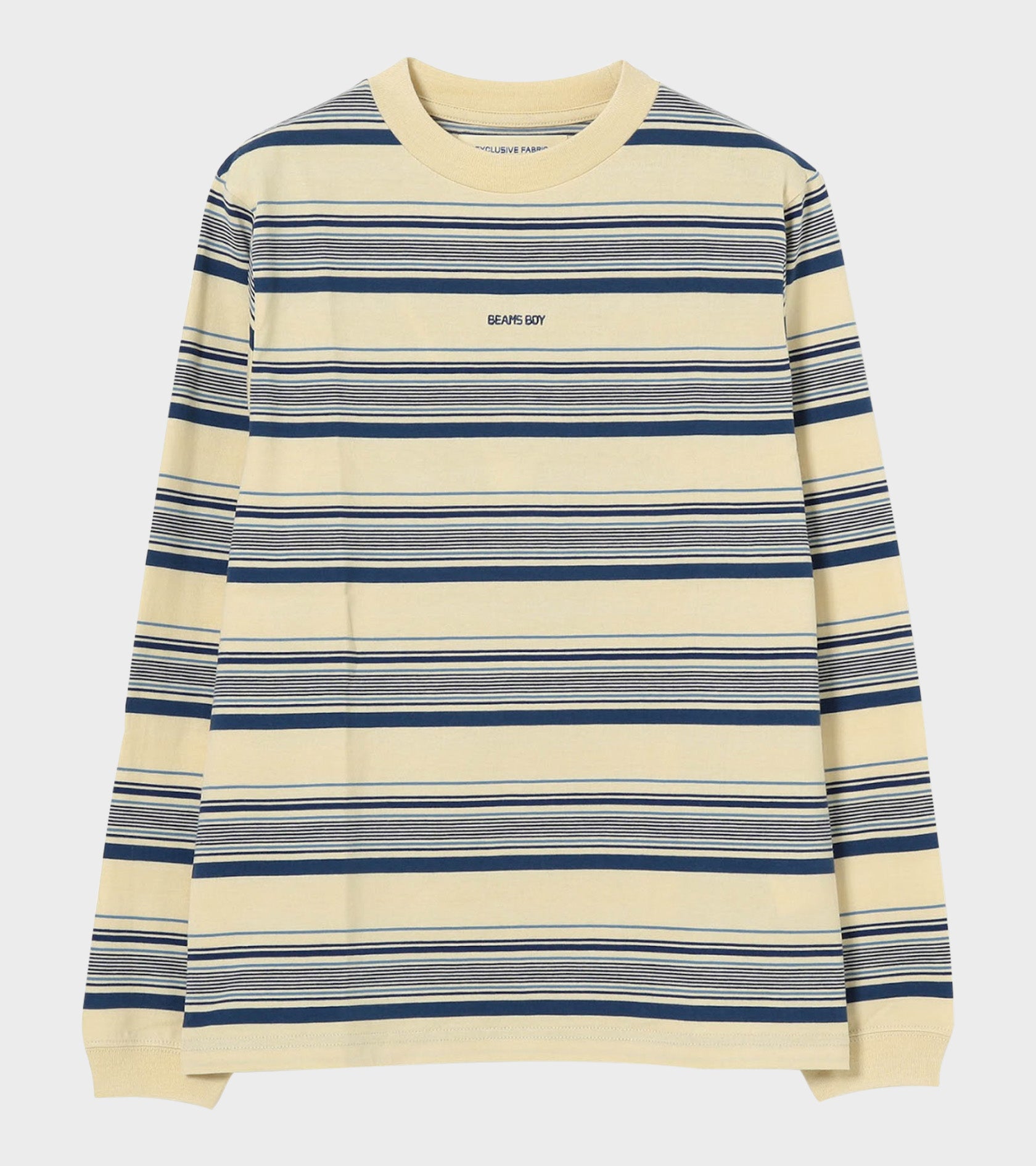 Cremefarvet langærmet t-shirt med blå striber fra Beams Boy. På fronten er et broderet logo i blå.