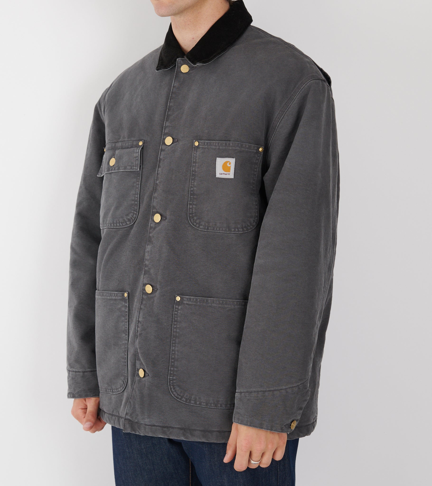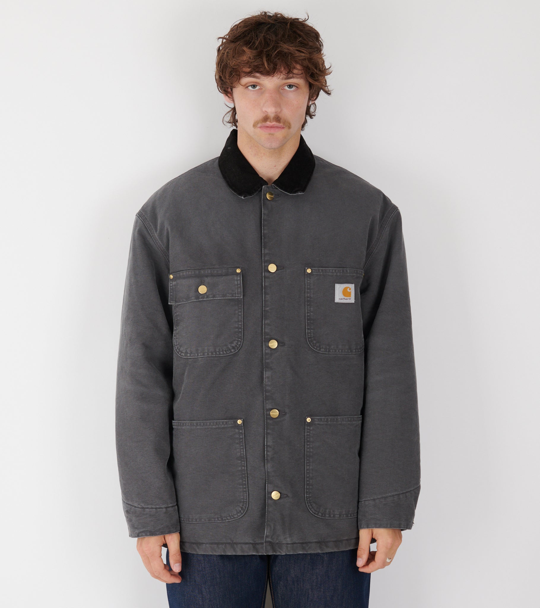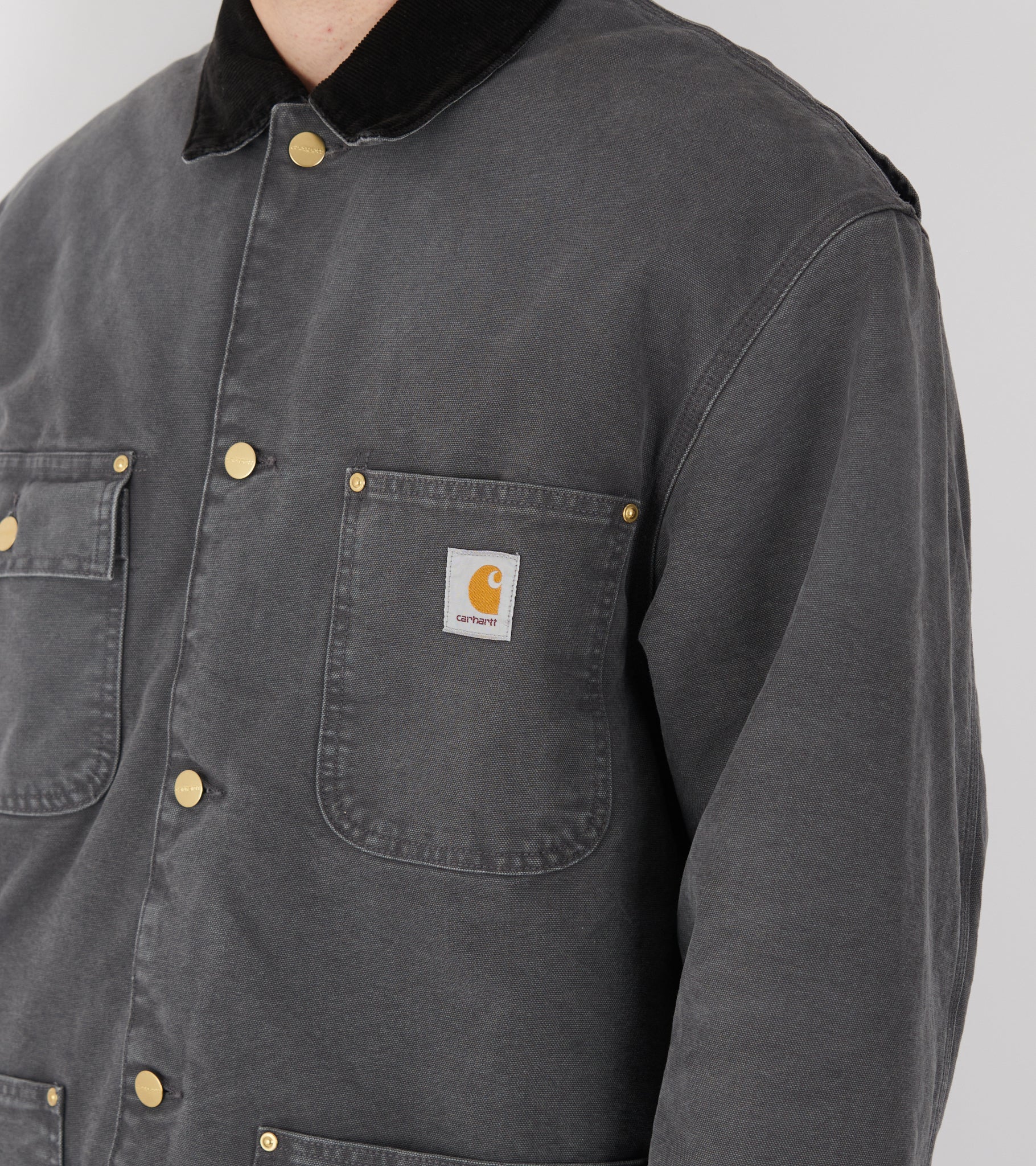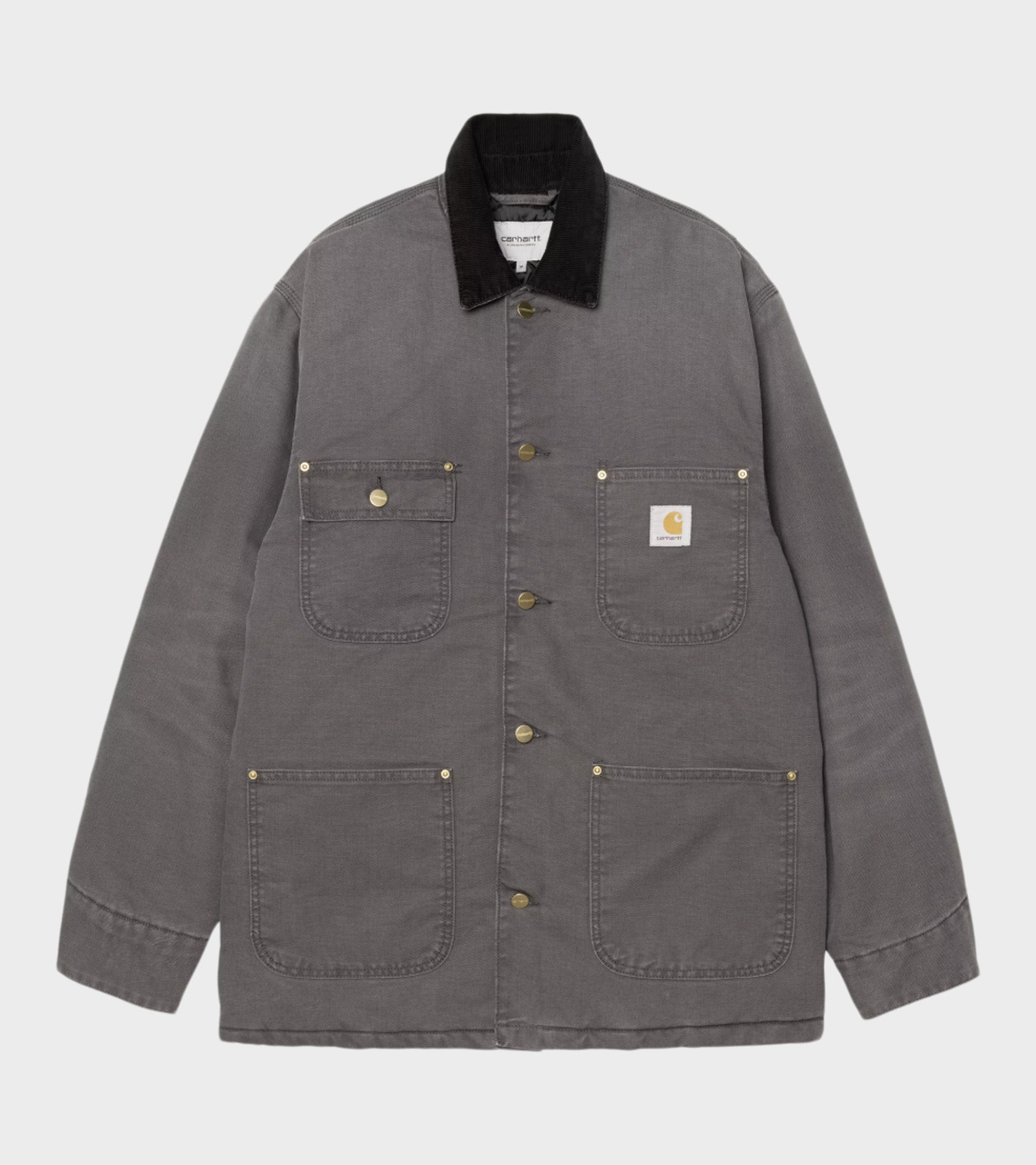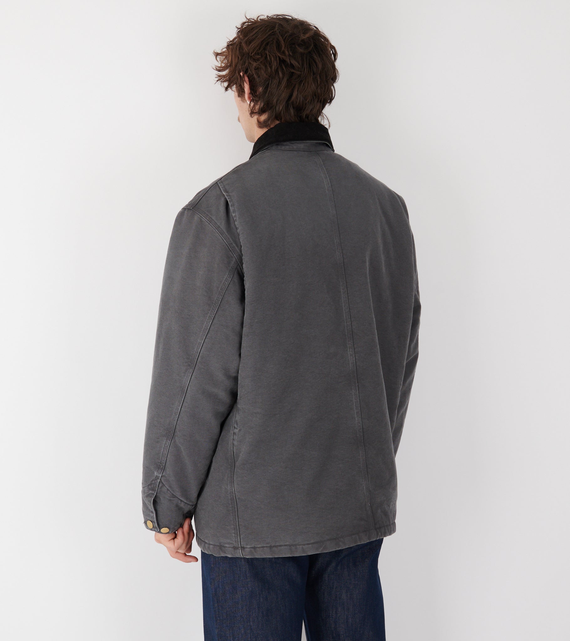 Foret grå jakke i bomuldkanvas fra Carhartt WIP. Denne jakke har en klassisk krave i sort bomuldsfløjls, en lynlåslukning og fire lommer på fronten. Ved venstre bryst er det ikoniske logo. Jakken er fremstillet i Carhartt's 'Dearbon' kanvas.