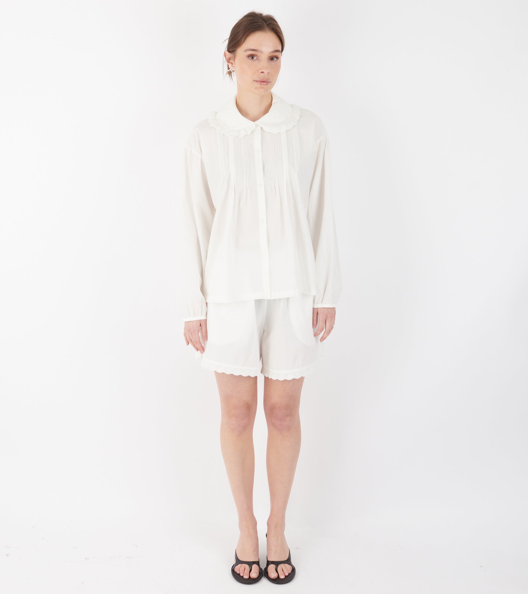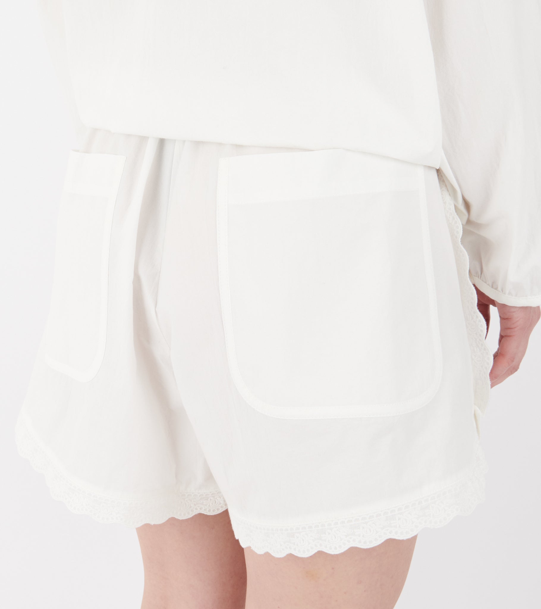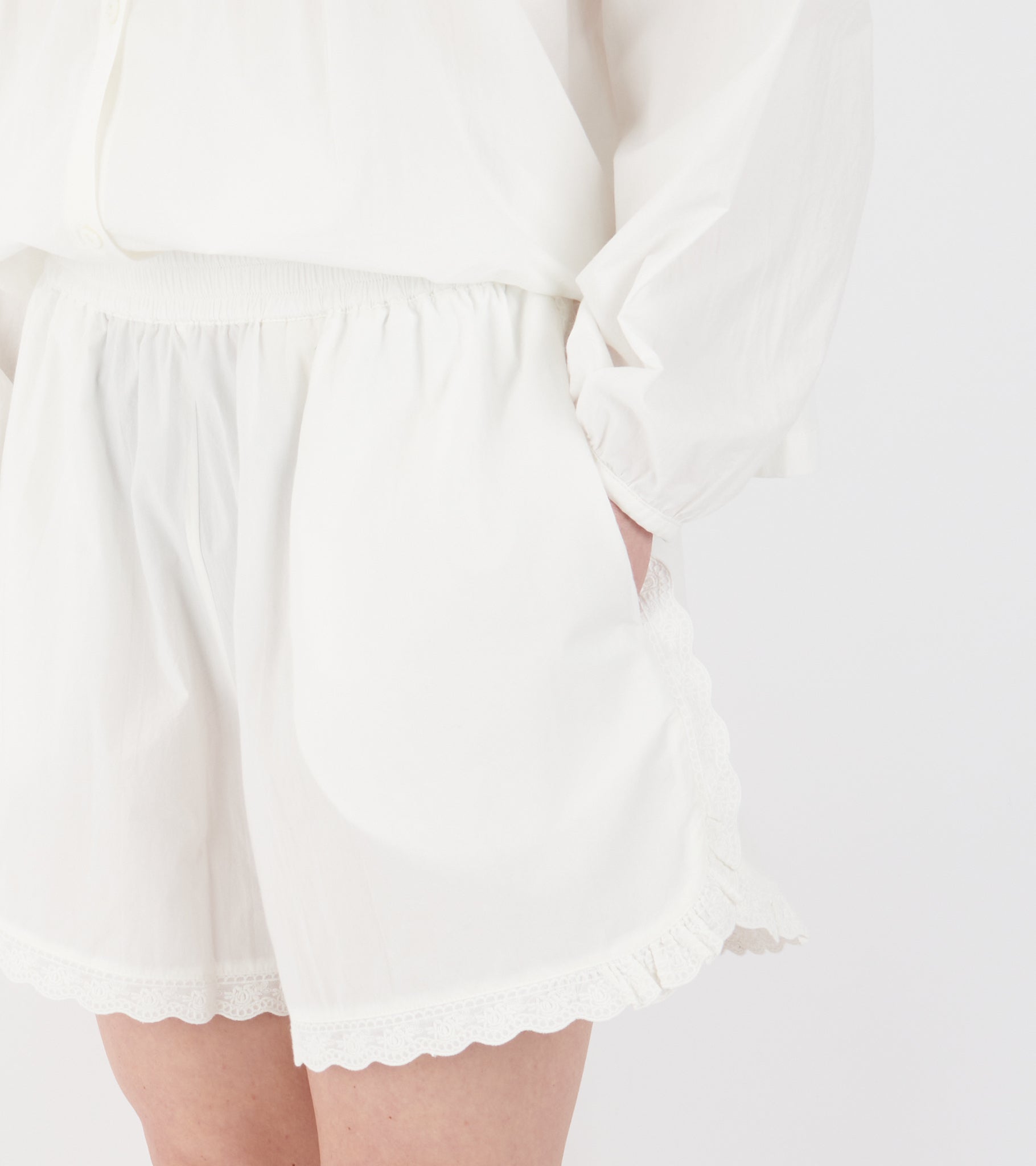 Hvide shorts i bomuldspoplin fra Cawley. Disse shorts har elastik i livet, en skrålomme i hver side samt to baglommer. I kanterne er broderede blondedetaljer.