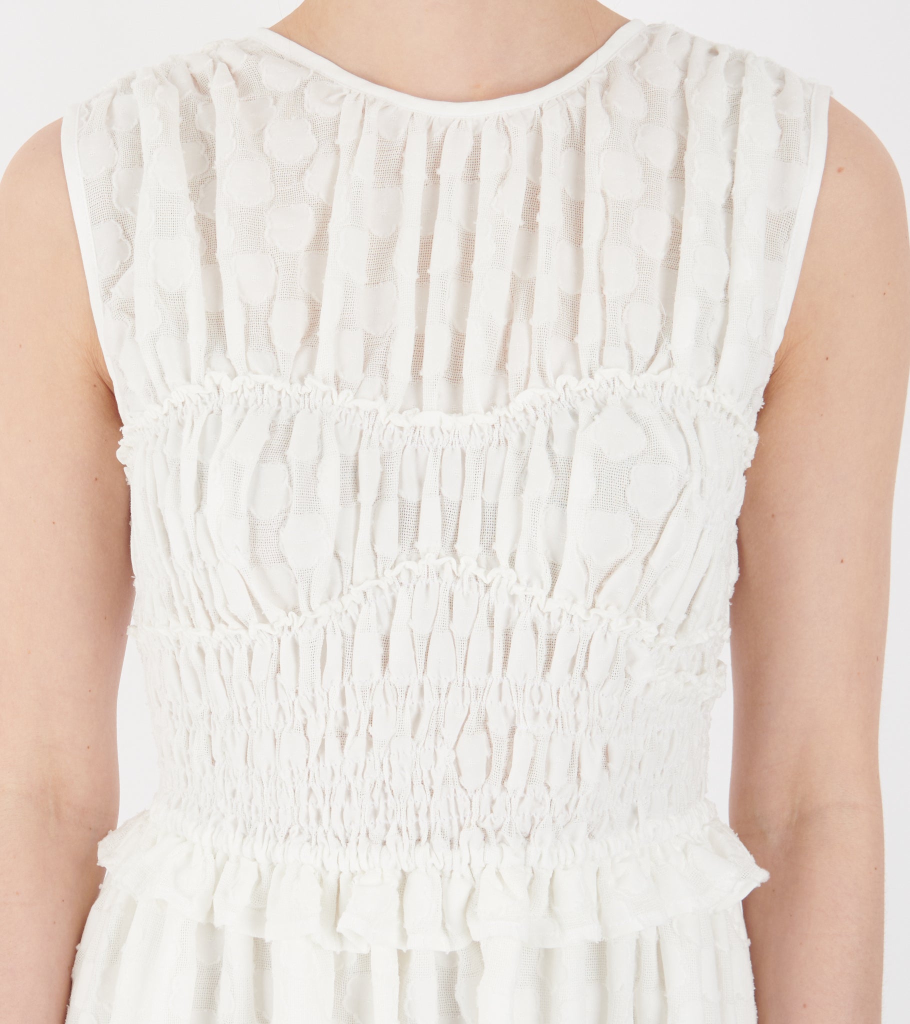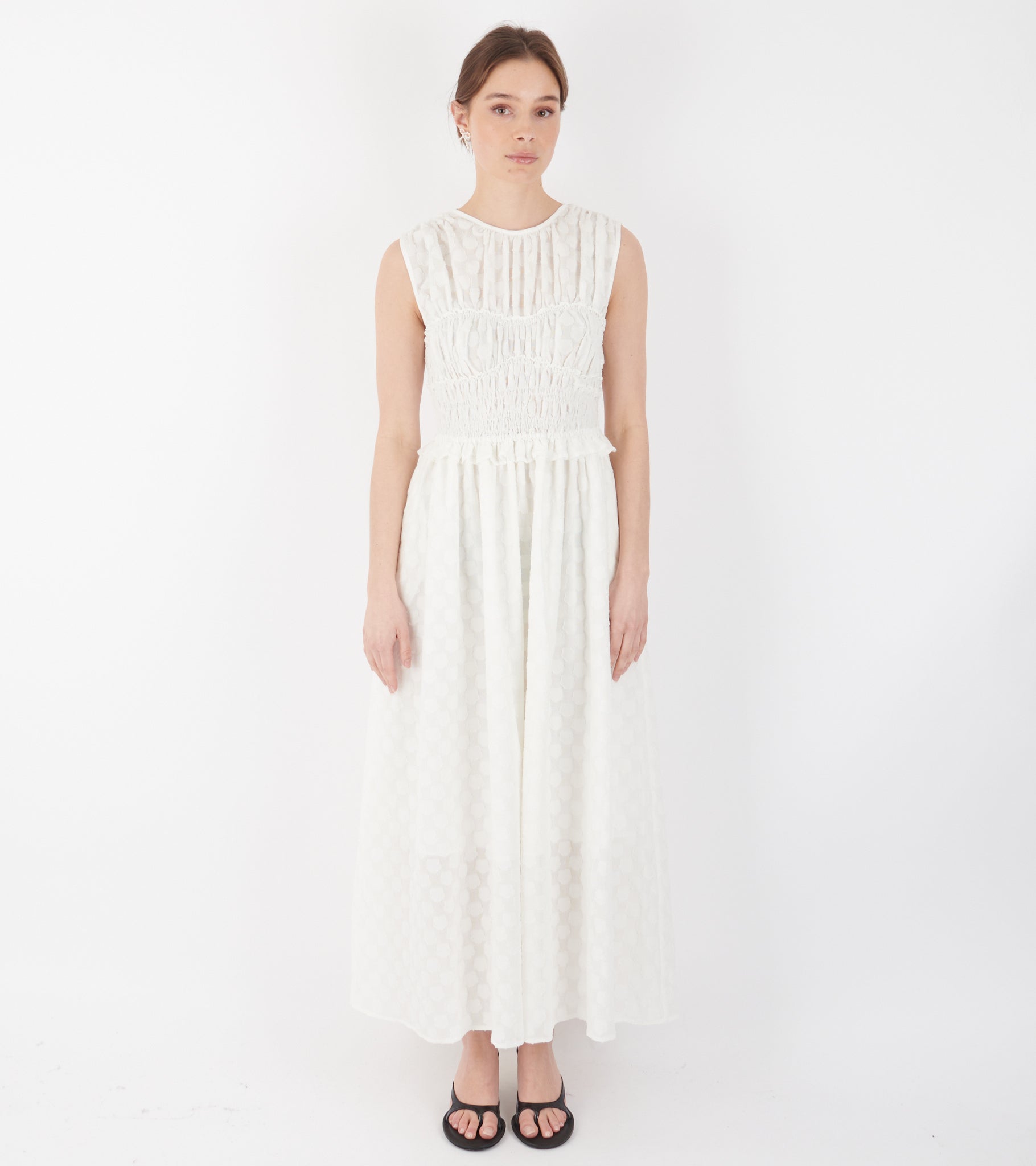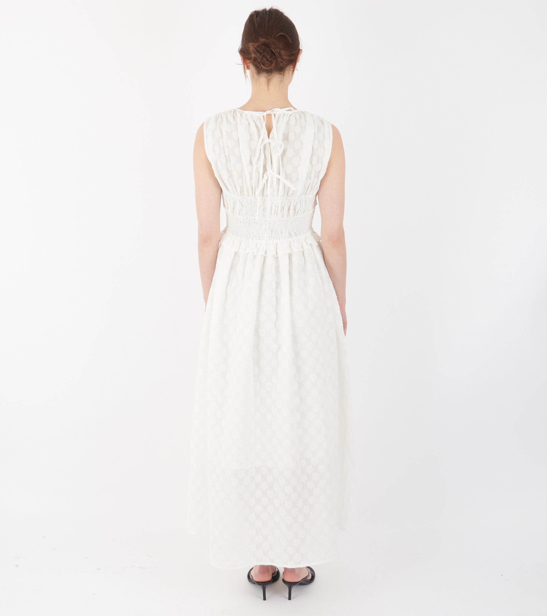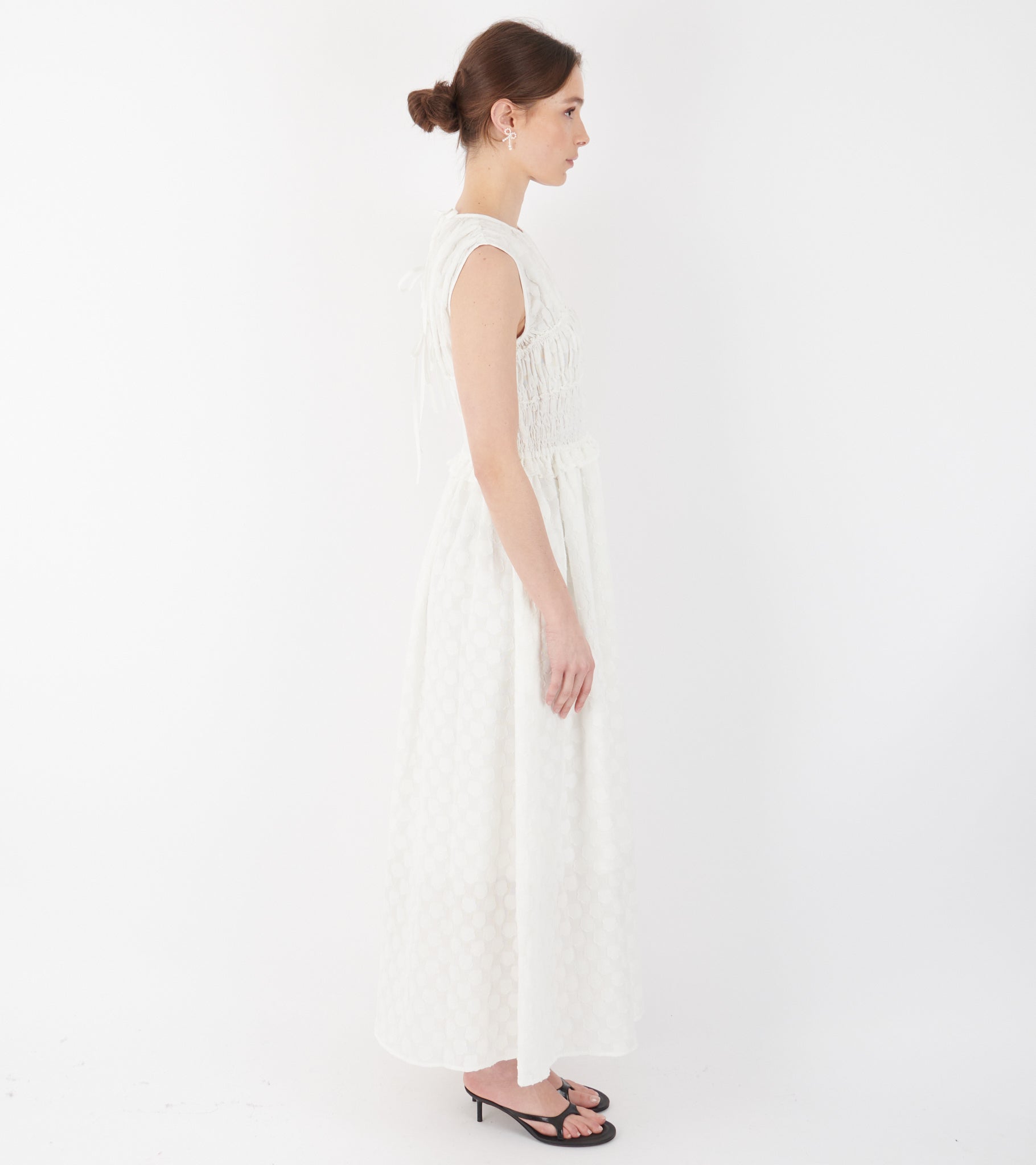 Hvid kjole fra Cecilie Bahnsen. Dinah Dress er fremstillet i en 'fleur fil-coupé' kvalitet og har læg samt flæsedetaljer. Bagpå er en bindebåndslukning med tre bindebånd.