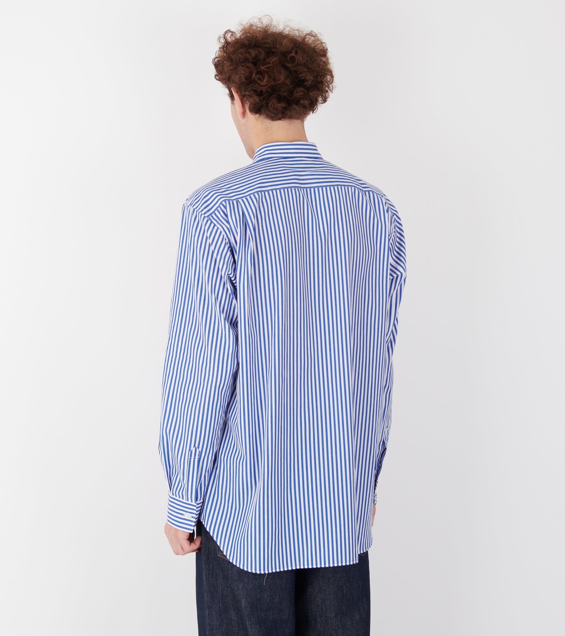 Stribet blå og hvid skjorte med ternet patchwork fra Comme des Garcons Shirt. Skjorten har en klassisk krave og en knaplukning på fronten.