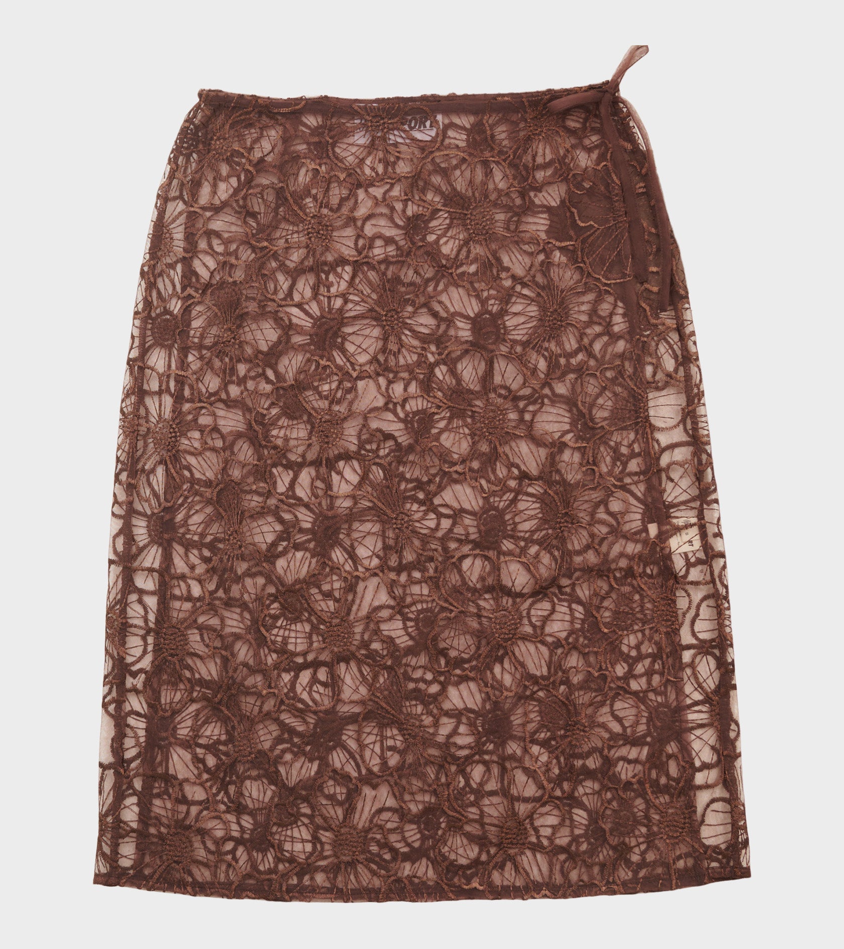 Brun knælang blondenederdel fra OperaSPORT. Alba Long Skirt er fremstillet i genanvendt polyester og har all-over blonder med store blomster. Nederdelen har et wrap-design med et bindebånd i siden, så den kan justeres i størrelse og pasform.