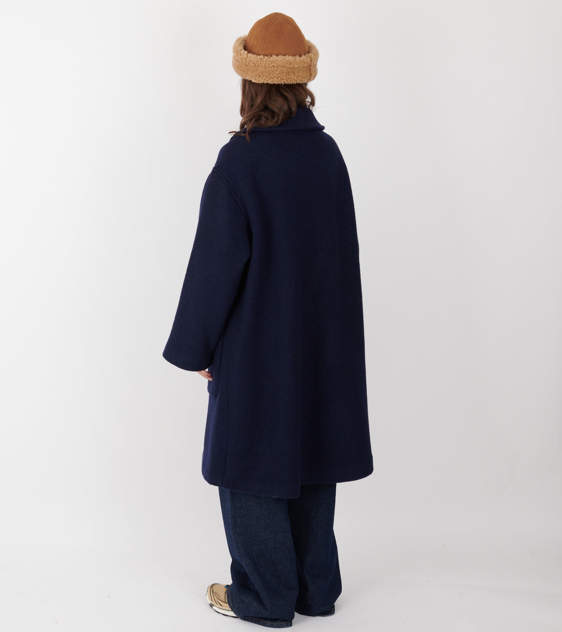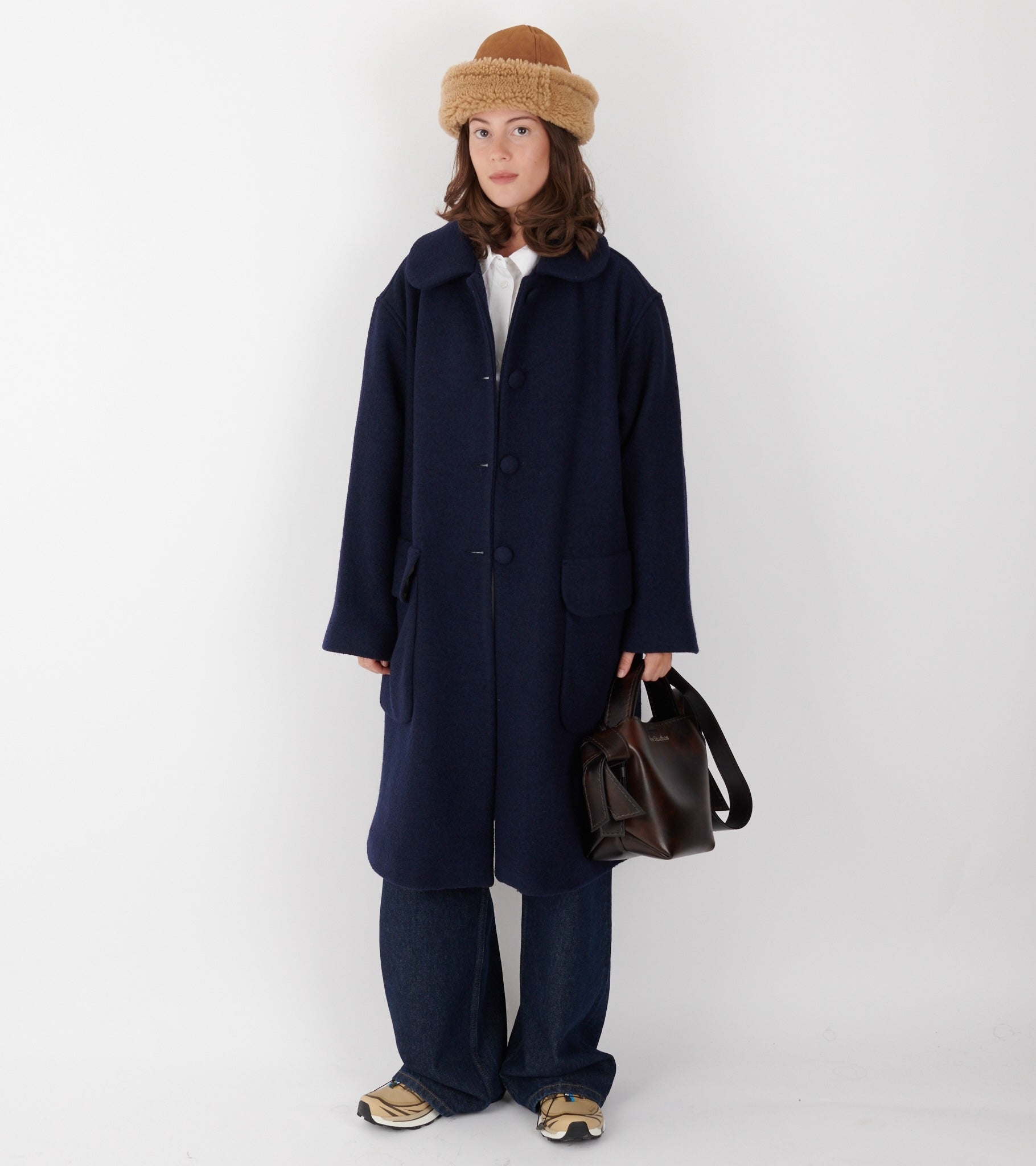 Lang bouclefrakke i mørkeblå fra Mati Mati. Frakken er produceret af dead stock fra de store modehuse.