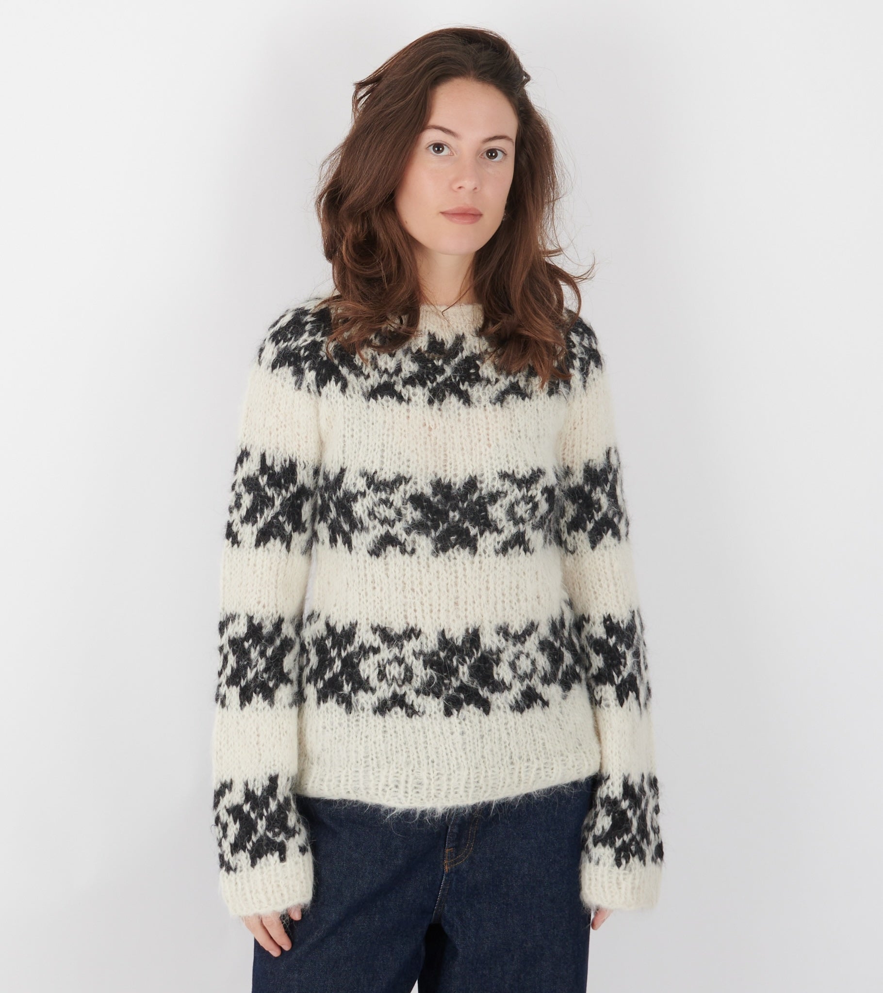 Råhvid strik med et sort vævet mønster fra Gudrun & Gudrun.