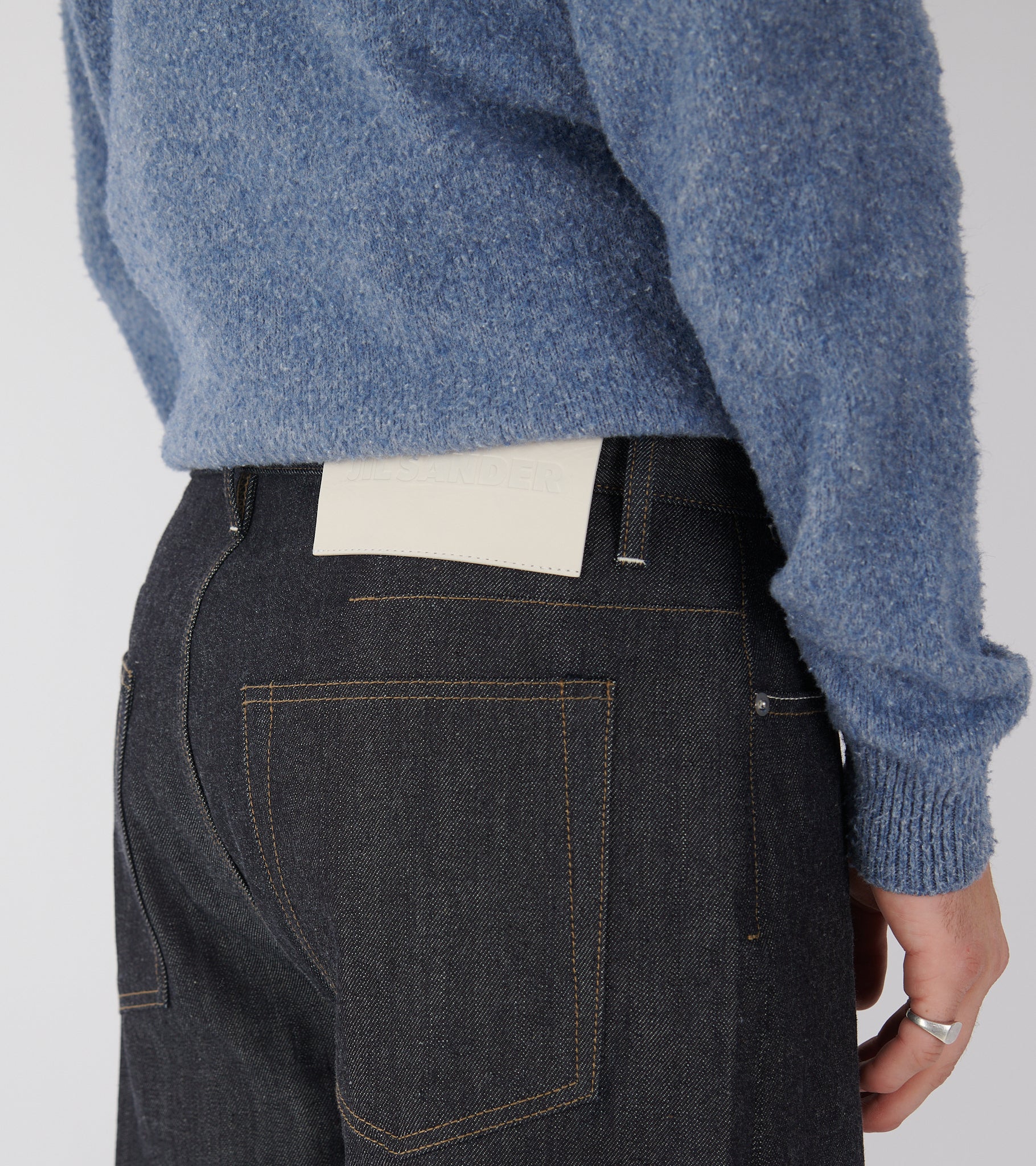 Jeans i en stiv 'rigid' bomuldsdenim fra Jil Sander. Disse jeans har bæltestropper, tre skrålommer og to baglommer. Øverst bagpå er et hvidt logotag i læder.