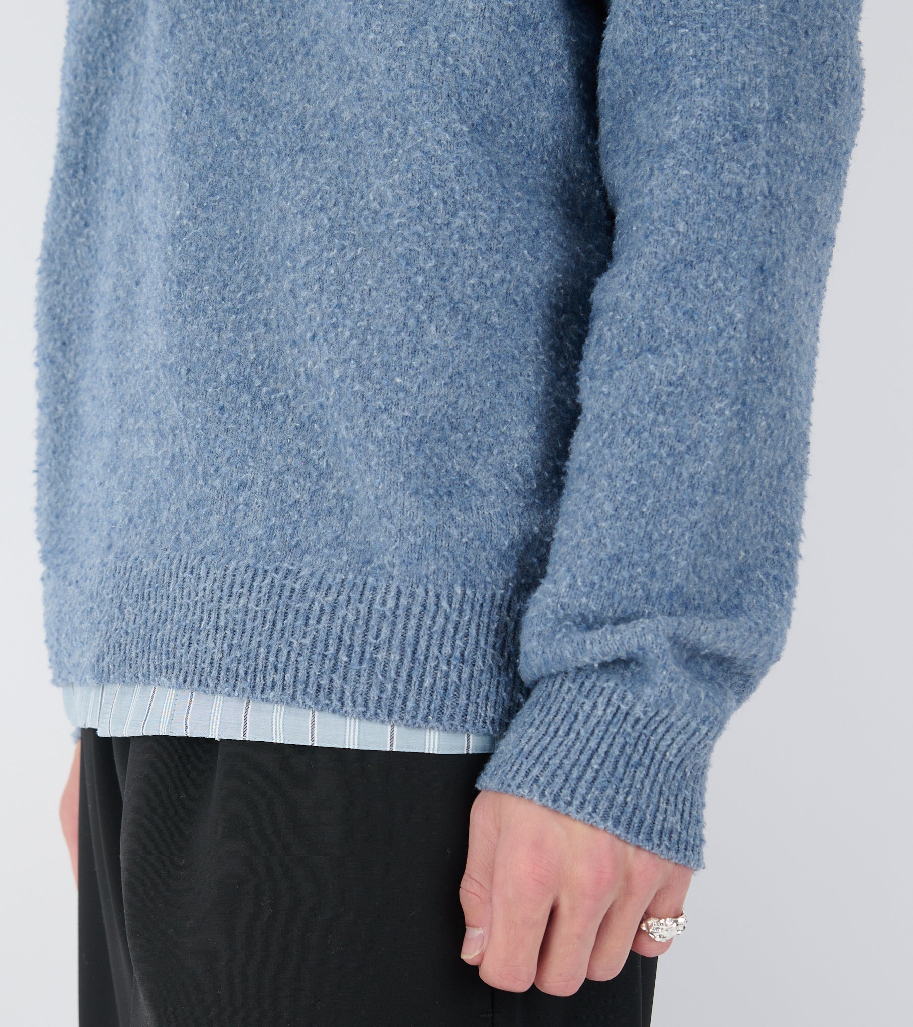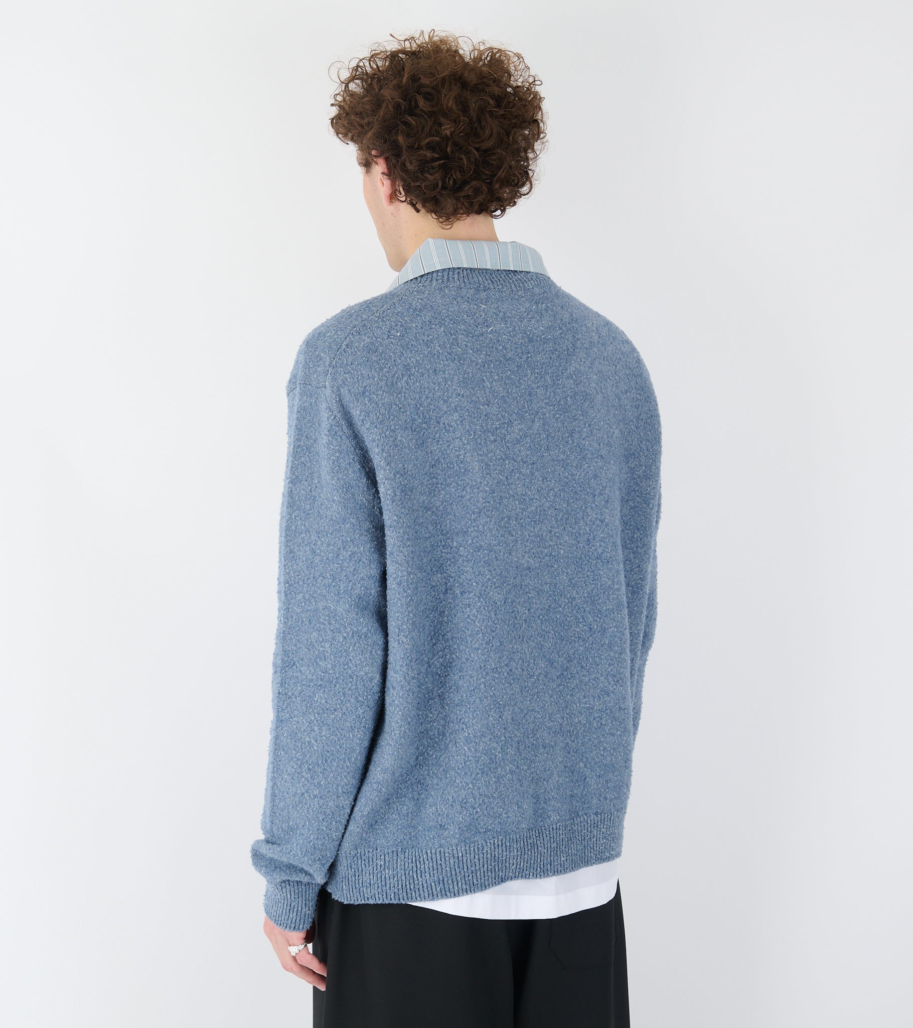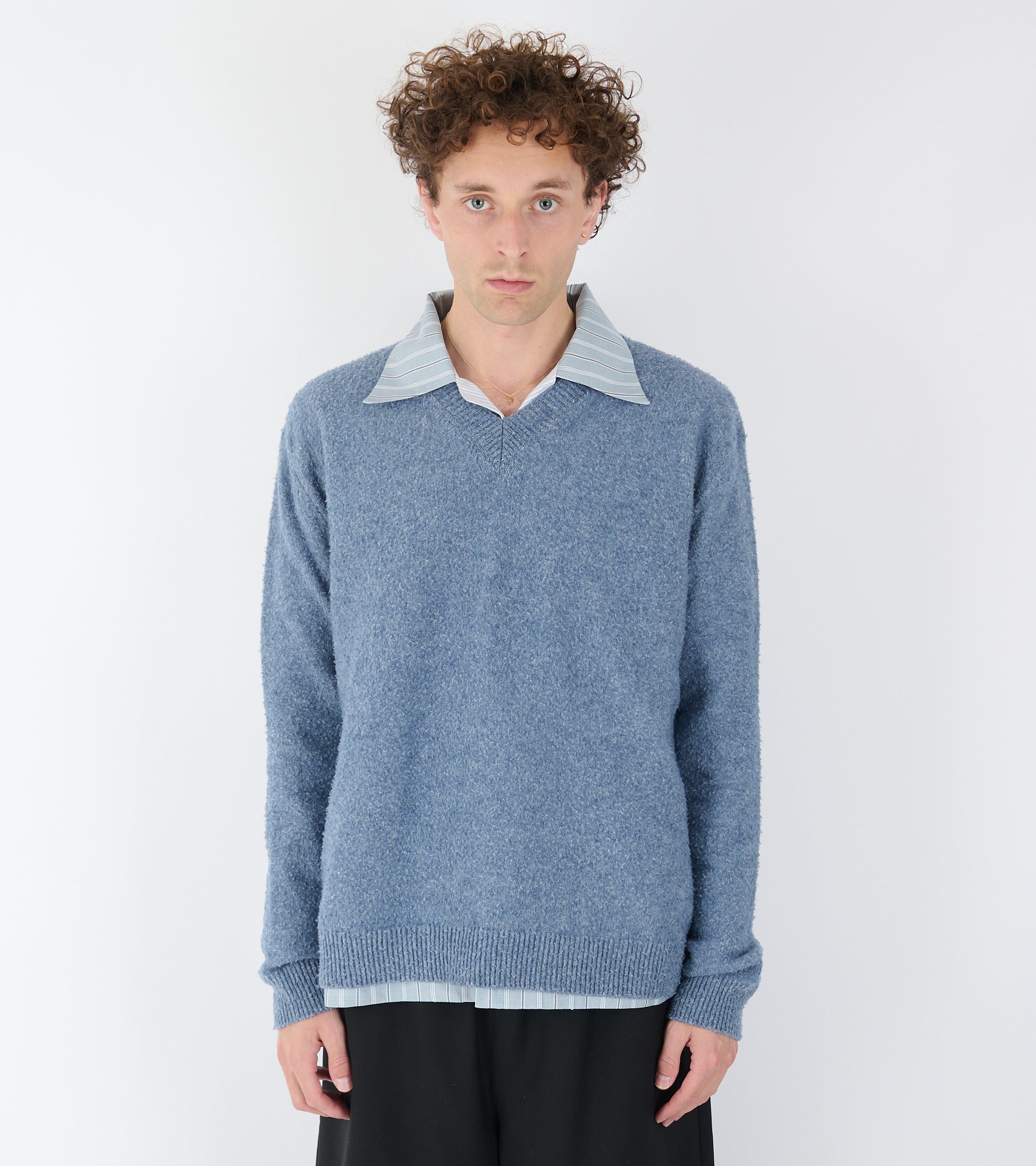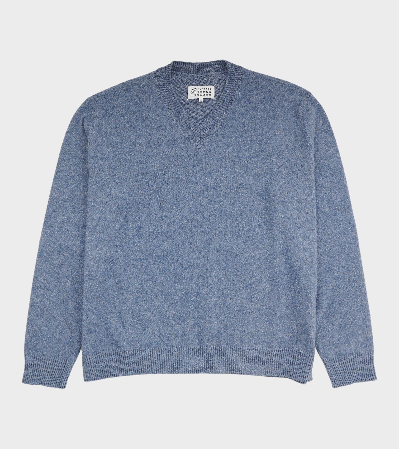 Blå meleret strik med v-hals fra Maison Margiela. Øverst bagpå er de ikoniske 'Four Stitchings'