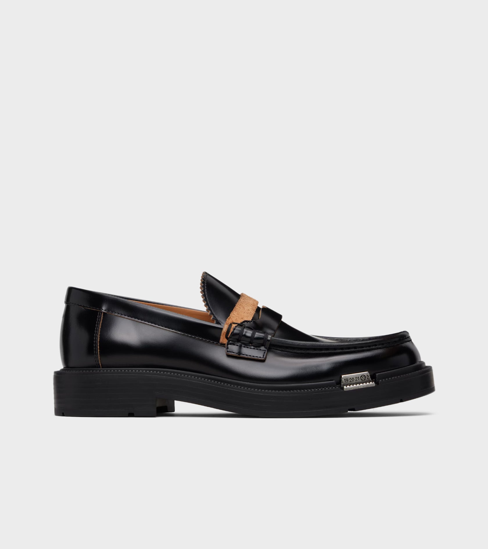 Sorte loafers i glat kalvelæder fra Maison Margiela. Disse loafers er detaljeret med brunt 'hairy' ruskind og har en logodetalje i metal langs ydersålen. Bagpå hælen er den ikoniske hvide syning.