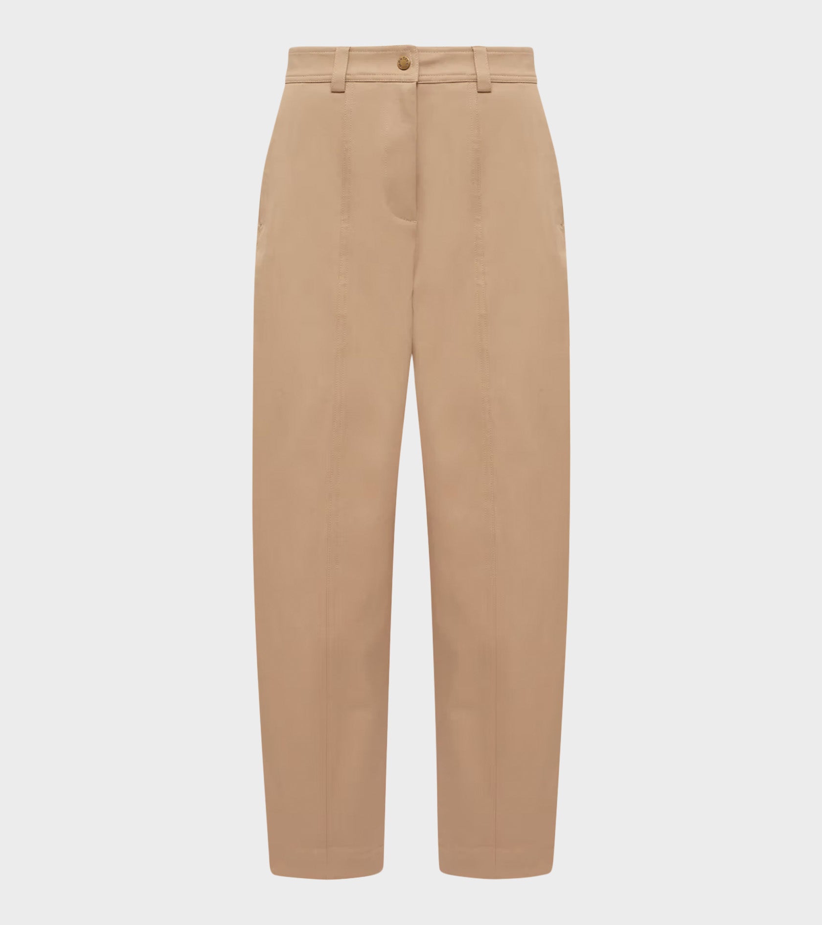 Beige bukser fra Moncler. Disse bukser har bæltestropper, en skrålomme i hver side samt en baglomme med en logo-trykknap. På baglommen er det ikoniske logo i filt.
