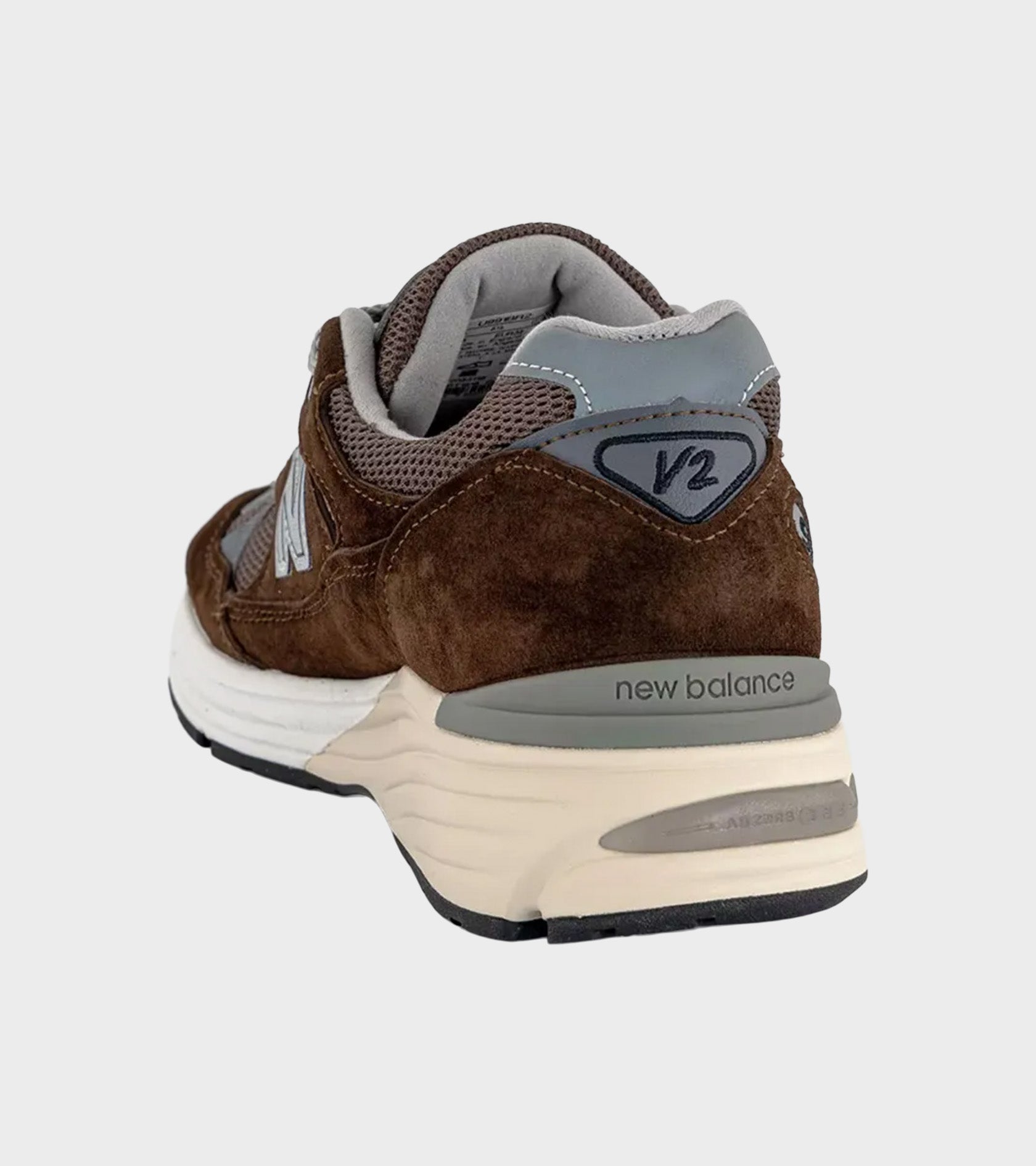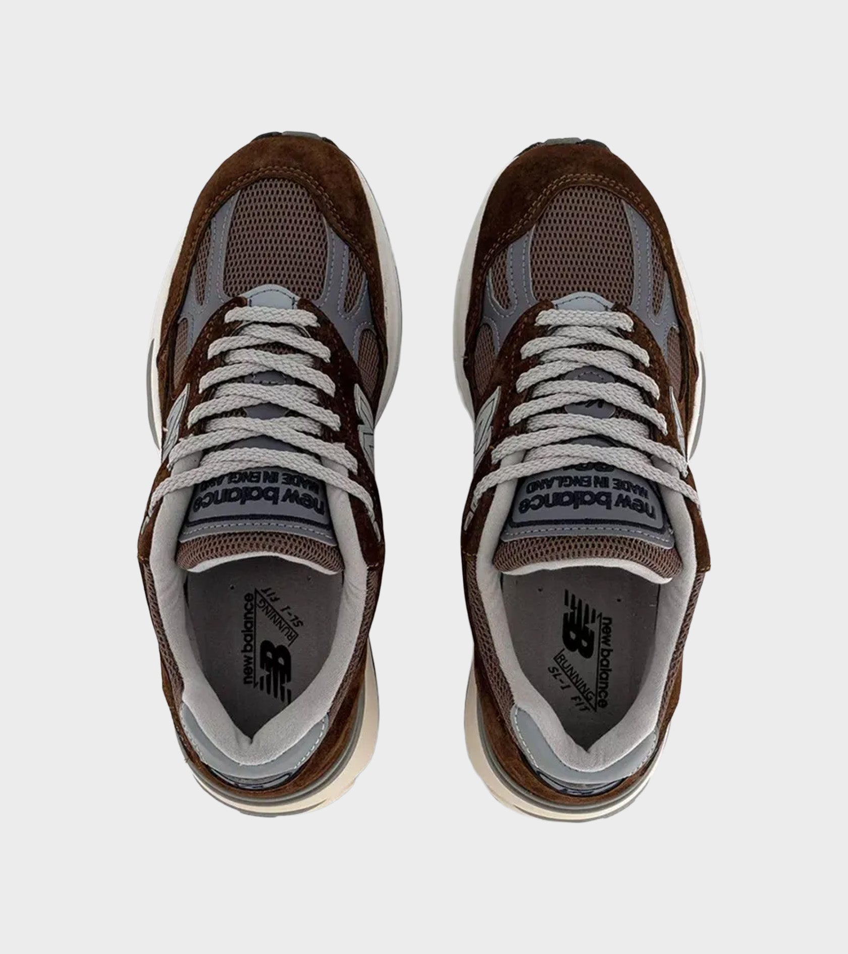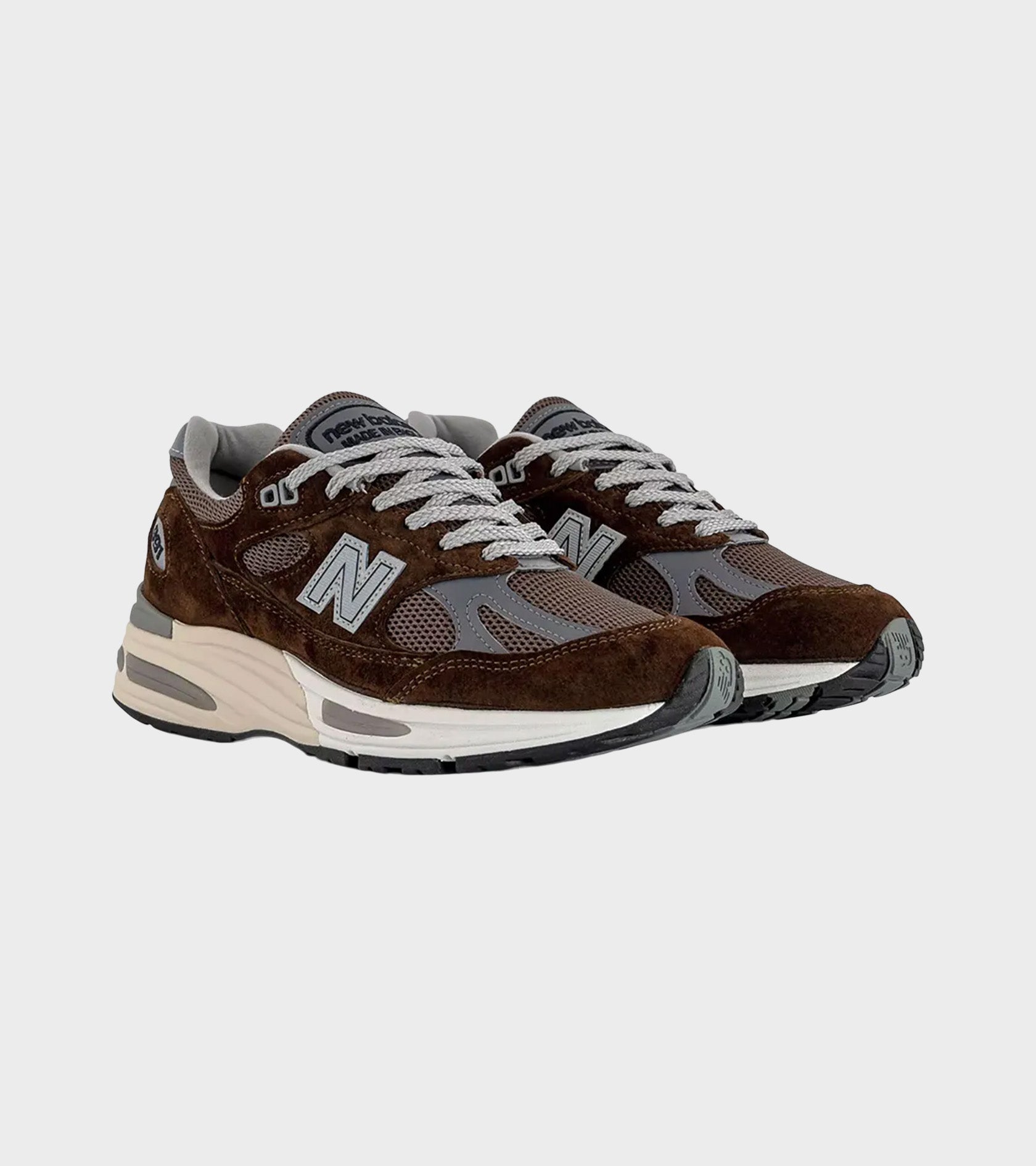 Den ikoniske 991 fra New Balance i en mørkebrun nuance med grå detaljer.