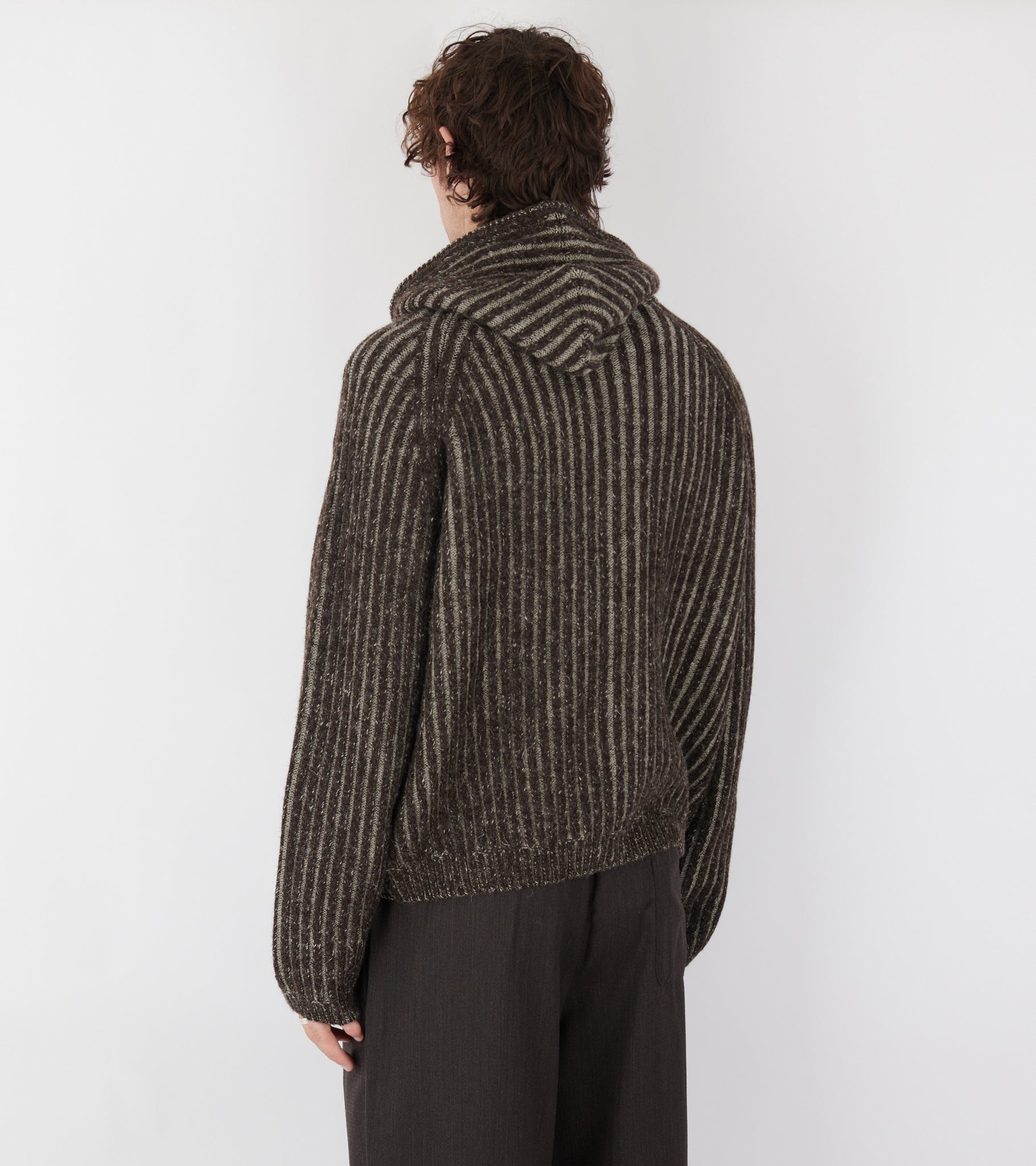 Brun ribstrikket hættetrøje i uld fra Our Legacy. Level Hood har en klassisk hætte, en dobbeltgående sølv Lampo-lynlåslukning og en skrålomme i hver side.