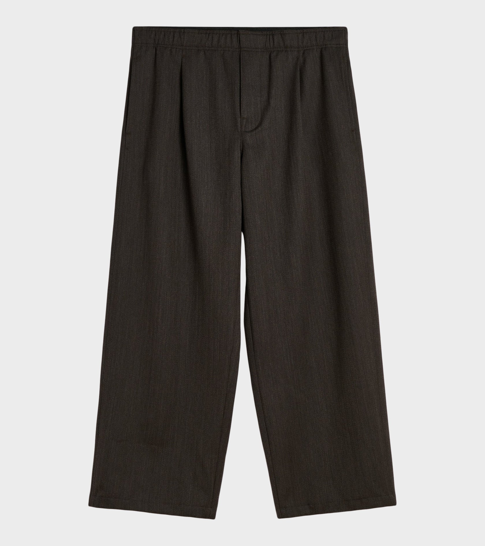 Brune bukser i en italiensk viskose- rayonblanding fra Our Legacy. Leisure Trouser Havana Brown Chain Wool har elastik i livet, en skjult lynlås-gylp, en skrålomme i hver side og en enkelt lomme bagpå. Bukserne har brede lige ben samt læg øverst på fronten.