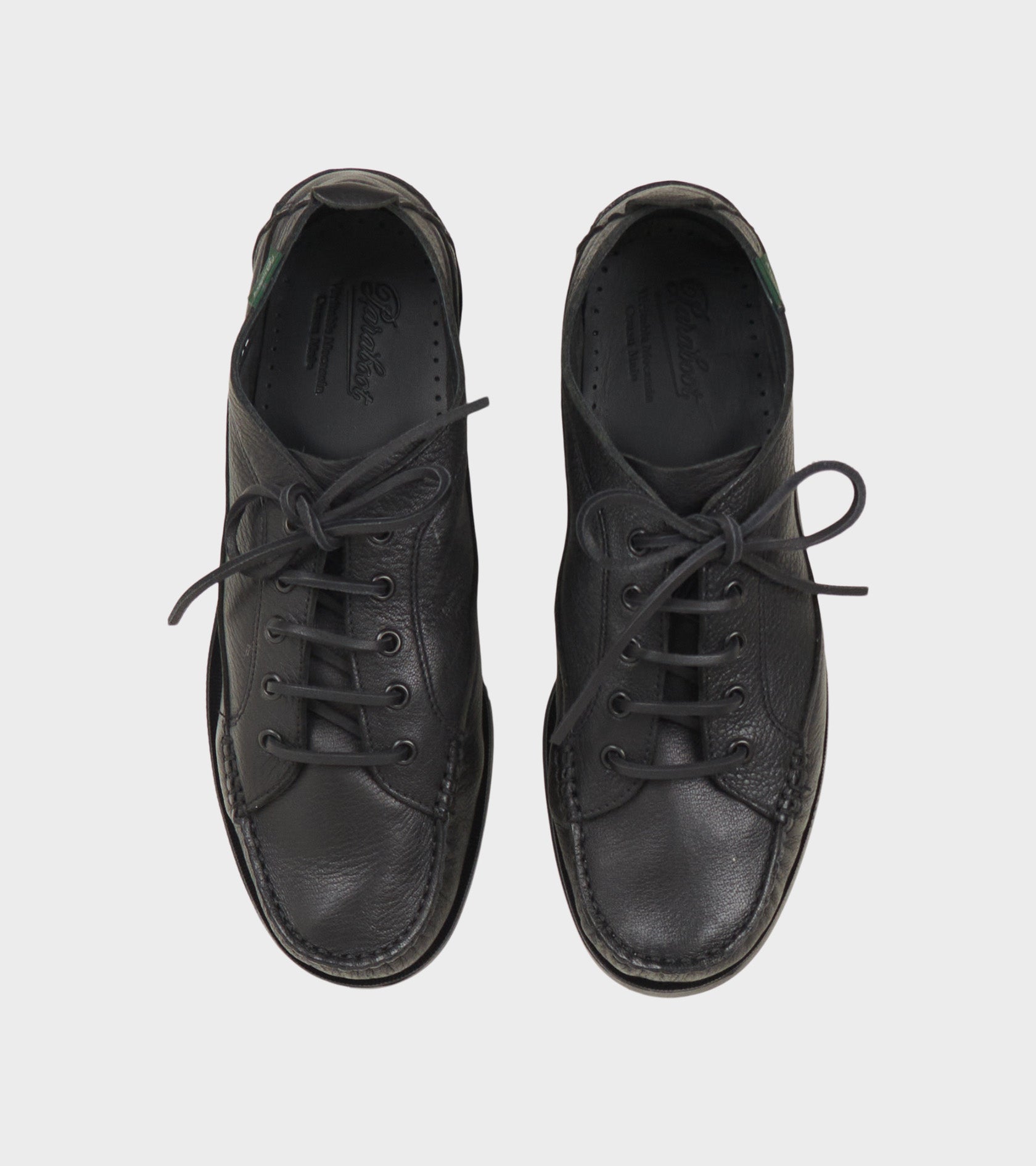 Malibu Marine Noir fra Paraboot. Disse sko er fremstillet i blødt full-grain læder og har et lille grønt logotag på siden samt en klassisk snørelukning.