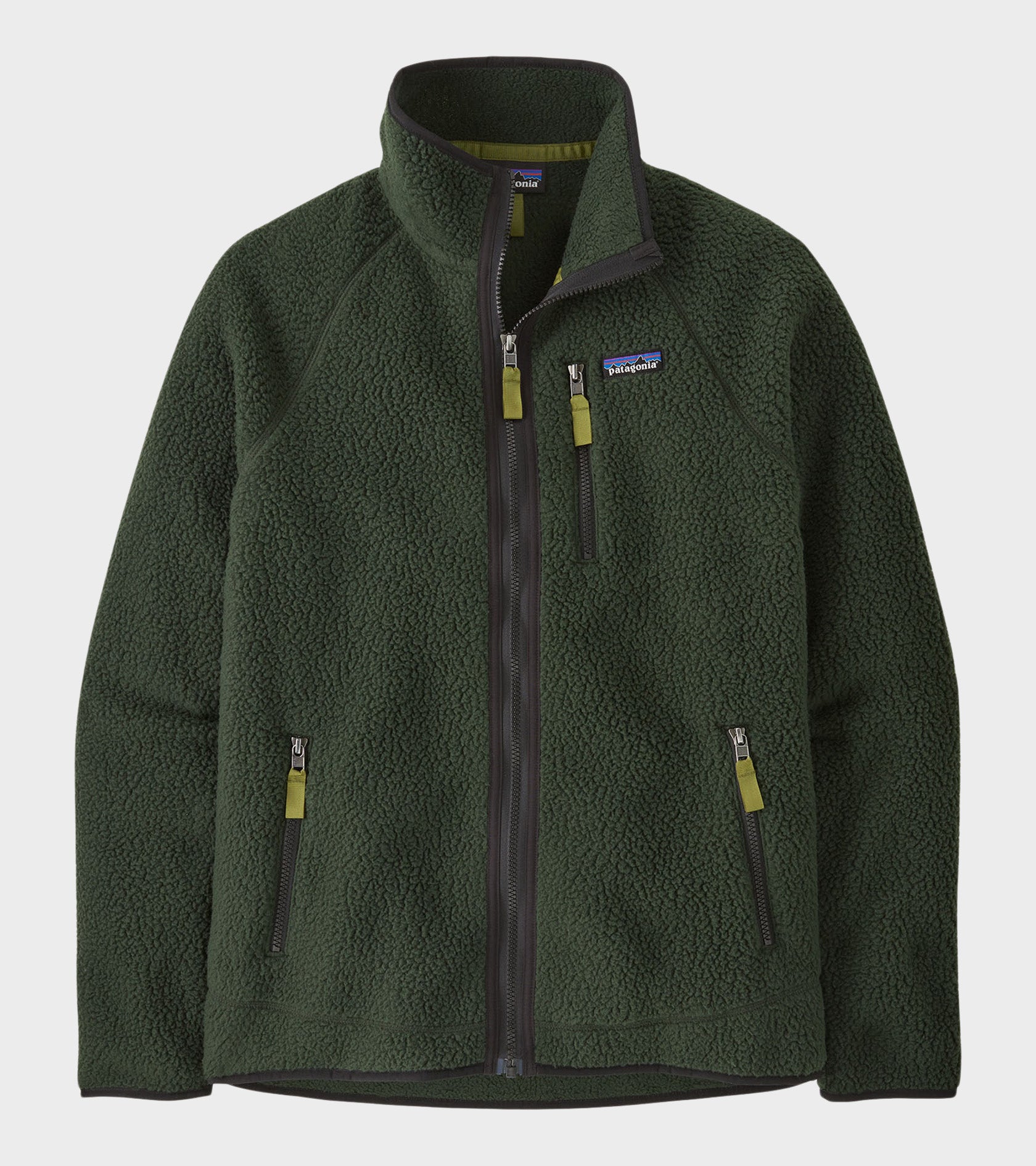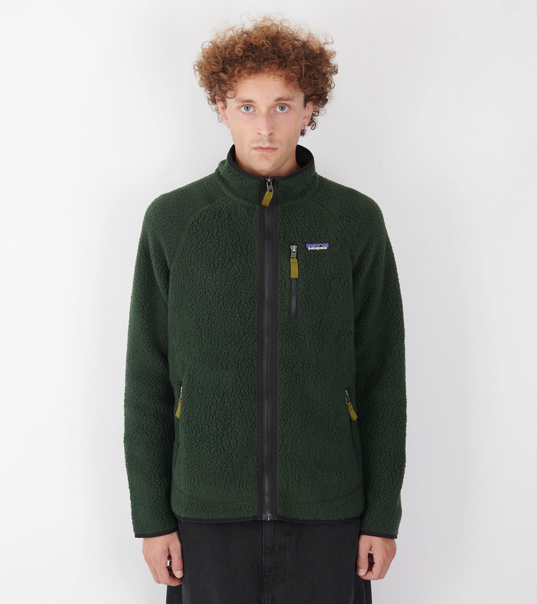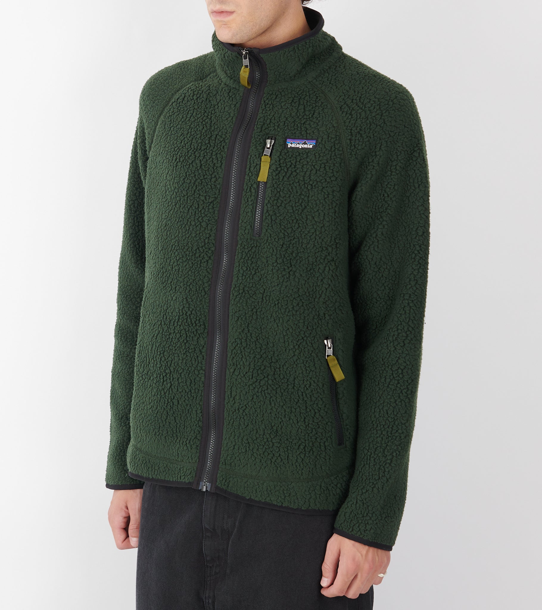 Mørkegrøn fleecejakke fra Patagonia. M's Retro Pile Jacket er fremstillet i genanvendt double-sided polyesterfleece og har en høj hals, kontrastkanter, en lynlåslukning samt tre lynlåslommer på fronten. Ved venstre bryst er et logo.