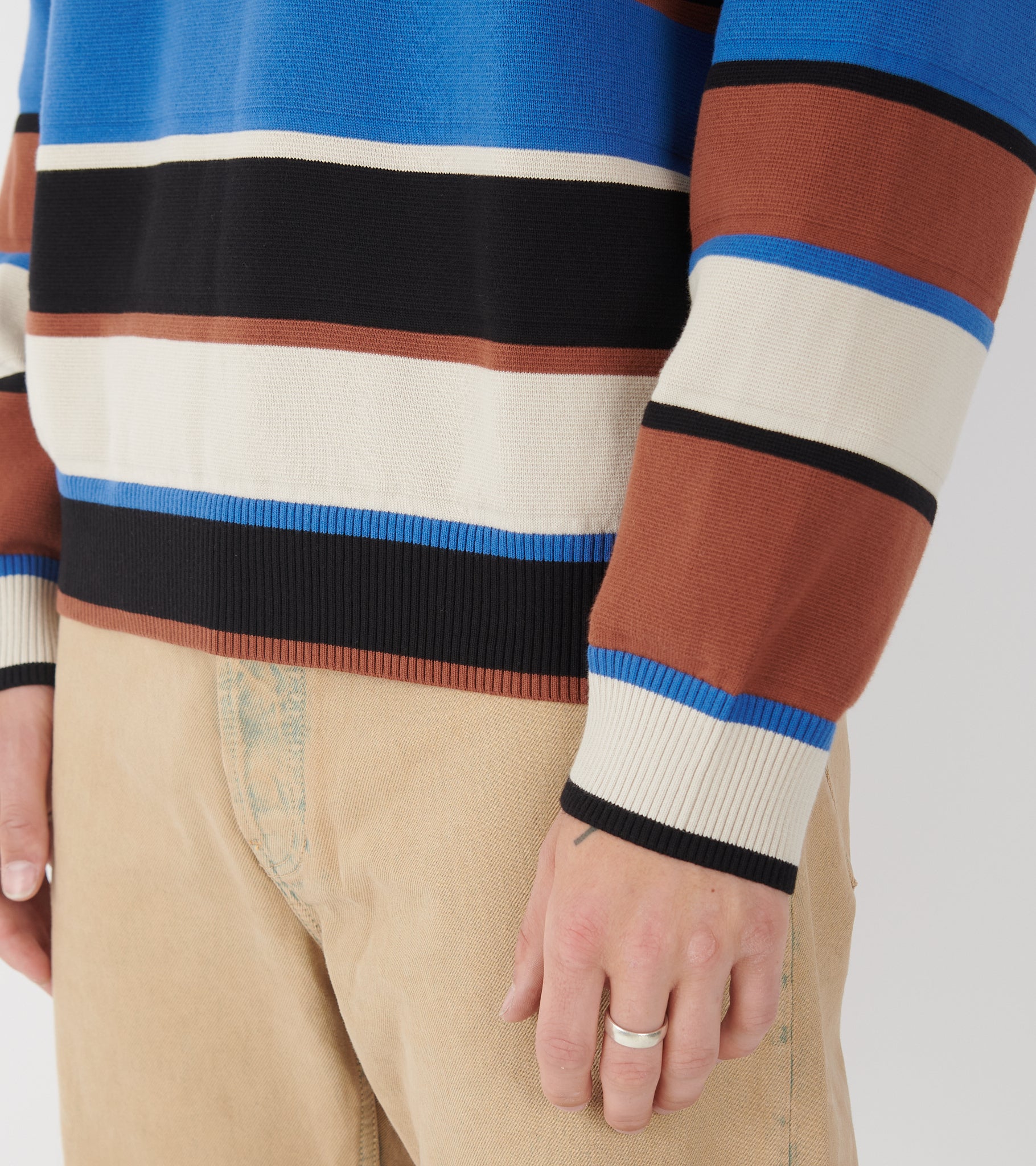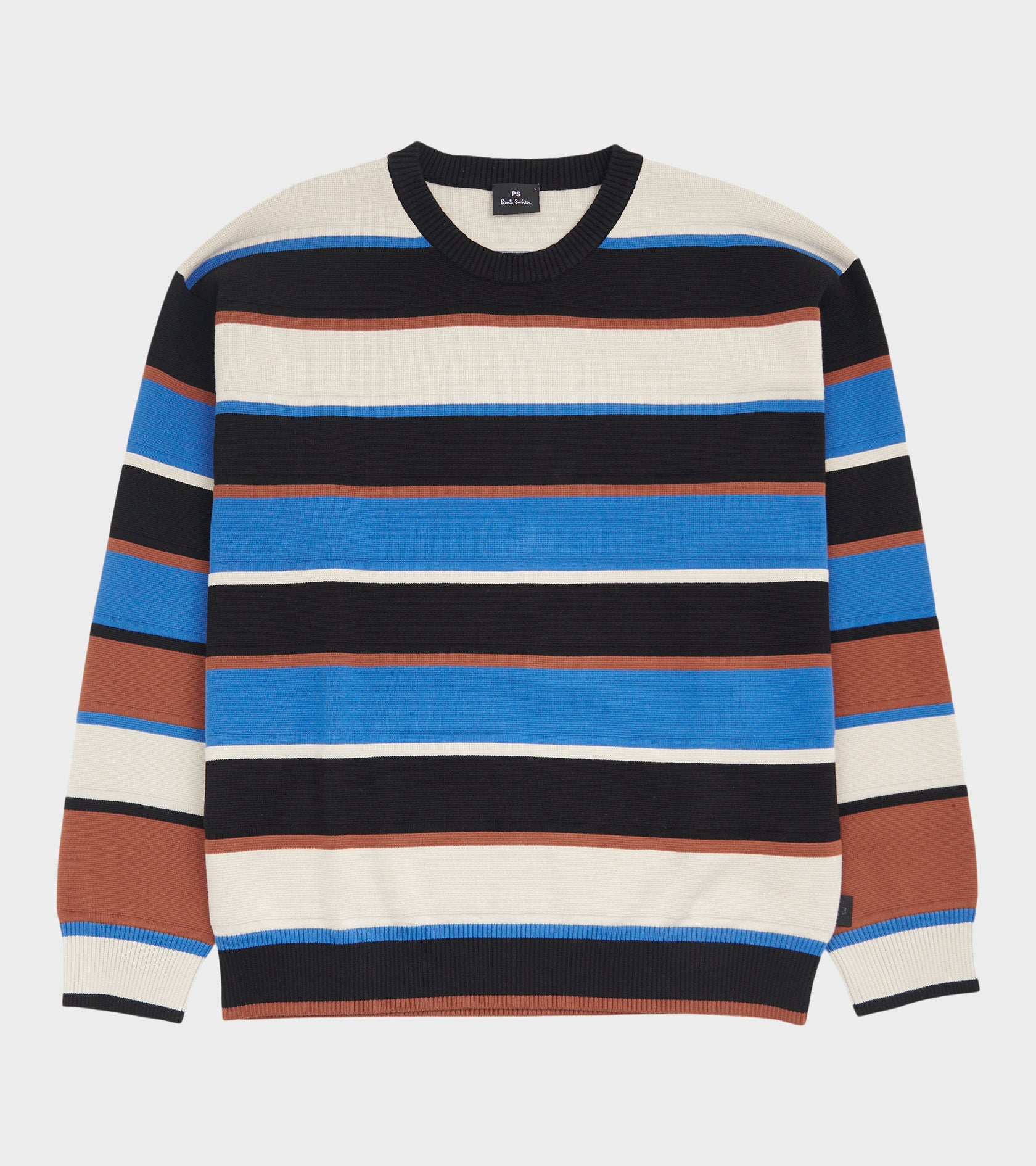 Stribet strik i økologisk bomuldsgarn fra Paul Smith. Denne strik er sort, lys beige, blå og brun. Den har en rund hals samt ribstrikkede kanter. Nederst i venstre side er et lille logotag.