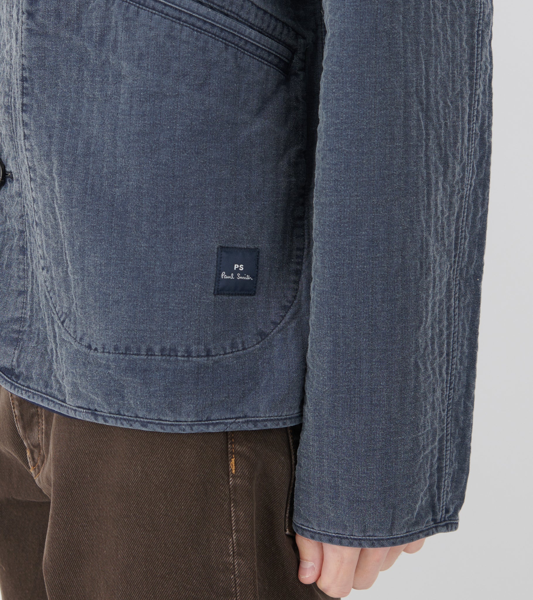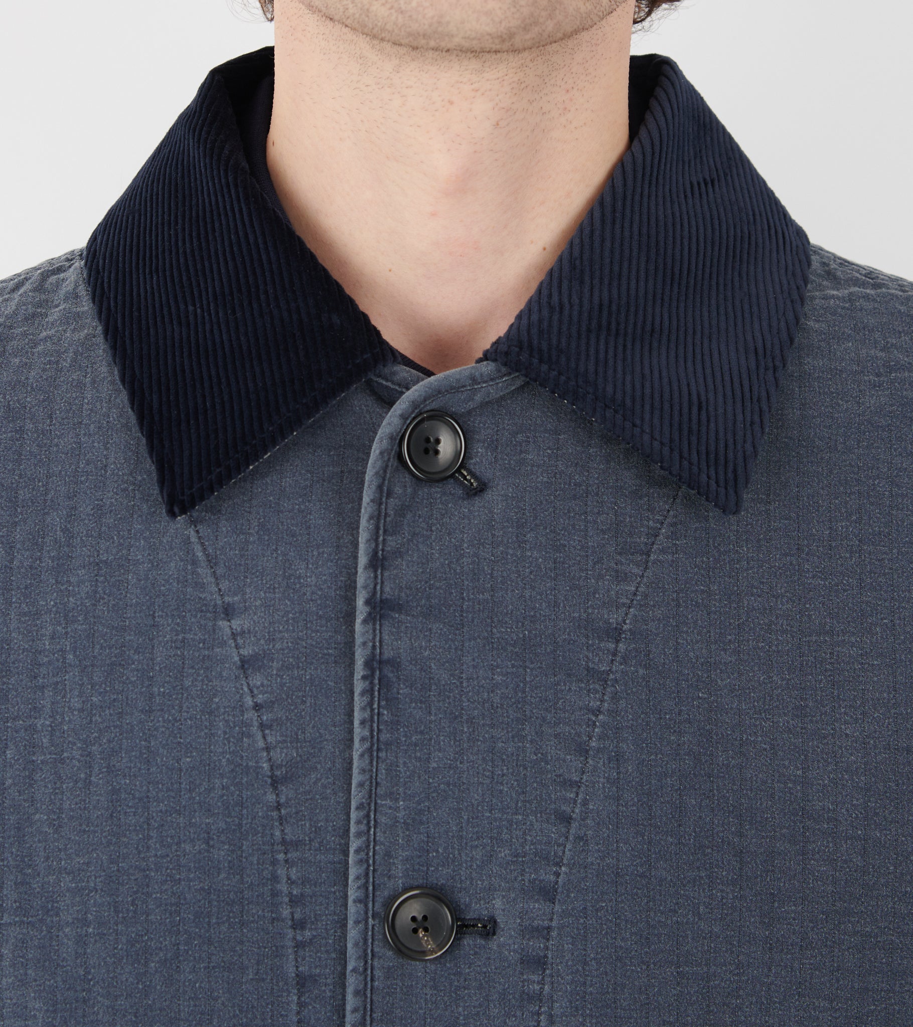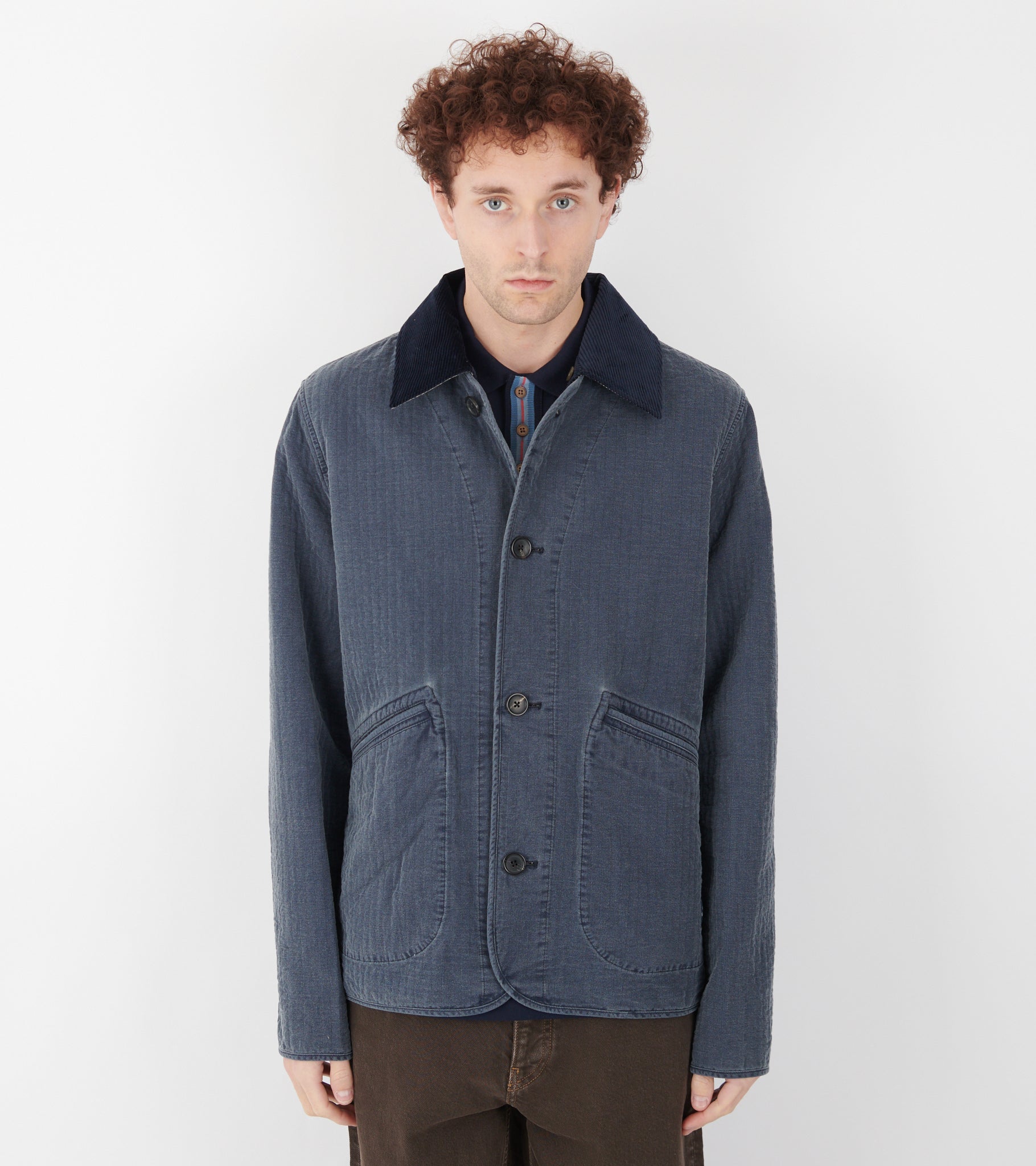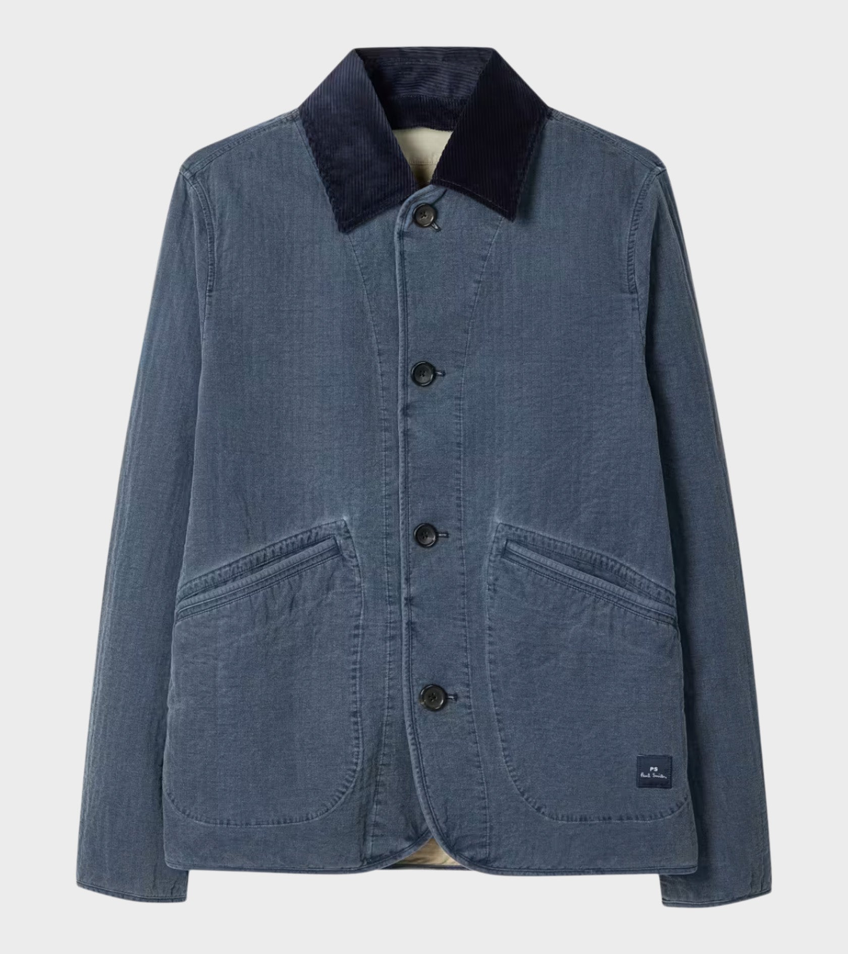 Garment washed jakke med aftagelig krave fra Paul Smith. Jakken har en krave i mørkeblåt bomuldsfløjl, en knaplukning, en indvendig lomme samt to lommer på fronten. På den ene lomme er et lille logo. Jakken er fremstillet i bomulds med en let kviltet struktur.