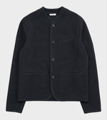 Mørk navy jakke i jomfru uld fra Rier. Jakken har vævede kontrastkanter, en knaplukning med logo-knapper samt tre lommer på fronten. Kvaliteten er som filt.
