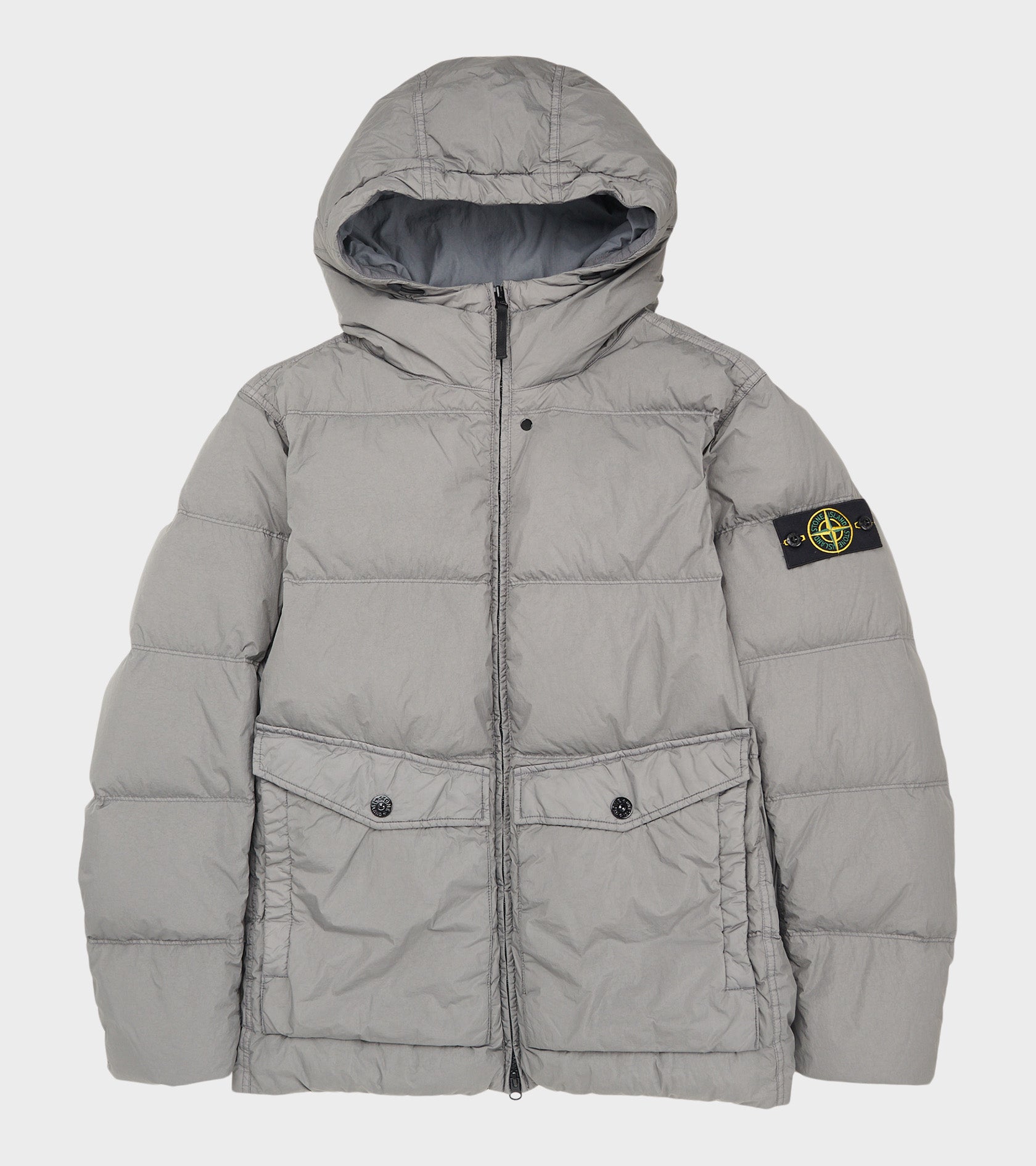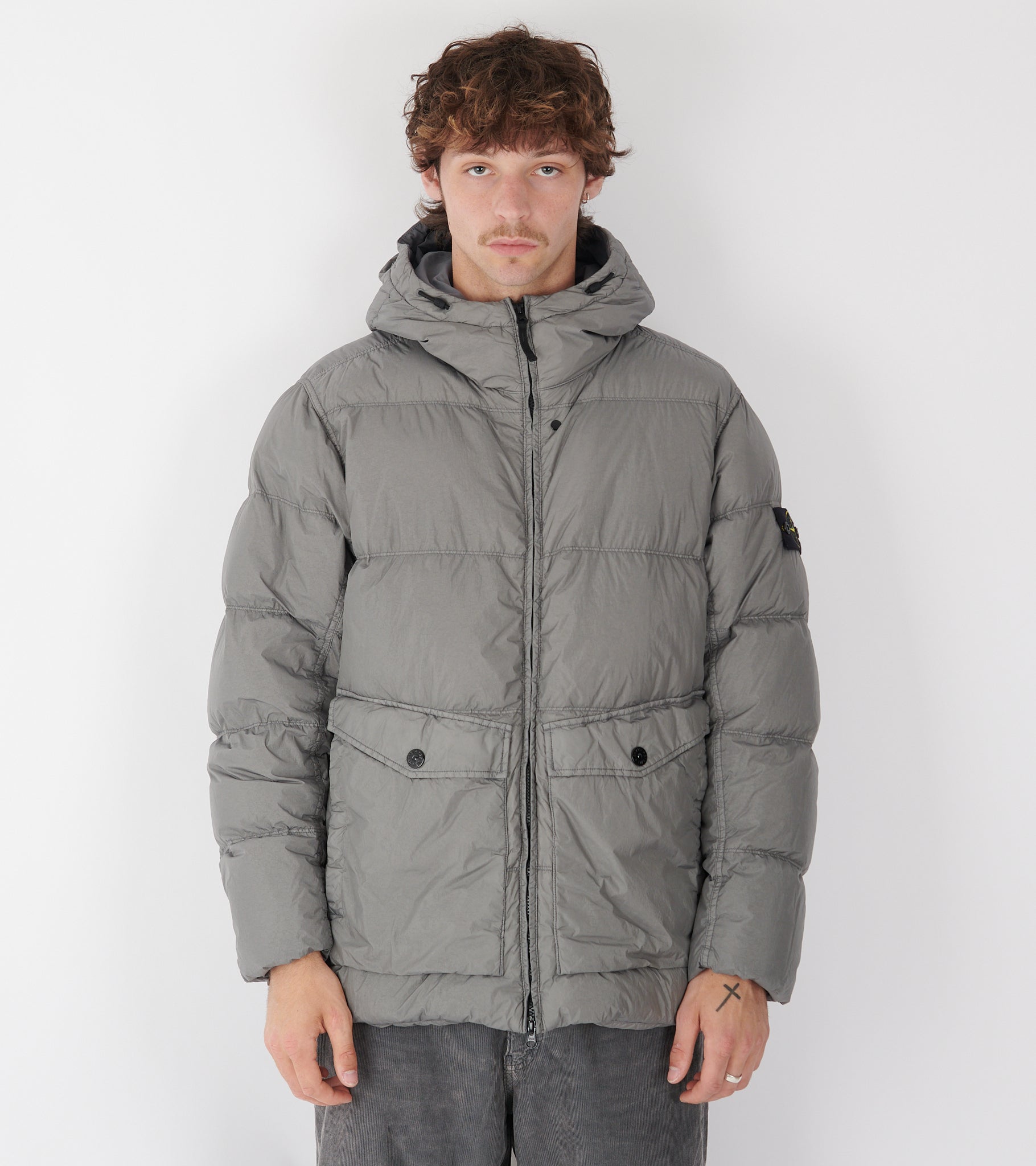 Grå dunjakke med hætte fra Stone Island. Denne jakke har det ikoniske Stone patch på venstre ærme. Jakken har to store lommer foran og lukkes med lynlås.