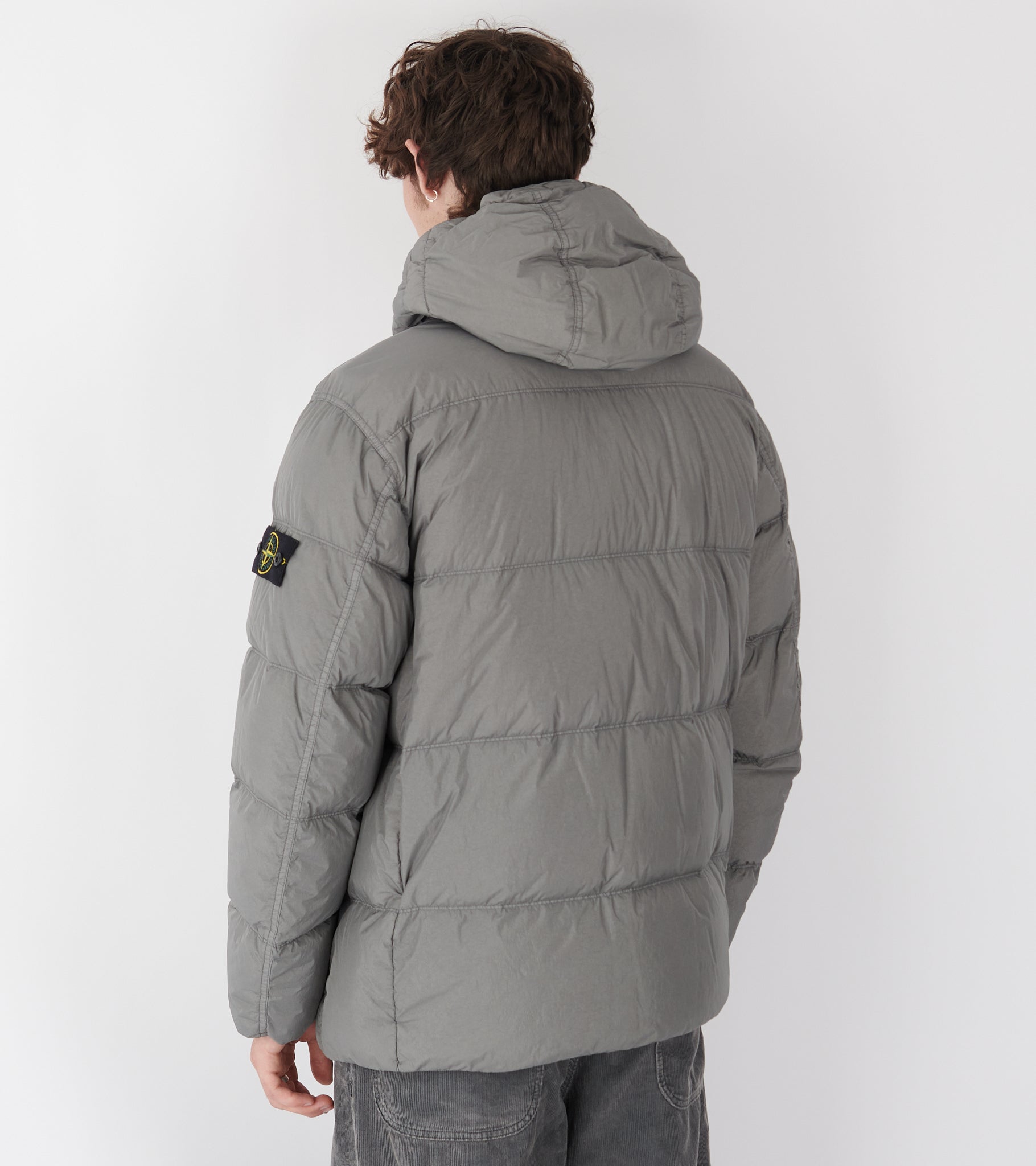 Grå dunjakke med hætte fra Stone Island.