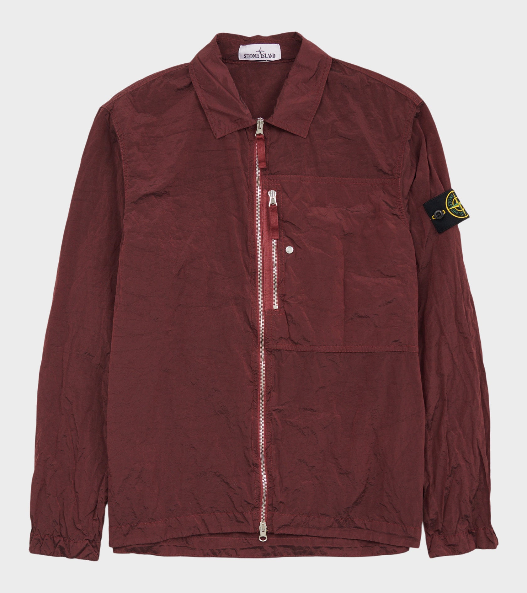 Bordeaux overshirt fra Stone Island. Denne overshirt er fremstillet i en let skinnende Econyl nylon kvalitet og har en klassisk krave, en dobbeltgående lynlåslukning samt en lynlåslomme ved venstre bryst. På venstre ærme er det ikoniske Stone Patch.