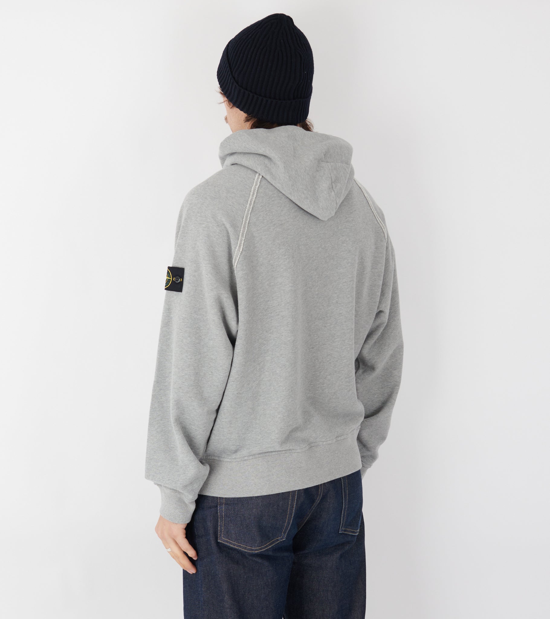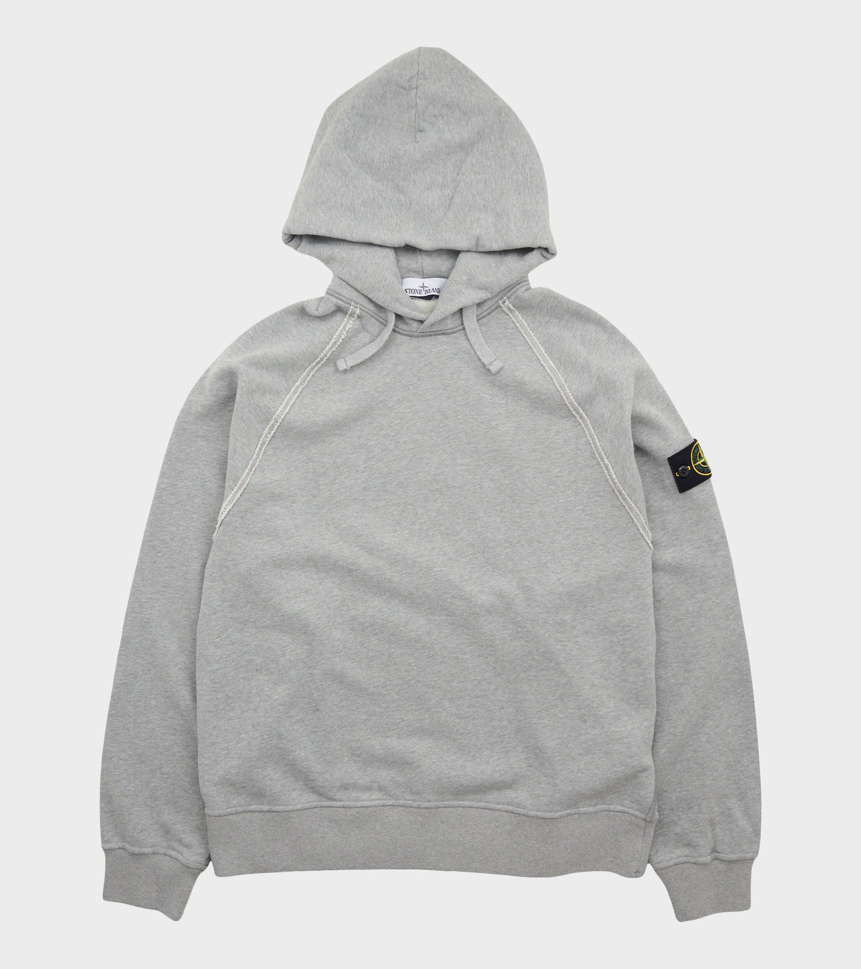 Grå hættetrøje fra Stone Island. Hættetrøjen har en klassisk hætte med snore og udvendige syninger. På venstre ærme er det ikoniske Stone Patch.