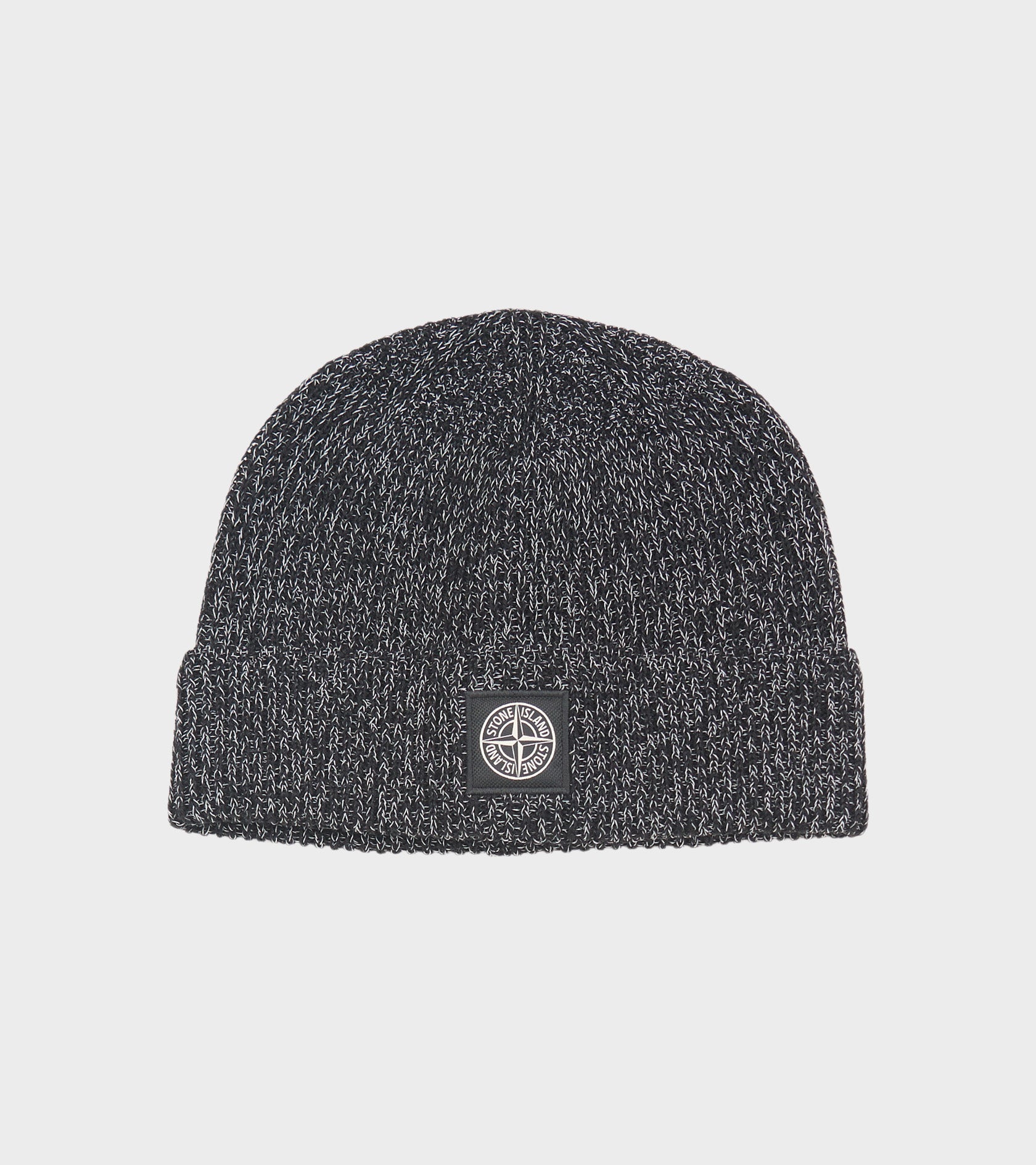 Sort meleret ribstrikket hue fra Stone Island. Denne hue har det ikoniske logo på fronten. Huen er fremstillet i en blanding af polyester, hør og uld med en 'reflective' coating, skabt gennem et harpiksbad, der indeholder tusindvis af glas-mikrokugler, som reflekterer lys.