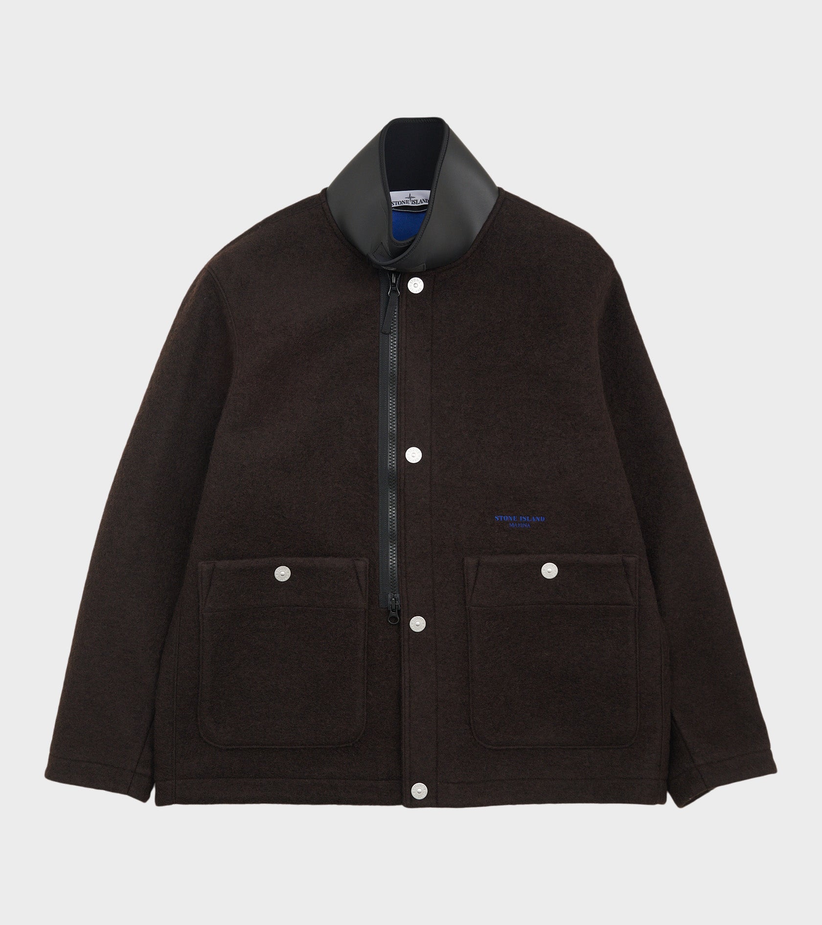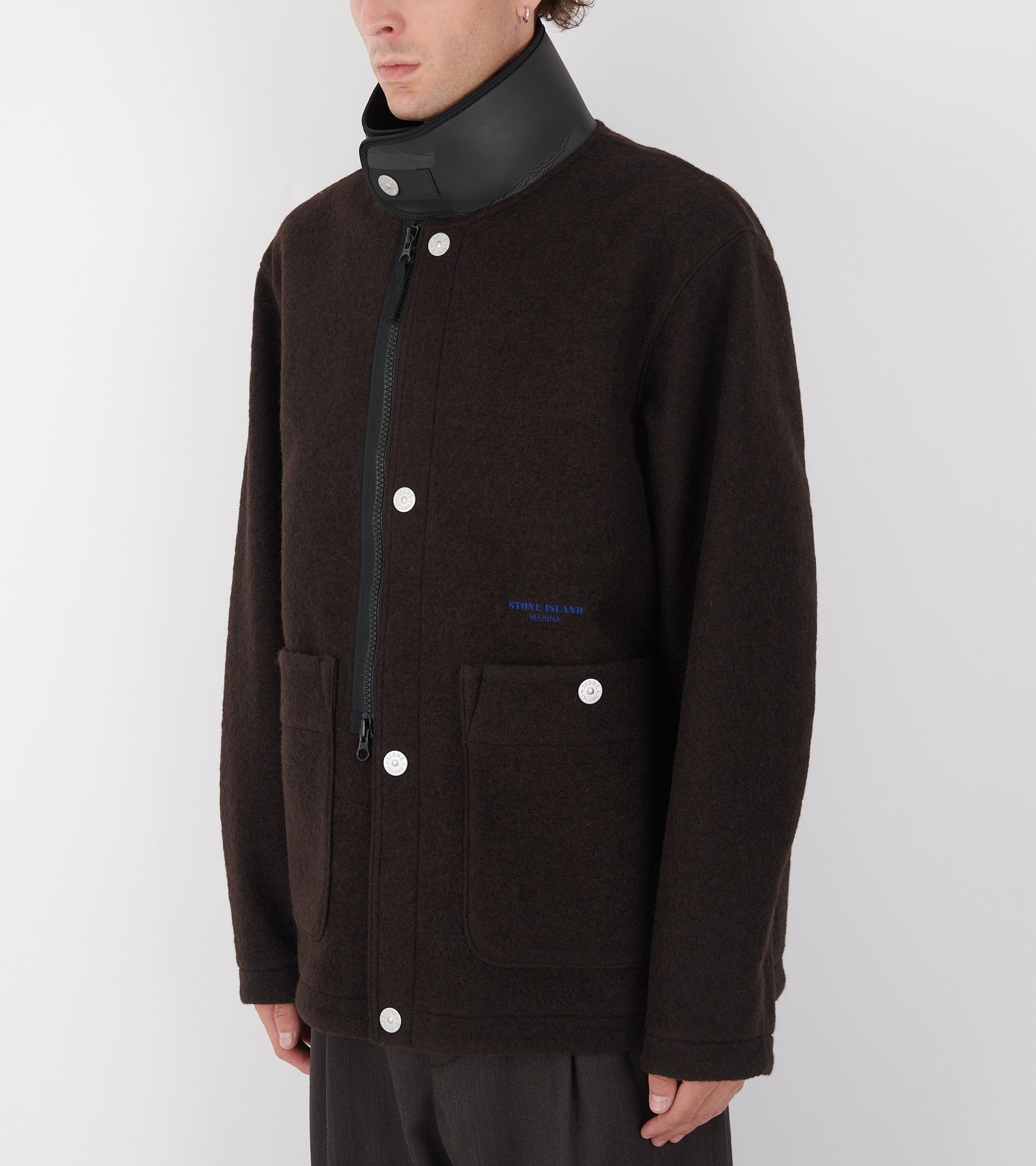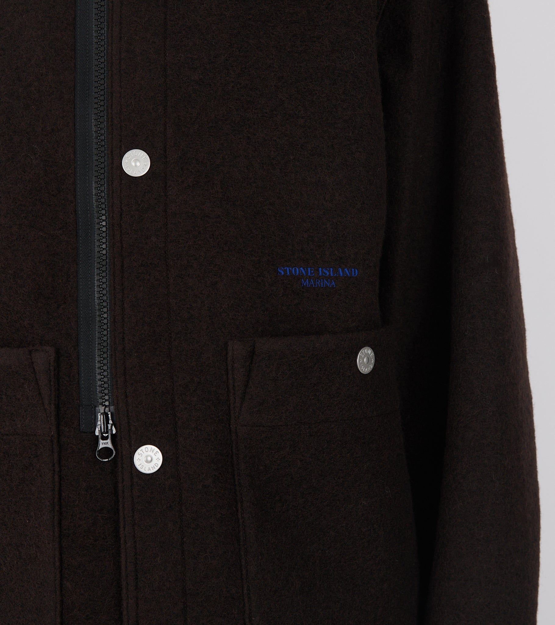 Brun jakke i uld fra Stone Island Marina. Jakken lukkes med en dobbeltgående lynlåslukning samt sølv logo-trykknapper. Den har to lommer på fronten samt en høj hals i sort neopren og gummi. Over den ene lomme er 'Stone Island Marina' broderet i blå. Jakken er foret med blåt tekstil.
