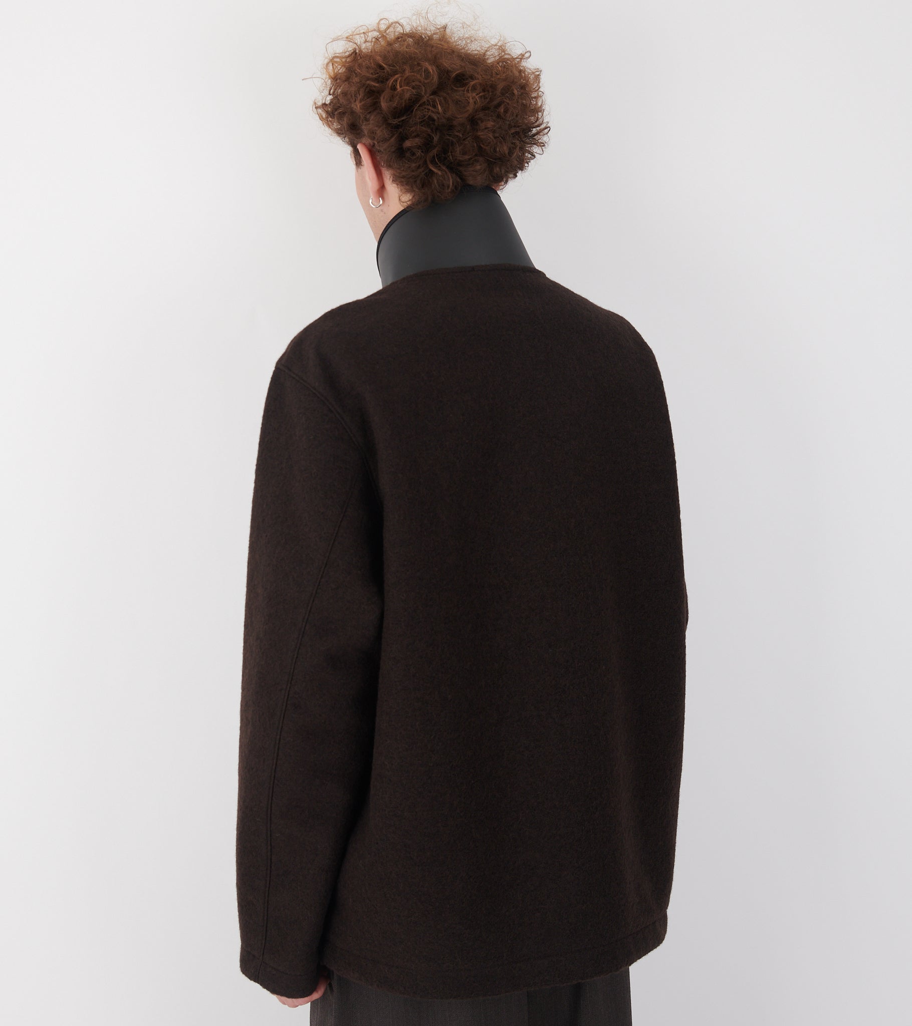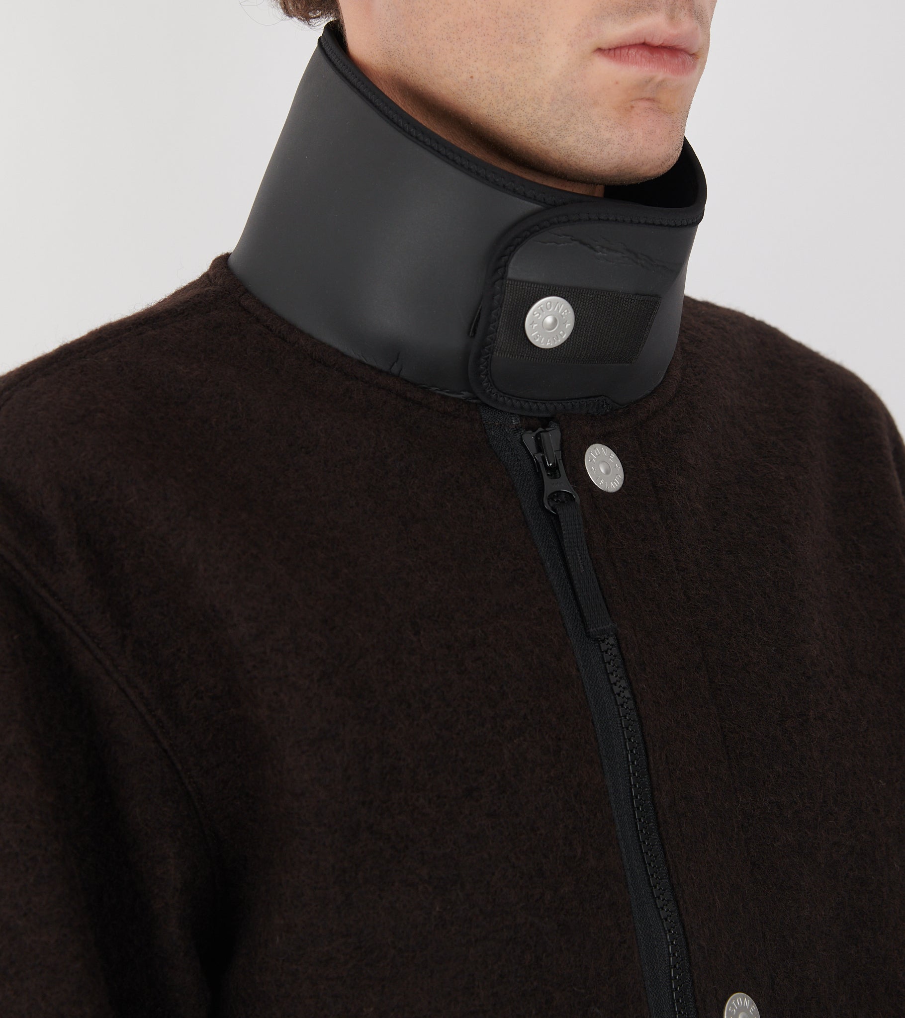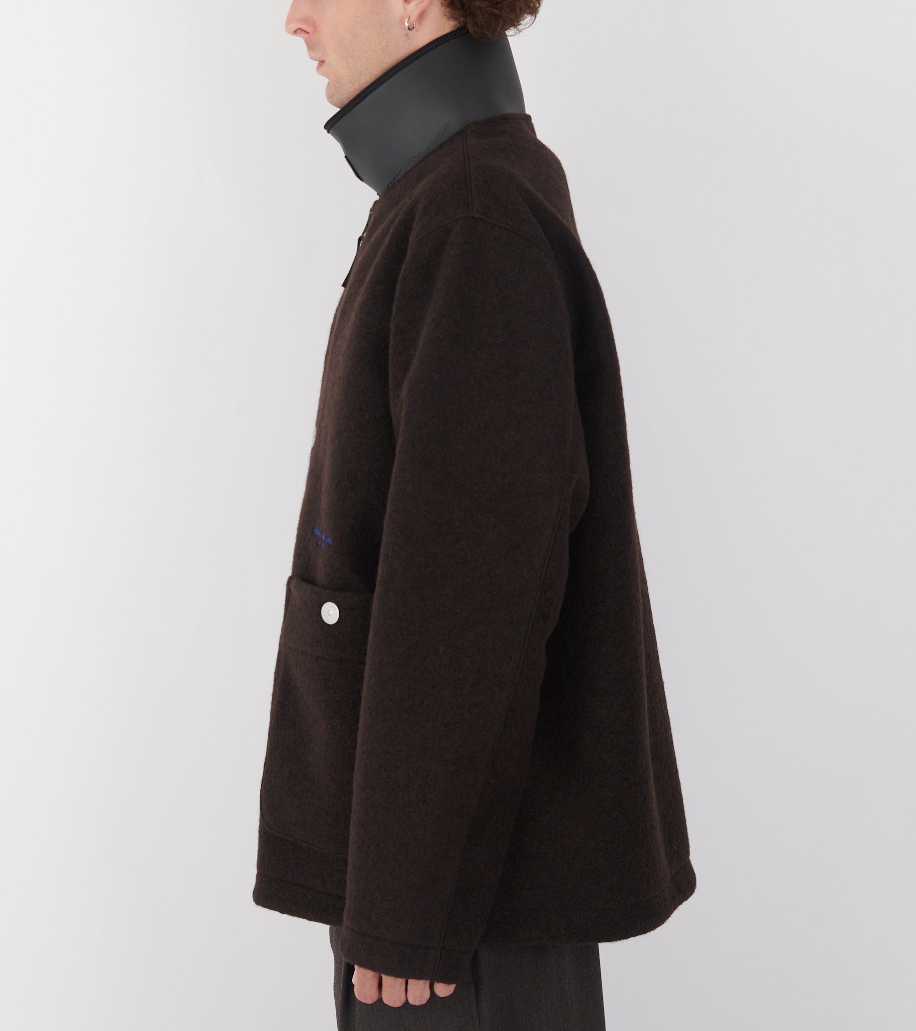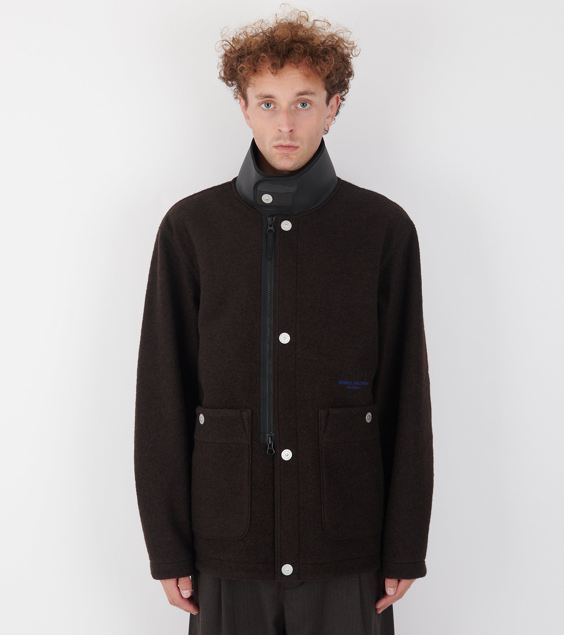Brun jakke i uld fra Stone Island Marina. Jakken lukkes med en dobbeltgående lynlåslukning samt sølv logo-trykknapper. Den har to lommer på fronten samt en høj hals i sort neopren og gummi. Over den ene lomme er 'Stone Island Marina' broderet i blå. Jakken er foret med blåt tekstil.