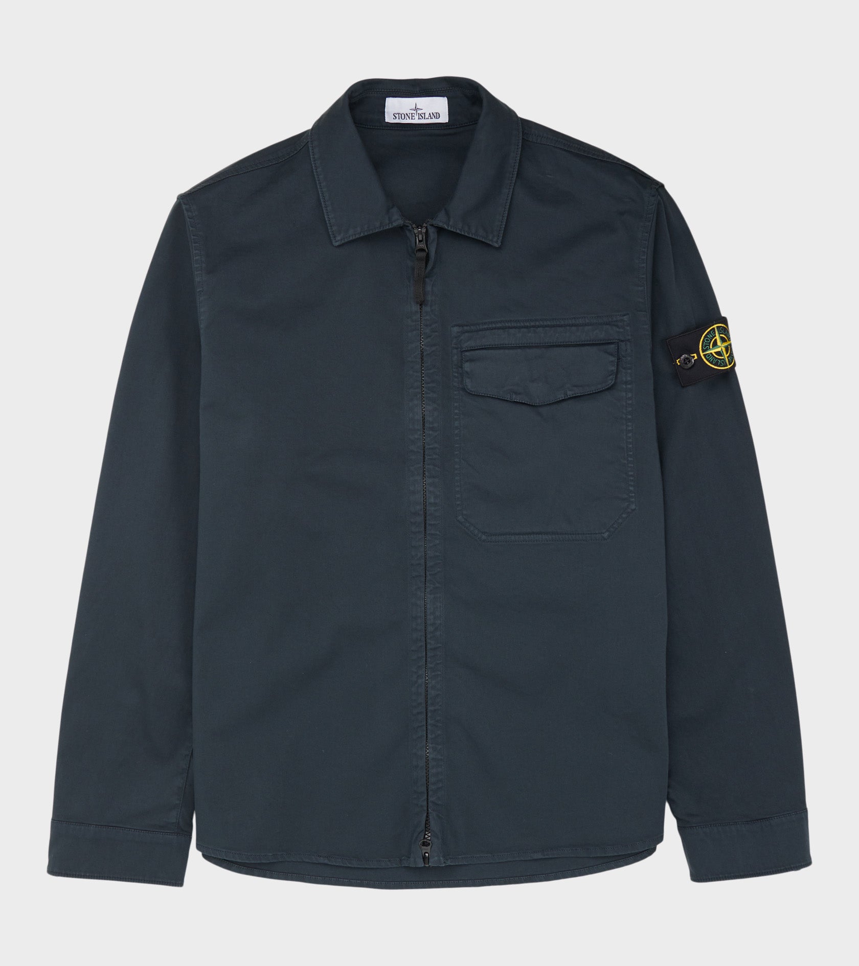 Navy overshirt i økologisk bomuld fra Stone Island. Denne overshirt har en klassisk krave, en dobbeltgående lynlåslukning samt en brystlomme. På venstre ærme er det ikoniske Stone Patch.