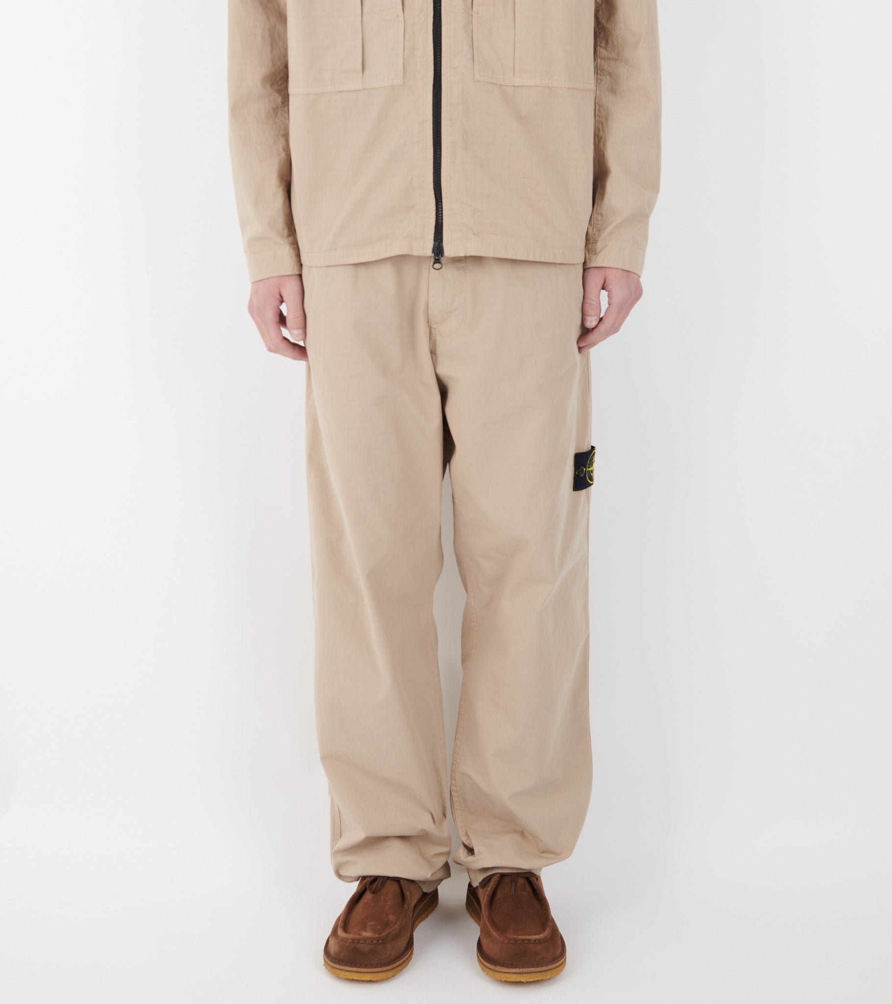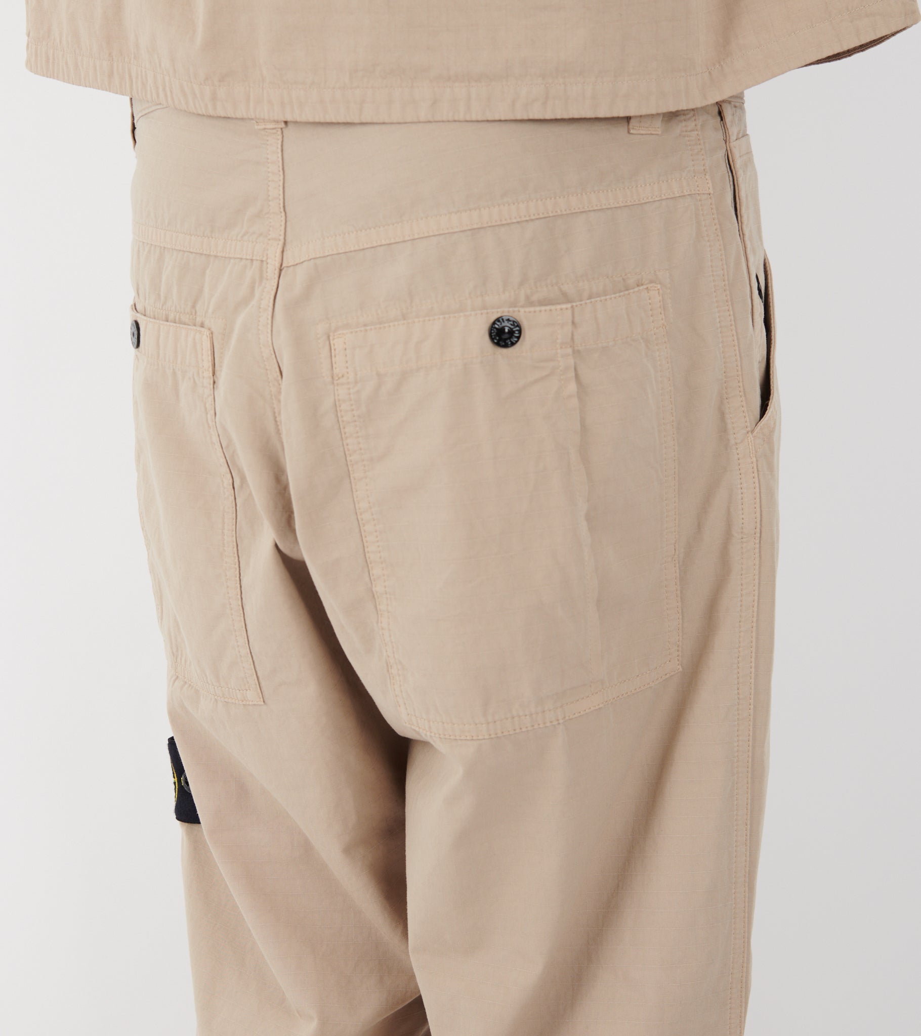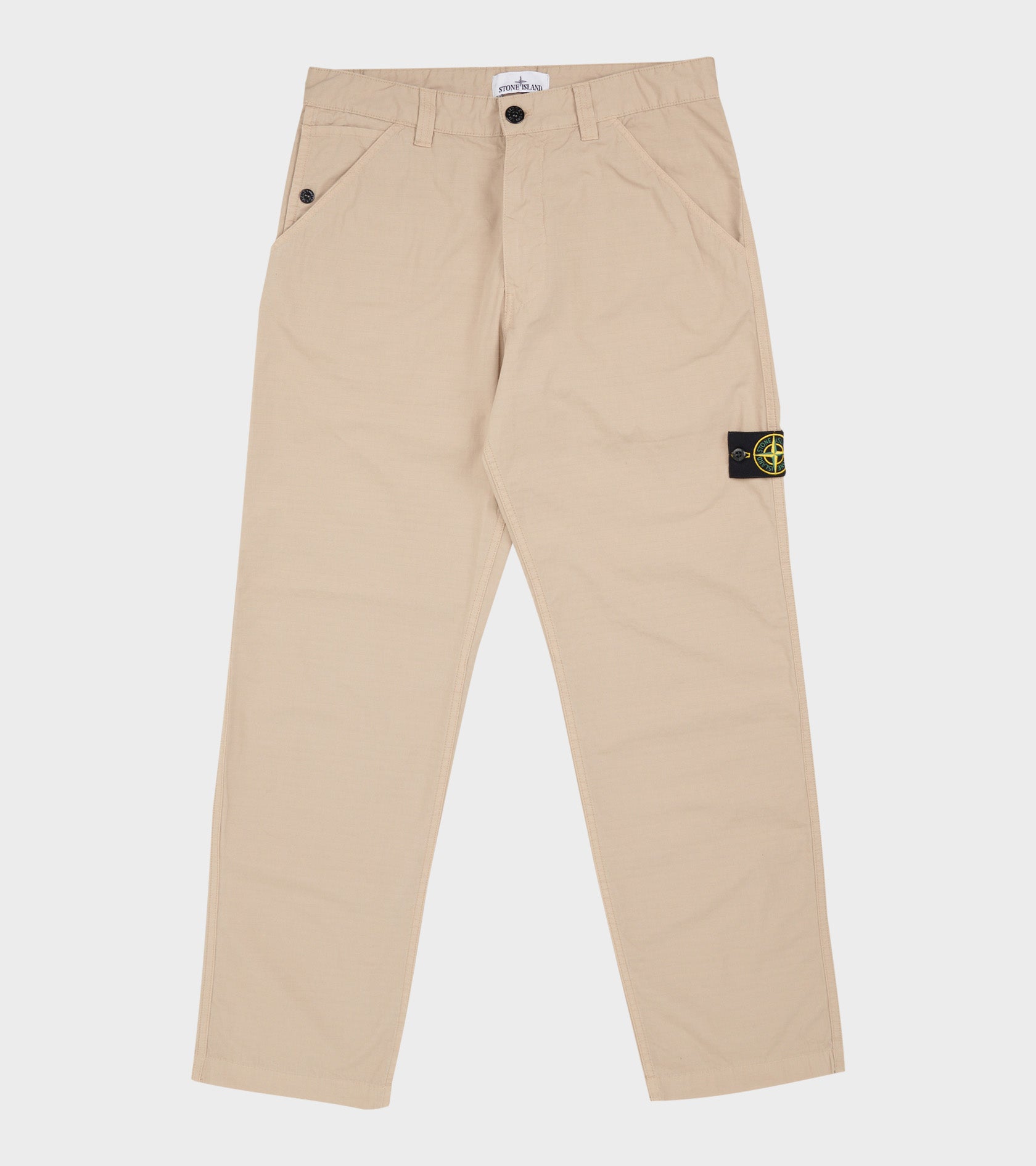 Beige bukser i økologisk bomulds-ripstop fra Stone Island. Bukserne har bæltestropper, en skrålomme i hver side samt to baglommer. På venstre ben er det ikoniske Stone Patch.