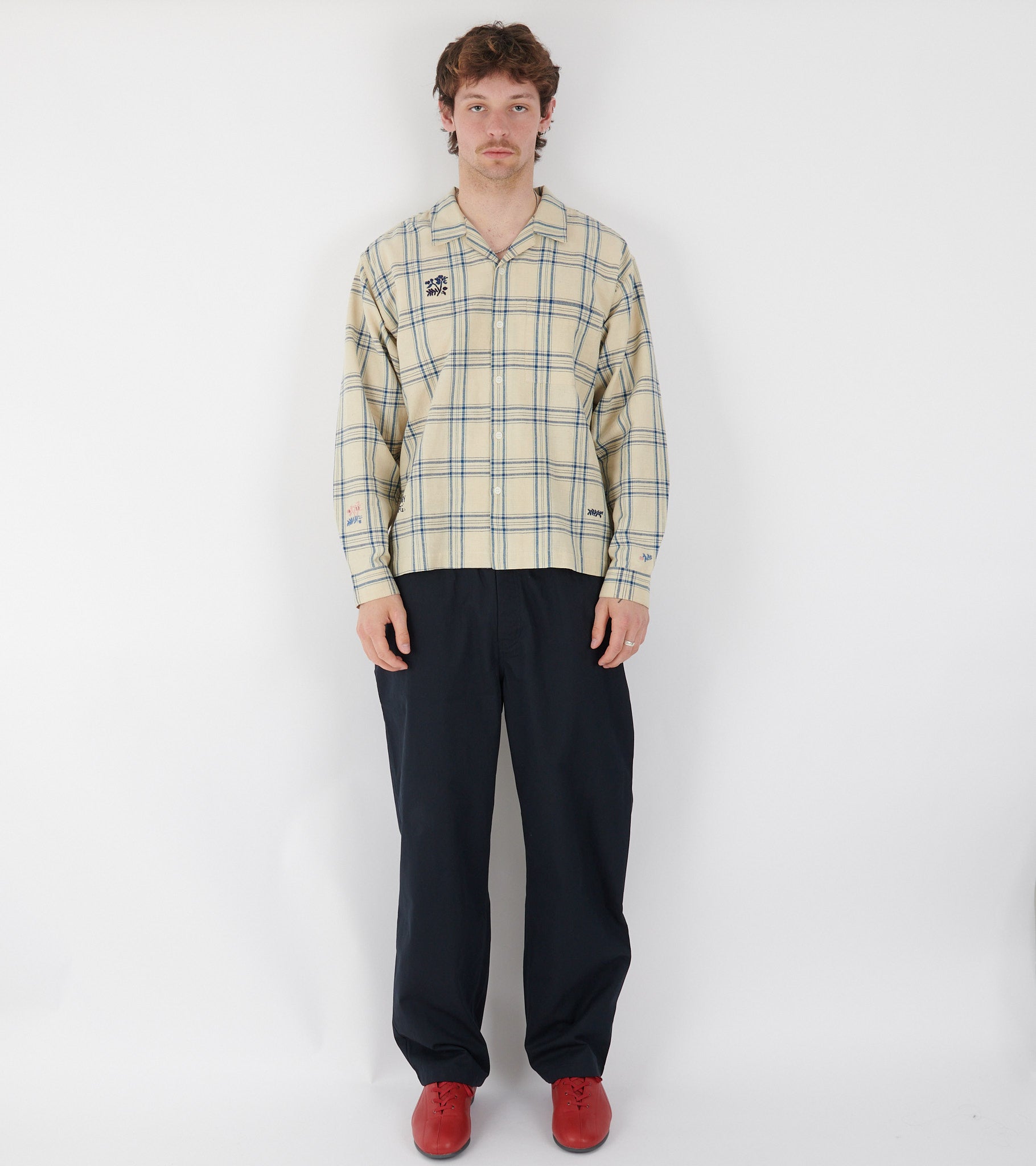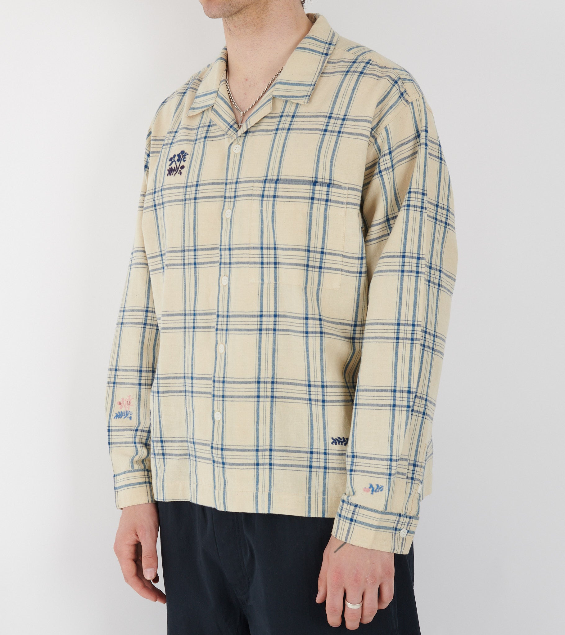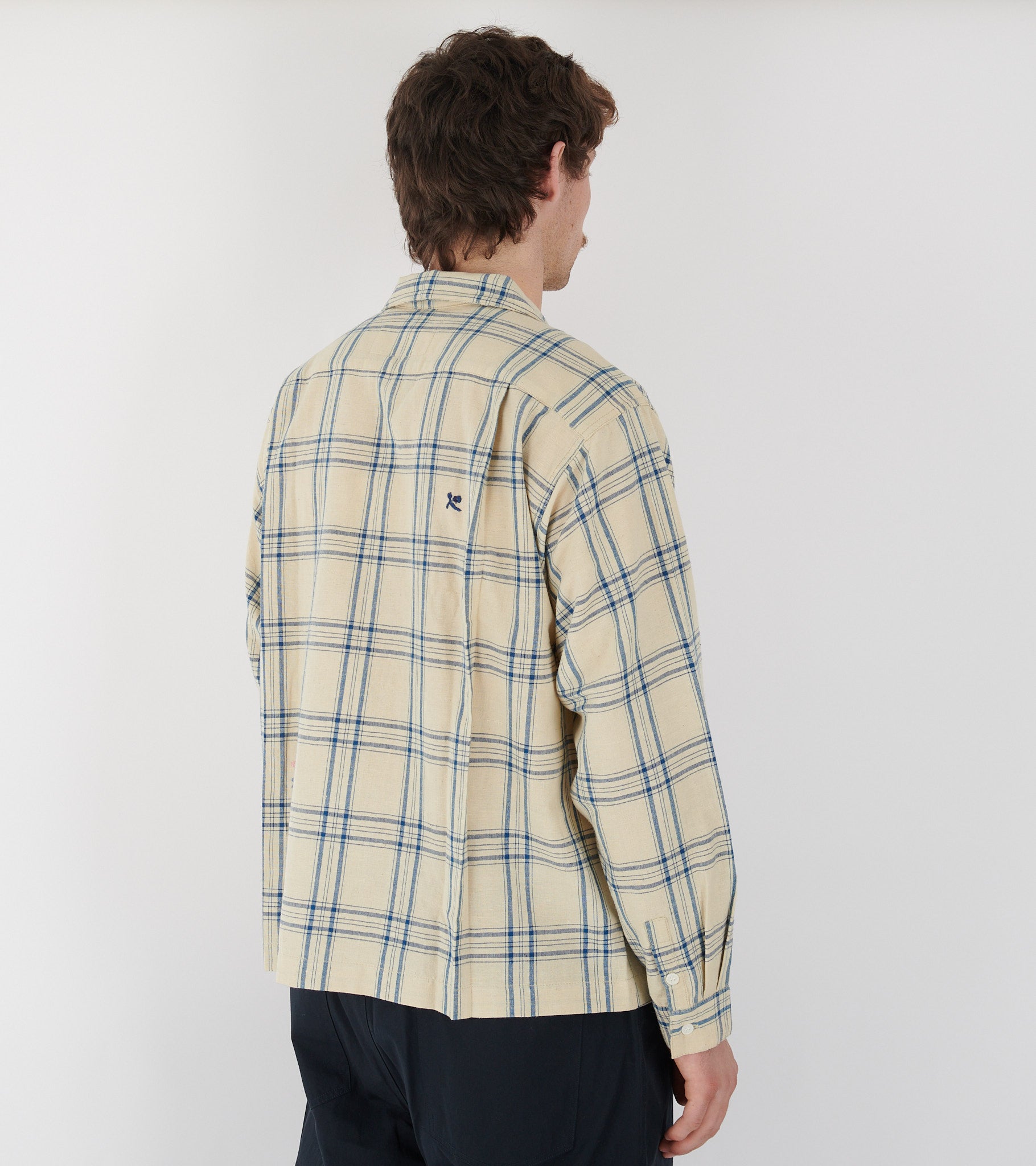 Råhvid skjorte med blåt tern fra Story mfg. Denne skjorte har et broderet logo samt broderede illustrationer. Skjorten har en åben krave, en brystlomme samt en knaplukning på fronten. Den er fremstillet i en let kraftig blanding af bomuld og naturlig hamp.