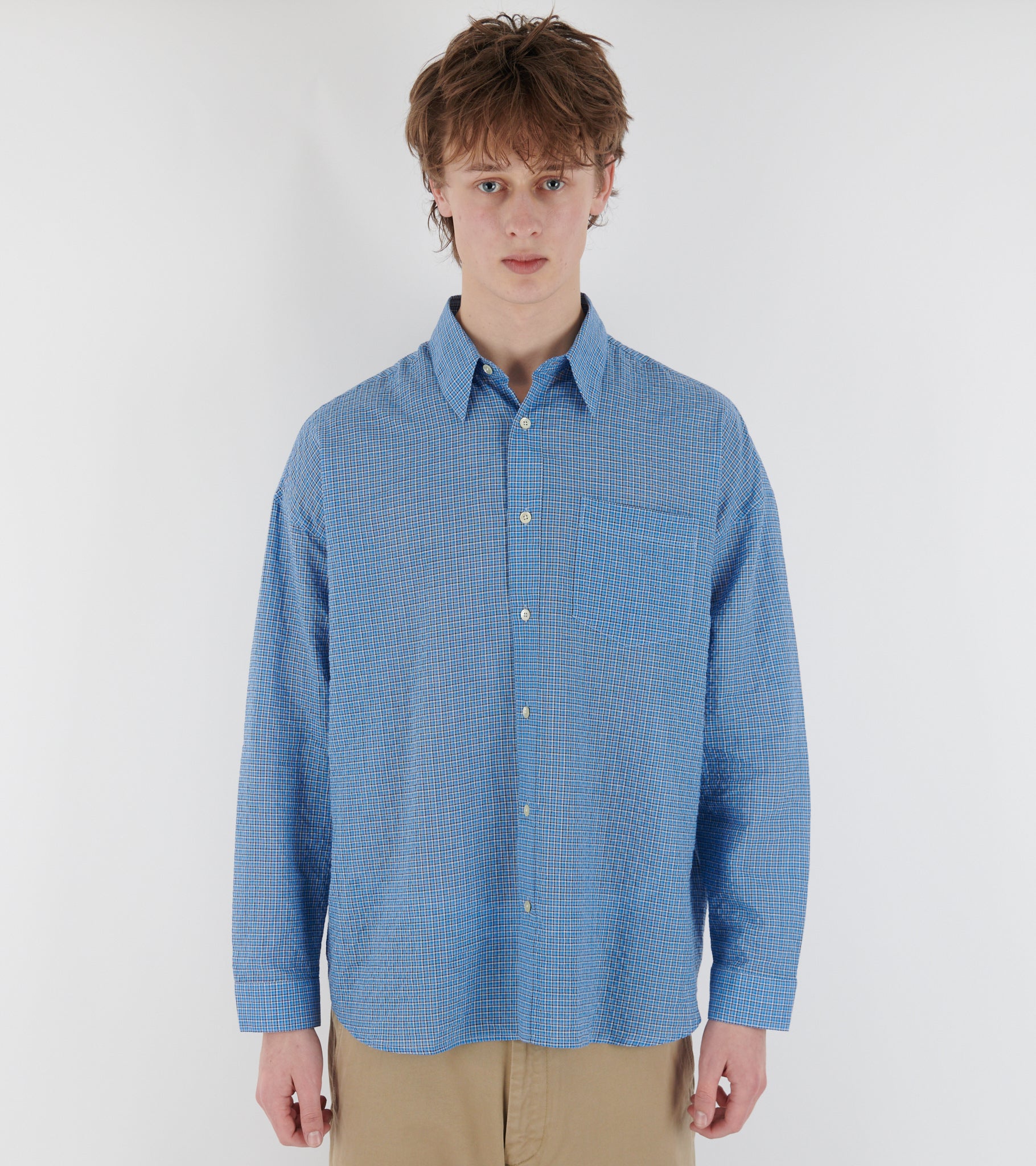Ternet blå skjorte fra Sunflower. Stable Shirt 210 Blue er fremstillet i en italiensk lightweight 'seersucker' bomuldskvalitet og har en klassisk krave, en brystlomme og en knaplukning med perlemorsknapper på fronten.