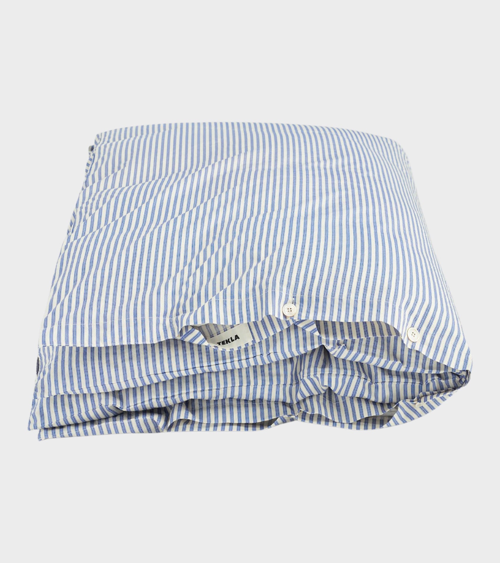 Dynebetræk i farven 'Skagen Stripes' fra Tekla. Betrækket er lavet af lange bomuldfibre med et højt antal tråde. Det høje antal tråde gør betrækket modstandsdygtigt og holdbart. Betrækket er blevet behandlet med en stenvask som giver en blød fornemmelse og et mat finish.