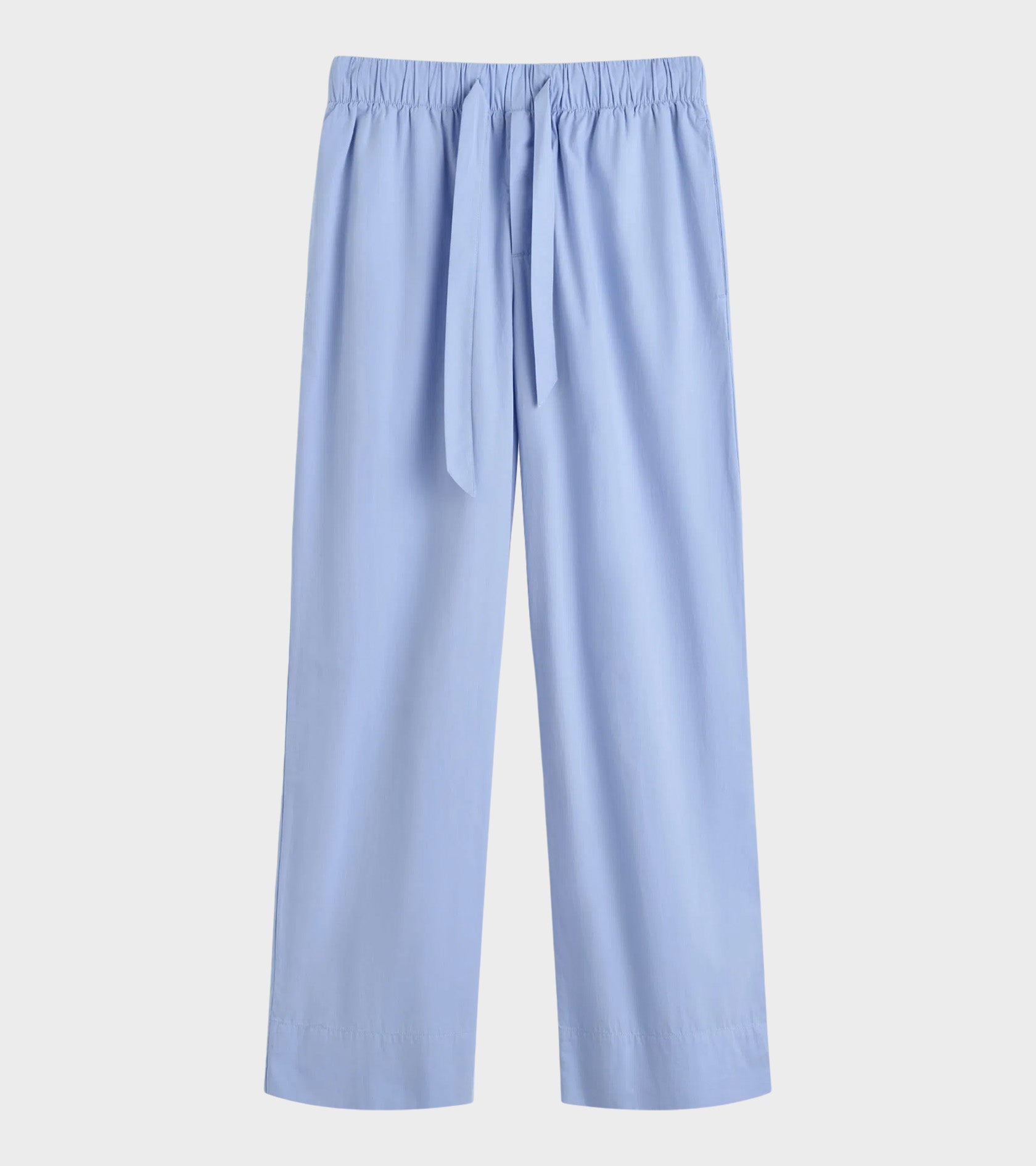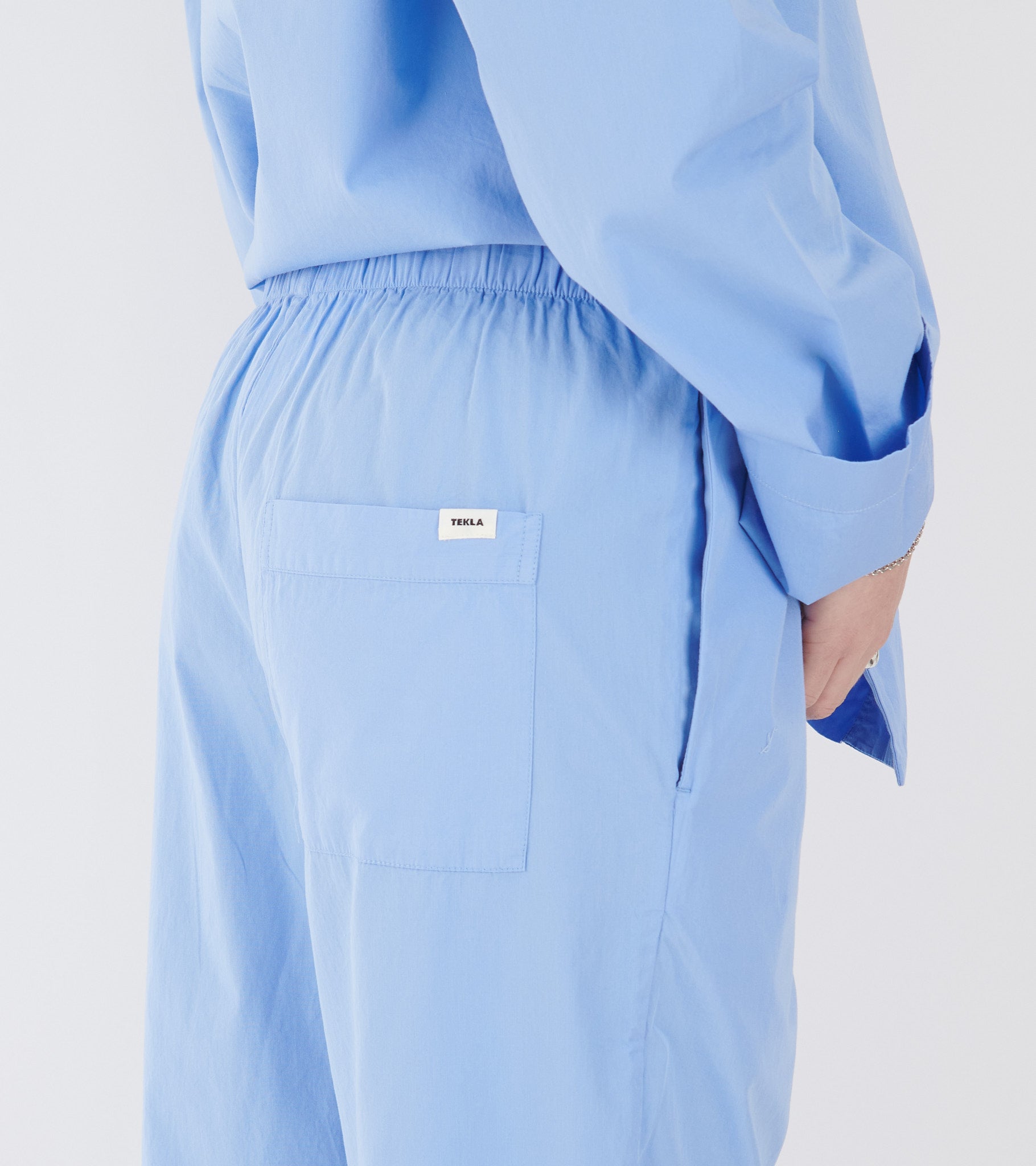 Unisex sleepwear fra Tekla i farven 'Cornflower Blue'. Alt sleepwear er lavet i økologisk bomuld og blevet produceret i Portugal. Bukserne har elastik i livet med snøre og lommer i siderne samt bagpå. På baglommen er et logotag.
