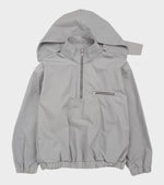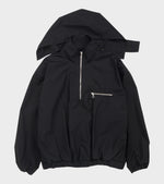 Sort jakke i vandafvisende bomuld fra RIER. Jakken har en høj hals, sølv hardware, en half-zip lynlåslukning og en lynlåslomme ved venstre bryst. Den har en diskret lomme i hver side, en aftagelig hætte samt indvendige justerbare snore i bunden, så den kan justeres i vidden. Jakken er produceret i Italien og har en afslappet pasform.